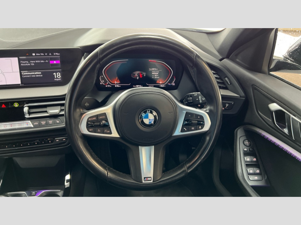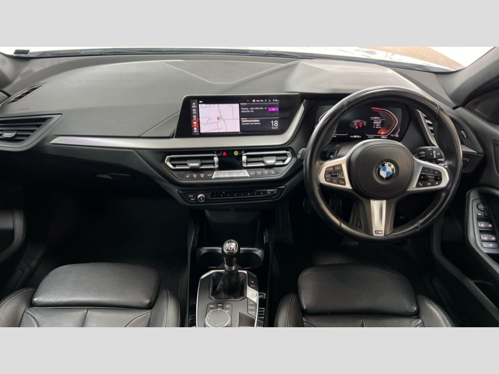 BMW 1 Series 118i [136] M Sport 5dr Active guard plus, Attentiveness assist, BMW Online services, BMW Teleservices, Check Control warning system for monitoring of lights and door/luggage compartment open warning, Connected eDrive Services, Cruise control with brake assist, Eco pro mode, Integrated owners handbook, Lane departure warning system, Oil sensor for level and grade, On board computer, Optimum shift indicator, Personal Profile, Pull away assistant, Speed limiter, 6 speed manual transmission, Aluminium lightweight construction, Anti roll bar front and rear, Balancer shaft, Double VANOS, Drive Performance Control, Electronic differential lock, High precision injection, M sport suspension, Petrol Particulate Filter, VALVETRONIC engine management, Bluetooth audio streaming, DAB Digital radio, Auto dimming rear view mirror, Automatic headlight beam throw control, Automatic windscreen wipers and automatic headlight, Body colour door handles, Body colour mirror caps, Chrome 'M' logo side designation, Chrome exhaust tailpipe in single, round (Exhaust tailpipe, stainless steel - single, round), Chrome kidney grille frame with Satin Aluminium struts, Direction indicator side lights in exterior mirrors, Electric folding and anti dazzle exterior mirrors, Fading support, Follow me home headlights, Front and rear bumper system with replaceable deformation elements, Front and rear electric windows with open and close fingertip control, anti trap facility and comfort closing, Front door sill finishers in black plastic with M designation in metallic look, Green tinted heat protection glazing, Heated, electrically adjustable exterior mirror aspheric on driver side, convex on passenger side, High gloss shadowline window frame, Recess cover mirror frames and B/C pillar embelisher trim, High level third brake light, LED daytime running lights, LED eyebrow turn indicators, LED front fog lights, Lightweight engineering, Matt black air guide grilles, Model designation on right side of tailgate, Nearside reverse light in rear light cluster, Preparation for high beam assistant, Rain sensor including auto headlights activation, Rear fog lights, Rear window wiper, Shark fin antenna, Visible VIN plate, Welcome lighting, 12V power socket in centre console, 3 rear seat head restraints, 3 spoke M sports design leather steering wheel finished in nappa leather with specific M badge, Anthracite headlining, Anthracite Velour floor mats, Child seat ISOFIX attachment for two outer rear seats and front passenger seat with anchorage points, Conditioned based service, Dakota leather upholstery with perforation and contrast stitching, Driver and front passenger seat heating, Folding rear clothes hook, Four grab handles integrated in roof lining, Front and rear door pockets, Front and rear door pockets with bottle holders, Front and rear side armrest integrated into door trim, Front armrest foldable with integrated storage compartment, Front sports seats with electric side bolster adjustment, Gearshift lever with M designation, Glove compartment, Height adjustable front head restraints, Manual adjust steering wheel, Multi-function controls for steering wheel, Storage compartment in centre console, Sun visors with vanity mirrors and insert tab, Two zone automatic air conditioning, Additional interior lighting pack - 1 Series, Connected pack professional - 1 Series, Extended storage pack - 1 Series, Interior lights pack - 1 Series, Luggage compartment pack - 1 Series, M Sport exterior styling aerodynamics pack - 1 Series, 2 tone horn, 3 point seatbelts on all seats, front pyrotechnic belt tensioners, stopper and belt force limiters, rear coded belt buckles, Airbags - front driver/passenger, front & rear curtain, front side, Anti lock braking system (ABS) with brake assist, BMW emergency call, Brake drying, Braking readiness, City braking function, Crash sensor activating central locking release, hazard warning lights, fuel cut off, interior lighting + activation of safety battery terminal clamp, Driver and front passenger seat belt security check, Dynamic stability control + (DSC+), Dynamic Traction Control - DTC, Electrically operated hand brake, Front and rear disc brakes, Front passenger manual airbag deactivation, Seatbelt warning, Side impact protection, Tyre pressure monitoring system, Warning triangle and first aid kit, Automatic drive away locking facility, Central locking switch for all doors, fuel filler cap and luggage compartment, Deadlocking function system to all doors, Locking wheel bolts, Remote control with integrated key with High-gloss Black inlay and M designation and 1 button for open/ close lock, window, open luggage compartment, Start/stop button with comfort go keyless engine start and auto start stop deactivation button, Thatcham Cat.1 alarm and immobiliser, Contrast stitching on instrument panel, Reduced rolling resistance tyres