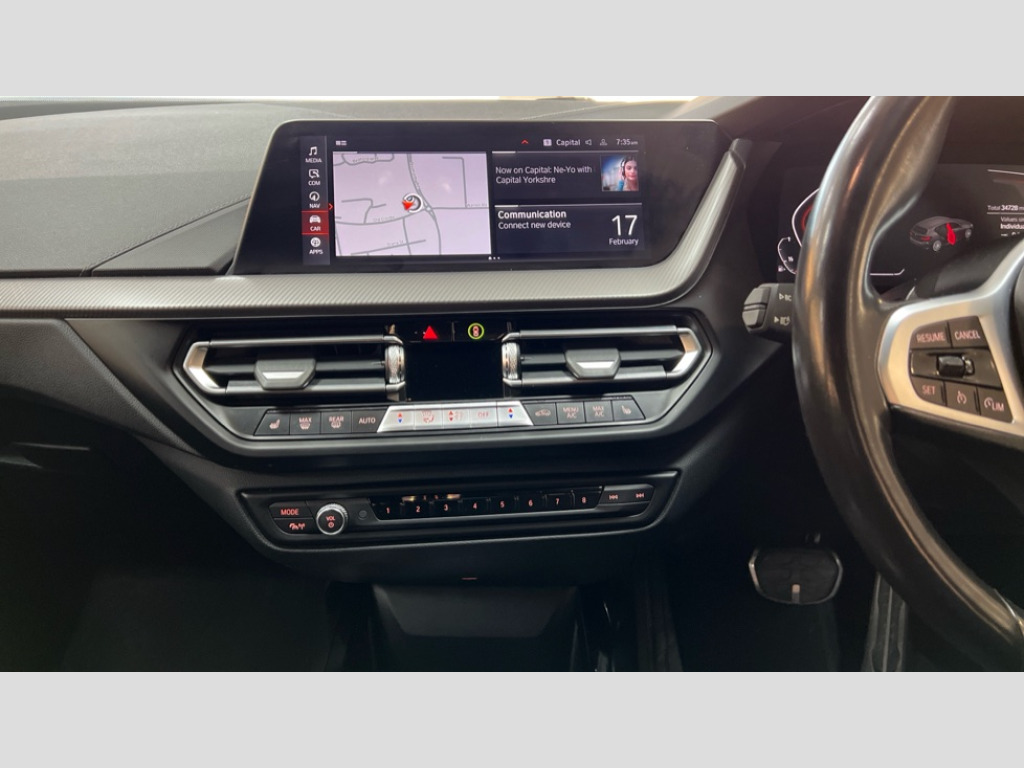 BMW 1 Series 118i [136] M Sport 5dr Step Auto Active guard plus, Attentiveness assist, BMW Online services, BMW Teleservices, Check Control warning system for monitoring of lights and door/luggage compartment open warning, Connected eDrive Services, Eco pro mode, Integrated owners handbook, Oil sensor for level and grade, On board computer, Optimum shift indicator, Personal Profile, Pull away assistant, Speed limiter, Aluminium lightweight construction, Anti roll bar front and rear, Balancer shaft, Double VANOS, Drive Performance Control, Electronic differential lock, High precision injection, M sport suspension, Petrol Particulate Filter, VALVETRONIC engine management, Bluetooth audio streaming, DAB Digital radio, Auto dimming rear view mirror, Automatic headlight beam throw control, Automatic windscreen wipers and automatic headlight, Body colour door handles, Body colour mirror caps, Chrome 'M' logo side designation, Chrome exhaust tailpipe in single, round (Exhaust tailpipe, stainless steel - single, round), Chrome kidney grille frame with Satin Aluminium struts, Direction indicator side lights in exterior mirrors, Electric folding and anti dazzle exterior mirrors, Fading support, Follow me home headlights, Front and rear bumper system with replaceable deformation elements, Front and rear electric windows with open and close fingertip control, anti trap facility and comfort closing, Front door sill finishers in black plastic with M designation in metallic look, Green tinted heat protection glazing, Heated, electrically adjustable exterior mirror aspheric on driver side, convex on passenger side, High gloss shadowline window frame, Recess cover mirror frames and B/C pillar embelisher trim, High level third brake light, LED daytime running lights, LED eyebrow turn indicators, LED front fog lights, Lightweight engineering, Matt black air guide grilles, Model designation on right side of tailgate, Nearside reverse light in rear light cluster, Preparation for high beam assistant, Rain sensor including auto headlights activation, Rear fog lights, Rear window wiper, Shark fin antenna, Visible VIN plate, Welcome lighting, 12V power socket in centre console, 3 rear seat head restraints, 3 spoke M sports design leather steering wheel finished in nappa leather with specific M badge, Anthracite headlining, Anthracite Velour floor mats, Child seat ISOFIX attachment for two outer rear seats and front passenger seat with anchorage points, Conditioned based service, Dakota leather upholstery with perforation and contrast stitching, Driver and front passenger seat heating, Folding rear clothes hook, Four grab handles integrated in roof lining, Front and rear door pockets, Front and rear door pockets with bottle holders, Front and rear side armrest integrated into door trim, Front armrest foldable with integrated storage compartment, Front sports seats with electric side bolster adjustment, Glove compartment, Height adjustable front head restraints, Manual adjust steering wheel, Multi-function controls for steering wheel, Storage compartment in centre console, Sun visors with vanity mirrors and insert tab, Two zone automatic air conditioning, Additional interior lighting pack - 1 Series, Connected pack professional - 1 Series, Extended storage pack - 1 Series, Interior lights pack - 1 Series, Luggage compartment pack - 1 Series, M Sport exterior styling aerodynamics pack - 1 Series, 2 tone horn, 3 point seatbelts on all seats, front pyrotechnic belt tensioners, stopper and belt force limiters, rear coded belt buckles, Airbags - front driver/passenger, front & rear curtain, front side, Anti lock braking system (ABS) with brake assist, BMW emergency call, Brake drying, Braking readiness, Crash sensor activating central locking release, hazard warning lights, fuel cut off, interior lighting + activation of safety battery terminal clamp, Driver and front passenger seat belt security check, Dynamic stability control + (DSC+), Dynamic Traction Control - DTC, Electrically operated hand brake, Front and rear disc brakes, Front passenger manual airbag deactivation, Seatbelt warning, Side impact protection, Tyre pressure monitoring system, Warning triangle and first aid kit, Automatic drive away locking facility, Central locking switch for all doors, fuel filler cap and luggage compartment, Deadlocking function system to all doors, Locking wheel bolts, Remote control with integrated key with High-gloss Black inlay and M designation and 1 button for open/ close lock, window, open luggage compartment, Start/stop button with comfort go keyless engine start and auto start stop deactivation button, Thatcham Cat.1 alarm and immobiliser, Contrast stitching on instrument panel, Reduced rolling resistance tyres