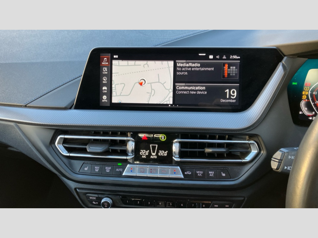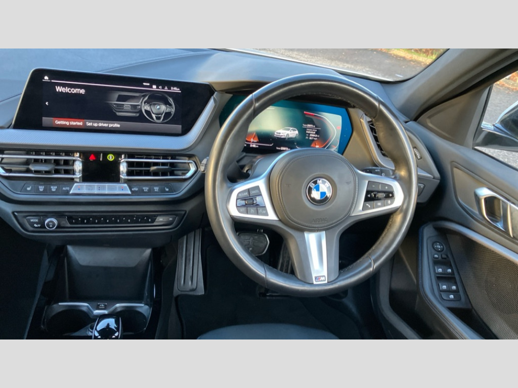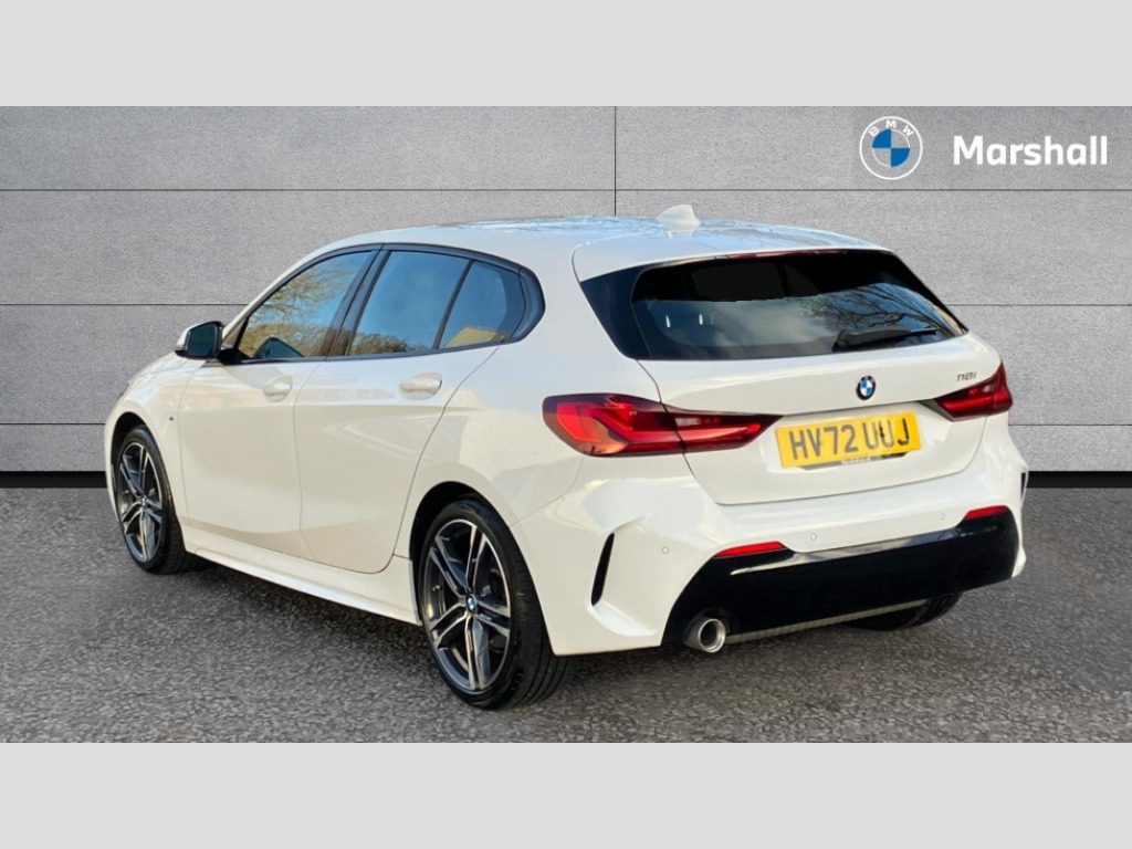 BMW 1 Series 118i [136] M Sport 5dr Step Auto [LCP] Active guard plus, Attentiveness assist, BMW ConnectedDrive online services, BMW Teleservices, Check Control warning system for monitoring of lights and door/luggage compartment open warning, Cruise control with brake assist, Eco pro mode, Front axle single joint with specific axle kinematics to minimise drive influences on steering + provide increased rigidity agile driving behaviour, Integrated owners handbook, Lane departure warning system, Oil sensor for level and grade, On board computer, Optimum shift indicator, Personal Profile, Pull away assistant, Rigidly mounted rear subframe - Multi link construction with separate spring / damper configuration and excellent driving characteristics, Speed limit Info including no-overtaking indicator, Speed limiter, Aluminium lightweight construction, Anti roll bar front and rear, Balancer shaft, Double VANOS twin scroll turbocharging system, Drive Performance Control, Electronic differential lock, High precision injection, M sport suspension, Petrol Particulate Filter, Twin tube gas filled shock absorbers with degressive characteristic curve, VALVETRONIC engine management, DAB Digital radio, Auto dimming rear view mirror, Automatic headlight beam throw control, Automatic windscreen wipers and automatic headlight, Body colour door handles, Body colour mirror caps, Body colour roof trims, Chrome 'M' logo side designation, Chrome exhaust twin tailpipes round 90mm in left, Chrome kidney grille frame with Satin Aluminium struts, Direction indicator side lights in exterior mirrors, Fading support, Folding side mirrors with auto dimming/folding wing mirrors with auto dimming, Follow me home headlights, Front and rear bumper system with replaceable deformation elements, Front and rear electric windows with open and close fingertip control, anti trap facility and comfort closing, Front door sill finishers in black plastic with M designation in metallic look, Green tinted heat protection glazing, Heated, electrically adjustable exterior mirror aspheric on driver side, convex on passenger side, High gloss shadowline window frame, Recess cover mirror frames and B/C pillar embelisher trim, High level third brake light, Integrated front windscreen with washer jets, LED daytime running lights, LED eyebrow turn indicators, LED front fog lights, Lightweight engineering, Matt black air guide grilles, Matt black wheel arch trim, Model designation on electric bootlid, Nearside reverse light in rear light cluster, Preparation for high beam assistant, Rear fog lights, Rear side wing doors, Rear window wiper, Shark fin antenna, Trailer stabilisation logic, Visible VIN plate, Welcome lighting, 12V power socket in front centre console with blanking plug, 3 rear seat head restraints, 3 seat bench in 2nd row, 3 spoke sports leather steering wheel with black leather and stitching, pearl chrome decorative finish, specific M Badge, Anthracite headlining, Black boot net with lashing eyes, Cargo function on 2nd seat row, Child seat ISOFIX attachment for two outer rear seats and front passenger seat with anchorage points, Conditioned based service, Driver and front passenger seat heating, Folding rear clothes hook, Four grab handles integrated in roof lining, Front and rear door pockets with bottle holders, Front and rear side armrest integrated into door trim, Front armrest, Front sports seats, Glove compartment, Height adjustable front head restraints, Luggage compartment for bag hooks on left and right, foldable luggage compartment liner and four lashing eyelets, Manual adjust steering wheel, Multi-function controls for steering wheel, Single front passenger seat, Storage compartment in centre console, Sun visors with vanity mirrors and insert tab, Two front centre console cupholders, Two zone automatic air conditioning, Velour floor mats, Additional interior lighting pack - 1 Series, BMW live cockpit professional pack- 1 Series, Connected pack professional - 1 Series, Interior lights pack - 1 Series, M Sport exterior styling aerodynamics pack - 1 Series, 2 tone horn, 3 point seatbelts on all seats, front pyrotechnic belt tensioners, stopper and belt force limiters, rear coded belt buckles, Airbags - Front driver/passenger, front and rear curtain head protection, front side, manual deactivation of front passenger airbag, Anti lock braking system (ABS) with brake assist, BMW emergency call, Brake drying, Braking readiness, Child proof locking system in rear door, City braking function, Comfort modes, Cornering brake control, Crash sensor activating central locking release, hazard warning lights, fuel cut off, interior lighting + activation of safety battery terminal clamp, Driver and front passenger seat belt security check, Dynamic stability control + (DSC+), Dynamic Traction Control - DTC, Electrically operated hand brake including automatic hold function, Front and rear disc brakes, Seatbelt warning, Side impact protection, Tyre pressure monitoring system, Warning triangle and first aid kit, Central locking switch for all doors, fuel filler cap and luggage compartment, Deadlocking function system to all doors, Drive away locking system on all doors and luggage compartment with de-activated in iDrive settings, Locking wheel bolts, Remote control with integrated key with High-gloss Black inlay and M designation and 1 button for open/ close lock, window, open luggage compartment, Start/stop button illuminated in centre console with keyless engine start and auto start stop deactivation button, Thatcham Cat.1 alarm and immobiliser, Wheel slip limitation close to the actuator (ARB), Contrast stitching on instrument panel, Electrically powered 12V compressor, Reduced rolling resistance tyres