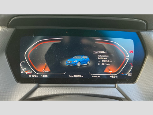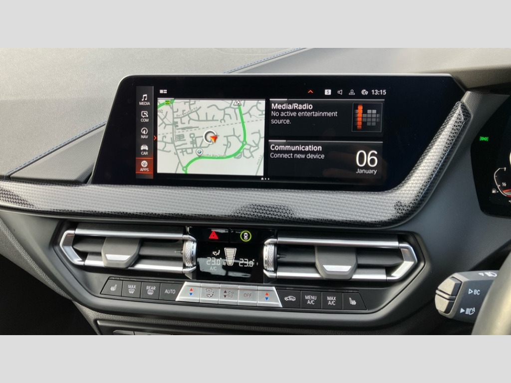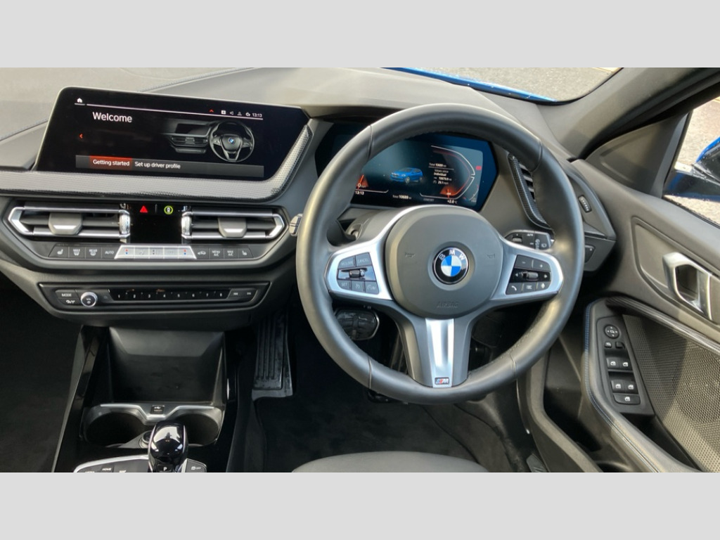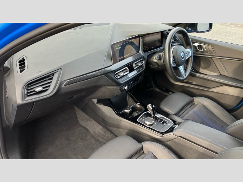 BMW 1 Series 118i [136] M Sport 5dr Step Auto [LCP] Active guard plus, Attentiveness assist, BMW ConnectedDrive online services, BMW Teleservices, Check Control warning system for monitoring of lights and door/luggage compartment open warning, Cruise control with speed limiter, Eco pro mode, Front axle single joint with specific axle kinematics to minimise drive influences on steering + provide increased rigidity agile driving behaviour, Integrated owners handbook, Lane departure warning system, Oil sensor for level and grade, On board computer, Optimum shift indicator, Personal Profile, Pull away assistant, Rigidly mounted rear subframe - Multi link construction with separate spring / damper configuration and excellent driving characteristics, Speed limit Info including no-overtaking indicator, Aluminium lightweight construction, Anti roll bar front and rear, Balancer shaft, Double VANOS twin scroll turbocharging system, Drive Performance Control, Electronic differential lock, High precision injection, M sport suspension, Petrol Particulate Filter, Twin tube gas filled shock absorbers with degressive characteristic curve, VALVETRONIC engine management, DAB Digital radio, Auto dimming rear view mirror, Automatic headlight beam throw control, Automatic windscreen wipers and automatic headlight, Body colour door handles, Body colour mirror caps, Body colour roof trims, Chrome 'M' logo side designation, Chrome exhaust twin tailpipes round 90mm in left, Chrome kidney grille frame with Satin Aluminium struts, Direction indicator side lights in exterior mirrors, Electrically adjustable exterior mirror with mirror adjustment switch on drivers armrest and aspheric on driver side, convex on passenger side, Fading support, Folding side mirrors with auto dimming/folding wing mirrors with auto dimming, Follow me home headlights, Front and rear bumper system with replaceable deformation elements, Front and rear electric windows with open and close fingertip control, anti trap facility and comfort closing, Front door sill finishers in black plastic with M designation in metallic look, Green tinted heat protection glazing, High gloss shadowline window frame, Recess cover mirror frames and B/C pillar embelisher trim, High level third brake light, Integrated front windscreen with washer jets, LED daytime running lights, LED eyebrow turn indicators, LED front fog lights, Lightweight engineering, Matt black air guide grilles, Matt black wheel arch trim, Model designation on electric bootlid, Nearside reverse light in rear light cluster, Preparation for high beam assistant, Rear fog lights, Rear side wing doors, Rear window wiper, Shark fin antenna, Trailer stabilisation logic, Visible VIN plate, Welcome lighting, 12V power socket in front centre console with blanking plug, 3 rear seat head restraints, 3 seat bench in 2nd row, 3 spoke sports leather steering wheel with black leather and stitching, pearl chrome decorative finish, specific M Badge, Anthracite headlining, Black boot net with lashing eyes, Cargo function on 2nd seat row, Child seat ISOFIX attachment for two outer rear seats and front passenger seat with anchorage points, Conditioned based service, Driver and front passenger backrest net on rear, Driver and front passenger seat heating, Driver side folding compartment in instrument panel, Folding rear clothes hook, Four grab handles integrated in roof lining, Front and rear door pockets with bottle holders, Front and rear side armrest integrated into door trim, Front armrest, Front sports seats, Glove compartment, Height adjustable front head restraints, Luggage compartment for bag hooks on left and right, foldable luggage compartment liner and four lashing eyelets, Manual adjust steering wheel, Multi-function controls for steering wheel, Single front passenger seat, Storage compartment in centre console, Storage compartment in luggage compartment, Stowage of the parcel shelf in luggage compartment trim, Sun visors with vanity mirrors and insert tab, Two front centre console cupholders, Two zone automatic air conditioning, Type C two USB ports in rear centre console, Velour floor mats, Additional interior lighting pack - 1 Series, BMW live cockpit professional pack- 1 Series, Connected pack professional - 1 Series, Interior lights pack - 1 Series, M Sport exterior styling aerodynamics pack - 1 Series, 2 tone horn, 3 point seatbelts on all seats, front pyrotechnic belt tensioners, stopper and belt force limiters, rear coded belt buckles, Airbags - Front driver/passenger, front and rear curtain head protection, front side, manual deactivation of front passenger airbag, Anti lock braking system (ABS) with brake assist, BMW emergency call, Brake drying, Braking readiness, Child proof locking system in rear door, City braking function, Comfort modes, Cornering brake control, Crash sensor activating of airbags, Unlocking doors, hazard warning lights, interior light, safety battery terminal, Driver and front passenger seat belt security check, Dynamic stability control + (DSC+), Dynamic Traction Control - DTC, Electrically operated hand brake including automatic hold function, Front and rear disc brakes, Seatbelt warning, Side impact protection, Tyre pressure monitoring system, Warning triangle and first aid kit, Central locking switch for all doors, fuel filler cap and luggage compartment, Deadlocking function system to all doors, Drive away locking system on all doors and luggage compartment with de-activated in iDrive settings, Locking wheel bolts, Remote control with integrated key with High-gloss Black inlay and M designation and 1 button for open/ close lock, window, open luggage compartment, Start/stop button illuminated in centre console with keyless engine start and auto start stop deactivation button, Thatcham Cat.1 alarm and immobiliser, Wheel slip limitation close to the actuator (ARB), Contrast stitching on instrument panel, 18" Burnished M double spoke bi-colour alloy wheels finished in o