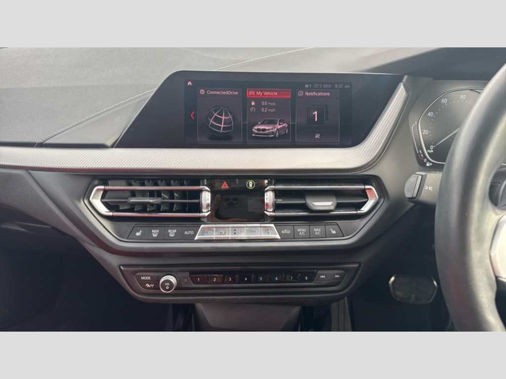 BMW 1 Series 118i M Sport 5dr Step Auto Active guard plus, Attentiveness assist, BMW Online services, BMW Teleservices, Check Control warning system for monitoring of lights and door/luggage compartment open warning, Connected eDrive Services, Eco pro mode, Electric power steering with Servotronic steering optimised at all speed ranges, Integrated owners handbook, Oil sensor for level and grade, On board computer, Optimum shift indicator, Personal Profile, Pull away assistant, Speed limiter, Aluminium lightweight construction, Anti roll bar front and rear, Balancer shaft, Double VANOS, Drive Performance Control, Electronic differential lock, High precision injection, M sports suspension + self levelling, Petrol Particulate Filter, VALVETRONIC engine management, Bluetooth audio streaming, DAB Digital radio, Auto dimming rear view mirror, Automatic headlight beam throw control, Body colour door handles, Body colour mirror caps, Chrome 'M' logo side designation, Chrome exhaust tailpipe in single, round (Exhaust tailpipe, stainless steel - single, round), Chrome kidney grille frame with Satin Aluminium struts, Direction indicator side lights in exterior mirrors, Electric folding and anti dazzle exterior mirrors, Fading support, Follow me home headlights, Front and rear electric windows with open and close fingertip control, anti trap facility and comfort closing, Front door sill finishers in black plastic with BMW designation, Green tinted heat protection glazing, Heated, electrically adjustable exterior mirror aspheric on driver side, convex on passenger side, High gloss shadow line exterior trim, High gloss shadowline window frame, Recess cover mirror frames and B/C pillar embelisher trim, High level third brake light, LED daytime running lights, LED eyebrow turn indicators, LED front fog lights, Lightweight engineering, Matt black air guide grilles, Model designation on right side of tailgate, Nearside reverse light in rear light cluster, Rain sensor including auto headlights activation, Rear fog lights, Rear window wiper, Shark fin antenna, Visible VIN plate, Welcome lighting, Windscreen wipers with integrated washing jets, 12V power socket in centre console, 2 cupholders in front centre console, 3 rear seat head restraints, 3 spoke M sports design leather steering wheel finished in nappa leather with specific M badge, Anthracite headlining, Anthracite Velour floor mats, Child seat ISOFIX attachment for two outer rear seats and front passenger seat with anchorage points, Conditioned based service, Dakota leather upholstery with perforation and contrast stitching, Driver and front passenger seat heating, Driver side folding compartment in instrument panel, Folding rear clothes hook, Folding rear seats, Four grab handles integrated in roof lining, Front and rear door pockets, Front and rear side armrest integrated into door trim, Front armrest foldable with integrated storage compartment, Front sports seats with electric side bolster adjustment, Glove compartment, Height adjustable front head restraints, Manual adjust steering wheel, Multi-function controls for steering wheel, Rear seat backrest with manual 60:40 split folding with 3 top tether clips integrated on rear of seat panels, Storage compartment in centre console, Sun visors with vanity mirrors and insert tab, Two zone automatic air conditioning, Extended Lighting pack - 1 Series, Extended storage pack - 1 Series, Interior lights pack - 1 Series, Luggage compartment pack - 1 Series, M Sport exterior styling aerodynamics pack - 1 Series, 2 tone horn, 3 point seatbelts on all seats, front pyrotechnic belt tensioners, stopper and belt force limiters, rear coded belt buckles, Airbags - Front driver and passenger, front and rear head, front side, curtain head protection, Anti lock braking system (ABS) with brake assist, BMW emergency call, Brake drying, Braking readiness, Crash sensor activating central locking release, hazard warning lights, fuel cut off, interior lighting + activation of safety battery terminal clamp, Driver and front passenger seat belt security check, Dynamic stability control + (DSC+), Dynamic Traction Control - DTC, Electrically operated hand brake, Front and rear disc brakes, Front passenger manual airbag deactivation, Rear child proof door locks, Seatbelt warning, Side impact protection, Tyre pressure monitoring system, Warning triangle and first aid kit, Automatic drive away locking facility, Central locking switch for all doors, fuel filler cap and luggage compartment, Deadlocking function system to all doors, Locking wheel bolts, Remote control with integrated key with High-gloss Black inlay and M designation and 1 button for open/ close lock, window, open luggage compartment, Start/stop button with comfort go keyless engine start and auto start stop deactivation button, Thatcham Cat.1 alarm and immobiliser, Contrast stitching on instrument panel, Reduced rolling resistance tyres