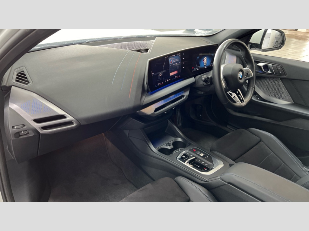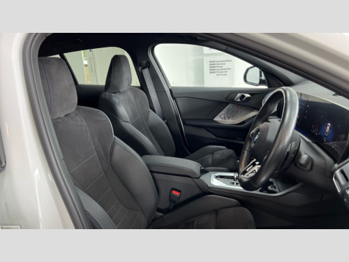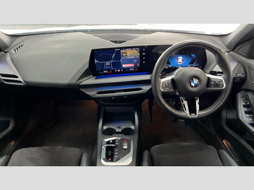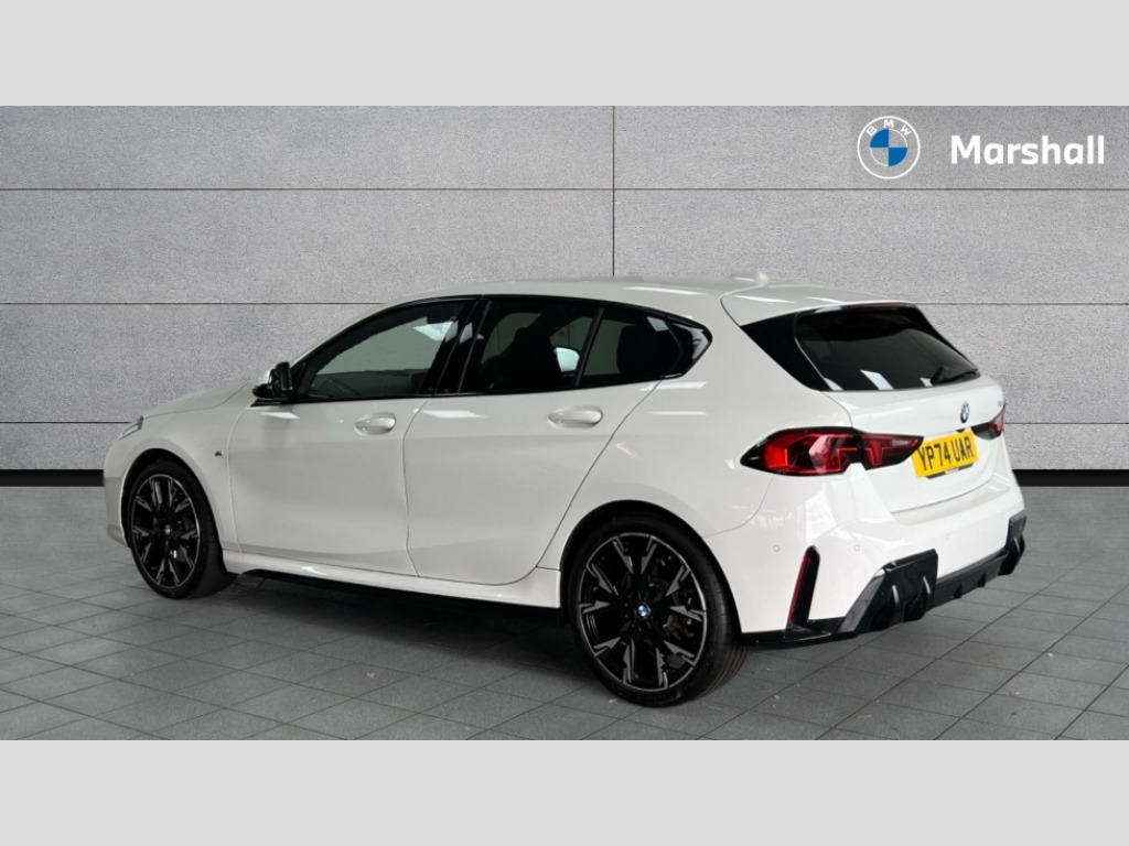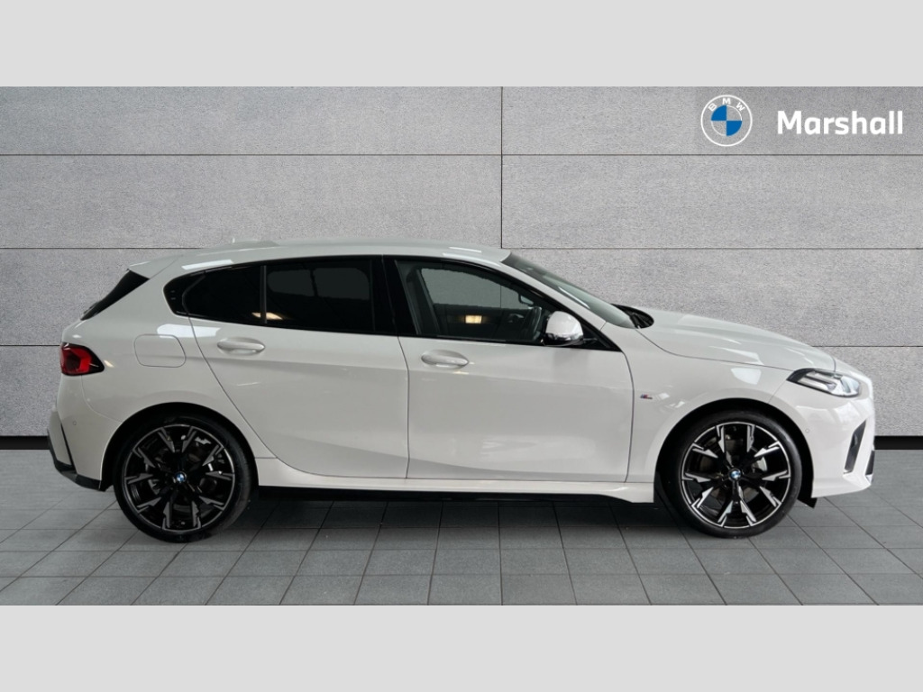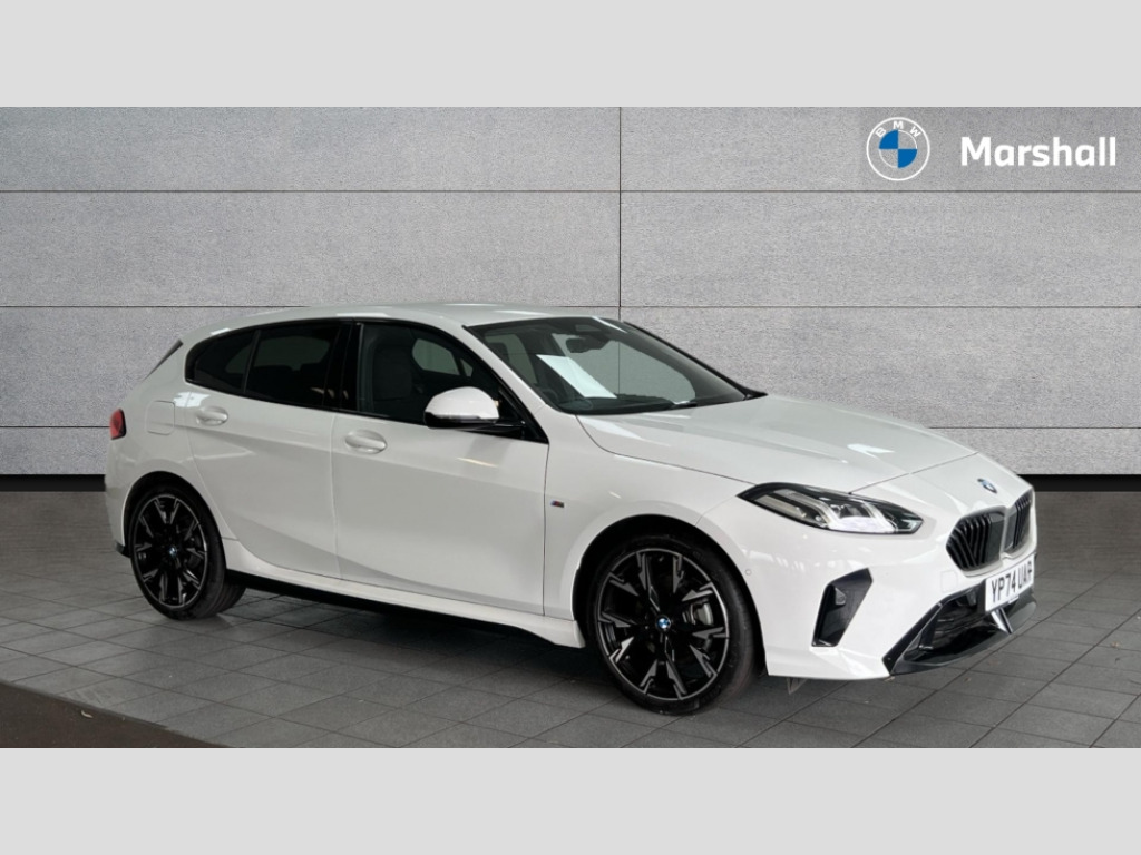 BMW 1 Series 120 M Sport 5dr Step Auto Active guard plus, Attentiveness assist, Bluetooth / WiFi interface for wireless connection of mobile terminal devices and audio streaming, BMW ConnectedDrive online services, BMW Live cockpit plus, BMW Teleservices, Check Control warning system for monitoring of lights and door/luggage compartment open warning, Cruise control with speed limiter, Eco pro mode, Electric power steering with Servotronic steering optimised at all speed ranges, Front and rear parking sensors, Front axle single joint with specific axle kinematics to minimise drive influences on steering + provide increased rigidity agile driving behaviour, Integrated owners handbook, Lane departure warning system, Oil sensor for level and grade, On board computer, Optimum shift indicator, Park assist including reversing assistant, lateral parking aid and reversing assist camera, Personal Profile, Pull away assistant, Rigidly mounted rear subframe - Multi link construction with separate spring / damper configuration and excellent driving characteristics, Speed limit Info including no-overtaking indicator, Speedometer, 49 litre fuel tank, Aluminium lightweight construction, Anti roll bar front and rear, Balancer shaft, Double VANOS twin scroll turbocharging system, Drive Performance Control, Electronic differential lock, High precision injection, M Adaptive suspension, Petrol Particulate Filter, Twin tube gas filled shock absorbers with degressive characteristic curve, VALVETRONIC engine management, DAB Digital radio, Auto dimming rear view mirror, Automatic headlight beam throw control, Automatic windscreen wipers and automatic headlight, Body colour door handles, Body colour mirror caps, Body colour roof trims, Chrome 'M' logo side designation, Chrome exhaust twin tailpipes round 90mm in left, Chrome kidney grille frame with Satin Aluminium struts, Direction indicator side lights in exterior mirrors, Electrically adjustable exterior mirror with mirror adjustment switch on drivers armrest and aspheric on driver side, convex on passenger side, Fading support, Folding side mirrors with auto dimming/folding wing mirrors with auto dimming, Follow me home headlights, Front and rear bumper system with replaceable deformation elements, Front and rear electric windows with open and close fingertip control, anti trap facility and comfort closing, Front door sill finishers in black plastic with M designation in metallic look, Green tinted heat protection glazing, High gloss shadowline window frame, Recess cover mirror frames and B/C pillar embelisher trim, High level third brake light, Integrated front windscreen with washer jets, LED daytime running lights, LED eyebrow turn indicators, LED front fog lights, LED Headlights, Lightweight engineering, Matt black air guide grilles, Matt black wheel arch trim, Nearside reverse light in rear light cluster, Preparation for high beam assistant, Rear fog lights, Rear side wing doors, Rear window wiper, Shark fin antenna, Trailer stabilisation logic, Visible VIN plate, Welcome lighting, 12V power socket in front centre console with blanking plug, 3 rear seat head restraints, 3 seat bench in 2nd row, 3 spoke sports leather steering wheel with black leather and stitching, pearl chrome decorative finish, specific M Badge, Anthracite headlining, Black boot net with lashing eyes, Cargo function on 2nd seat row, Child seat ISOFIX attachment for two outer rear seats and front passenger seat with anchorage points, Conditioned based service, Driver and front passenger backrest net on rear, Driver and front passenger seat heating, Driver side folding compartment in instrument panel, Folding rear clothes hook, Four grab handles integrated in roof lining, Front and rear door pockets with bottle holders, Front and rear side armrest integrated into door trim, Front armrest, Glove compartment, Height adjustable front head restraints, Luggage compartment for bag hooks on left and right, foldable luggage compartment liner and four lashing eyelets, Manual adjust steering wheel, Multi-function controls for steering wheel, Rear seat backrest with manual 60:40 split folding with 3 top tether clips integrated on rear of seat panels, Single front passenger seat, Storage compartment in centre console, Storage compartment in luggage compartment, Stowage of the parcel shelf in luggage compartment trim, Sun visors with vanity mirrors and insert tab, Two front centre console cupholders, Type C two USB ports in rear centre console, Velour floor mats, Connected pack professional - 1 Series, Interior lights pack - 1 Series, M Sport exterior styling aerodynamics pack - 1 Series, 2 tone horn, 3 point seatbelts on all seats, front pyrotechnic belt tensioners, stopper and belt force limiters, rear coded belt buckles, Airbags - Front driver/passenger, front and rear curtain head protection, front side, manual deactivation of front passenger airbag, Anti lock braking system (ABS) with brake assist, BMW emergency call, Brake drying, Braking readiness, Child proof locking system in rear door, Comfort modes, Cornering brake control, Crash sensor activating of airbags, Unlocking doors, hazard warning lights, interior light, safety battery terminal, Driver and front passenger seat belt security check, Dynamic stability control + (DSC+), Dynamic Traction Control - DTC, Electrically operated hand brake including automatic hold function, Front and rear disc brakes, Seatbelt warning, Side impact protection, Tyre pressure monitoring system, Warning triangle and first aid kit, Central locking switch for all doors, fuel filler cap and luggage compartment, Deadlocking function system to all doors, Drive away locking system on all doors and luggage compartment with de-activated in iDrive settings, Locking wheel bolts, Remote control with integrated key with High-gloss Black inlay and M designation and 1 button for open/ close lock, window, open luggage compartment, Start/stop button illuminated in centre cons