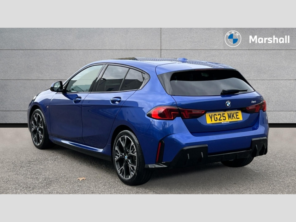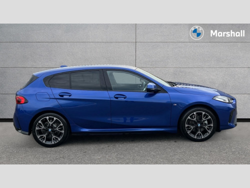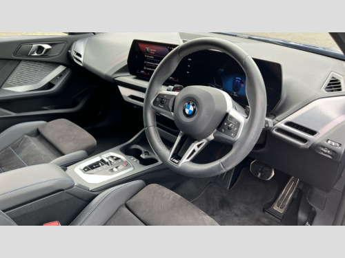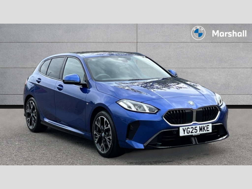 BMW 1 Series 120 M Sport 5dr Step Auto Active guard plus, Attentiveness assist, Bluetooth / WiFi interface for wireless connection of mobile terminal devices and audio streaming, BMW ConnectedDrive online services, BMW Live cockpit plus, BMW Teleservices, Check Control warning system for monitoring of lights and door/luggage compartment open warning, Eco pro mode, Electric power steering with Servotronic steering optimised at all speed ranges, Evasion assistant, Flat airvents in instrument panel with adjustable slats, Front and rear parking sensors, Front axle single joint with specific axle kinematics to minimise drive influences on steering + provide increased rigidity agile driving behaviour, Gearshift time display in manual mode, Integrated owners handbook, Left turn warning with brake function, My modes (Personal / Efficient / Sport), Oil sensor for level and grade, On board computer, Optimum shift indicator, Park assist including reversing assistant, lateral parking aid and reversing assist camera, Personal e-SIM, Personal Profile, Pull away assistant, Rigidly mounted rear subframe - Multi link construction with separate spring / damper configuration and excellent driving characteristics, Speed limit Info including no-overtaking indicator, Speed limiter, 49 litre fuel tank, Aluminium lightweight construction, Anti roll bar front and rear, Balancer shaft, Double VANOS twin scroll turbocharging system, Drive Performance Control, Electronic differential lock, Electronic selector lever, High precision injection, M Adaptive suspension, Petrol Particulate Filter, Steptronic transmission with double clutch, Twin tube gas filled shock absorbers with degressive characteristic curve, VALVETRONIC engine management, DAB Digital radio, Auto dimming rear view mirror, Automatic windscreen wipers and automatic headlight, Body colour door handles, Body colour mirror caps, Body colour roof trims, Chrome 'M' logo side designation, Chrome exhaust twin tailpipes round 90mm in left, Chrome kidney grille frame with Satin Aluminium struts, Direction indicator side lights in exterior mirrors, Electrically adjustable exterior mirror with mirror adjustment switch on drivers armrest and aspheric on driver side, convex on passenger side, Exterior M sport design elements, Fading support, Folding side mirrors with auto dimming/folding wing mirrors with auto dimming, Follow me home headlights, Front and rear bumper system with replaceable deformation elements, Front and rear electric windows with open and close fingertip control, anti trap facility and comfort closing, Front bumper panel with M specific design in vehicle colour with inserts in black high gloss, Front door sill finishers in black plastic with M designation in metallic look, Green tinted heat protection glazing, Heated rear window, High gloss black exterior mirrors, High gloss shadowline window frame, Recess cover mirror frames and B/C pillar embelisher trim, High level third brake light, Integrated front windscreen with washer jets, LED daytime running lights, LED eyebrow turn indicators, LED front fog lights, LED Headlights, Lightweight engineering, M identification on the sides, Matt black air guide grilles, Matt black wheel arch trim, Model badge on tailgate right, Nearside reverse light in rear light cluster, Preparation for high beam assistant, Rain sensor, Rear bumper panel with M-specific design in vehicle colour with inserts in black high gloss, Rear fog lights, Rear side wing doors, Rear window wiper, Shark fin antenna, Side sill covers with M specific design in body colour, Trailer stabilisation logic, Visible VIN plate, Welcome lighting, 12V power socket in front centre console with blanking plug, 3 rear seat head restraints, 3 seat bench in 2nd row, 3 spoke sports leather steering wheel with black leather and stitching, pearl chrome decorative finish, specific M Badge, Anthracite front and rear floor mats, Anthracite headlining, Black boot net with lashing eyes, Cargo function on 2nd seat row, Child seat ISOFIX attachment for two outer rear seats and front passenger seat with anchorage points, Conditioned based service, Driver and front passenger backrest net on rear, Driver and front passenger seat heating, Driver side folding compartment in instrument panel, Folding rear clothes hook, Footrest and pedals in black plastic, Four grab handles integrated in roof lining, Front and rear door pockets with bottle holders, Front and rear side armrest integrated into door trim, Front armrest with storage compartment, Gearshift paddles on steering wheel, Glove compartment, Height adjustable front head restraints, Luggage compartment for bag hooks on left and right, foldable luggage compartment liner and four lashing eyelets, Manual adjust steering wheel, Multi-function controls for steering wheel, Rear seat backrest with manual 60:40 split folding with 3 top tether clips integrated on rear of seat panels, Single front passenger seat, Storage compartment in centre console, Storage compartment in luggage compartment, Stowage of the parcel shelf in luggage compartment trim, Sun visors with vanity mirrors and insert tab, Two front centre console cupholders, Type C two USB ports in rear centre console, Upper retaining strap integrated into backrest rear panels, Connected pack professional - 1 Series, Interior lights pack - 1 Series, M Sport exterior styling aerodynamics pack - 1 Series, 2 tone horn, 3 point seatbelts on all seats, front pyrotechnic belt tensioners, stopper and belt force limiters, rear coded belt buckles, Airbags - Front driver/passenger, front and rear curtain head protection, front side, manual deactivation of front passenger airbag, Anti lock braking system (ABS) with brake assist, BMW emergency call, Brake drying, Braking readiness, Child proof locking system in rear door, Comfort modes, Cornering brake control, Crash sensor activating of airbags, Unlocking doors, hazard warning lights, interior light, safety battery terminal, D