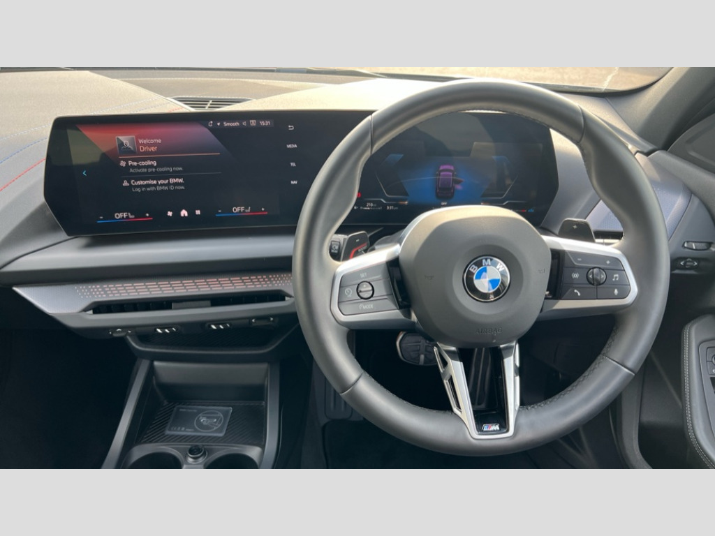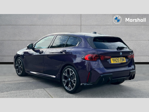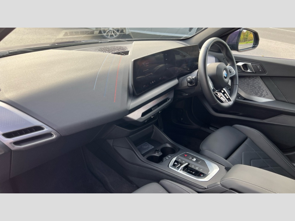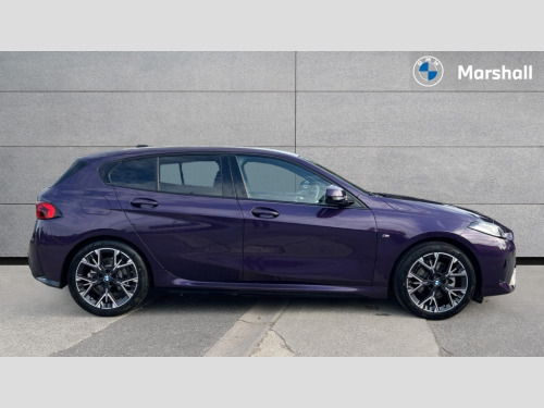 BMW 1 Series 120 M Sport 5dr Step Auto Active guard plus, Attentiveness assist, Bluetooth / WiFi interface for wireless connection of mobile terminal devices and audio streaming, BMW ConnectedDrive online services, BMW Live cockpit plus, BMW Teleservices, Check Control warning system for monitoring of lights and door/luggage compartment open warning, Eco pro mode, Electric power steering with Servotronic steering optimised at all speed ranges, Evasion assistant, Flat airvents in instrument panel with adjustable slats, Front and rear parking sensors, Front axle single joint with specific axle kinematics to minimise drive influences on steering + provide increased rigidity agile driving behaviour, Gearshift time display in manual mode, Integrated owners handbook, Left turn warning with brake function, My modes (Personal / Efficient / Sport), Oil sensor for level and grade, On board computer, Optimum shift indicator, Park assist including reversing assistant, lateral parking aid and reversing assist camera, Personal e-SIM, Personal Profile, Pull away assistant, Rigidly mounted rear subframe - Multi link construction with separate spring / damper configuration and excellent driving characteristics, Speed limit Info including no-overtaking indicator, Speed limiter, 49 litre fuel tank, Aluminium lightweight construction, Anti roll bar front and rear, Balancer shaft, Double VANOS twin scroll turbocharging system, Drive Performance Control, Electronic differential lock, Electronic selector lever, High precision injection, M Adaptive suspension, Petrol Particulate Filter, Steptronic transmission with double clutch, Twin tube gas filled shock absorbers with degressive characteristic curve, VALVETRONIC engine management, DAB Digital radio, Auto dimming rear view mirror, Automatic windscreen wipers and automatic headlight, Body colour door handles, Body colour mirror caps, Body colour roof trims, Chrome 'M' logo side designation, Chrome exhaust twin tailpipes round 90mm in left, Chrome kidney grille frame with Satin Aluminium struts, Direction indicator side lights in exterior mirrors, Electrically adjustable exterior mirror with mirror adjustment switch on drivers armrest and aspheric on driver side, convex on passenger side, Exterior M sport design elements, Fading support, Folding side mirrors with auto dimming/folding wing mirrors with auto dimming, Follow me home headlights, Front and rear bumper system with replaceable deformation elements, Front and rear electric windows with open and close fingertip control, anti trap facility and comfort closing, Front bumper panel with M specific design in vehicle colour with inserts in black high gloss, Front door sill finishers in black plastic with M designation in metallic look, Green tinted heat protection glazing, Heated rear window, High gloss black exterior mirrors, High gloss shadowline window frame, Recess cover mirror frames and B/C pillar embelisher trim, High level third brake light, Integrated front windscreen with washer jets, LED daytime running lights, LED eyebrow turn indicators, LED front fog lights, LED Headlights, Lightweight engineering, M identification on the sides, Matt black air guide grilles, Matt black wheel arch trim, Model badge on tailgate right, Nearside reverse light in rear light cluster, Preparation for high beam assistant, Rain sensor, Rear bumper panel with M-specific design in vehicle colour with inserts in black high gloss, Rear fog lights, Rear side wing doors, Rear window wiper, Shark fin antenna, Side sill covers with M specific design in body colour, Trailer stabilisation logic, Visible VIN plate, Welcome lighting, 12V power socket in front centre console with blanking plug, 3 rear seat head restraints, 3 seat bench in 2nd row, 3 spoke sports leather steering wheel with black leather and stitching, pearl chrome decorative finish, specific M Badge, Anthracite front and rear floor mats, Anthracite headlining, Black boot net with lashing eyes, Cargo function on 2nd seat row, Child seat ISOFIX attachment for two outer rear seats and front passenger seat with anchorage points, Conditioned based service, Driver and front passenger backrest net on rear, Driver and front passenger seat heating, Driver side folding compartment in instrument panel, Folding rear clothes hook, Footrest and pedals in black plastic, Four grab handles integrated in roof lining, Front and rear door pockets with bottle holders, Front and rear side armrest integrated into door trim, Front armrest with storage compartment, Gearshift paddles on steering wheel, Glove compartment, Height adjustable front head restraints, Luggage compartment for bag hooks on left and right, foldable luggage compartment liner and four lashing eyelets, Manual adjust steering wheel, Multi-function controls for steering wheel, Rear seat backrest with manual 60:40 split folding with 3 top tether clips integrated on rear of seat panels, Single front passenger seat, Storage compartment in centre console, Storage compartment in luggage compartment, Stowage of the parcel shelf in luggage compartment trim, Sun visors with vanity mirrors and insert tab, Two front centre console cupholders, Type C two USB ports in rear centre console, Upper retaining strap integrated into backrest rear panels, Connected pack professional - 1 Series, Interior lights pack - 1 Series, M Sport exterior styling aerodynamics pack - 1 Series, 2 tone horn, 3 point seatbelts on all seats, front pyrotechnic belt tensioners, stopper and belt force limiters, rear coded belt buckles, Airbags - Front driver/passenger, front and rear curtain head protection, front side, manual deactivation of front passenger airbag, Anti lock braking system (ABS) with brake assist, BMW emergency call, Brake drying, Braking readiness, Child proof locking system in rear door, Comfort modes, Cornering brake control, Crash sensor activating of airbags, Unlocking doors, hazard warning lights, interior light, safety battery terminal, D