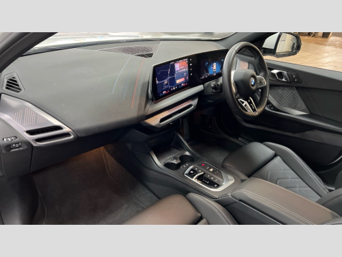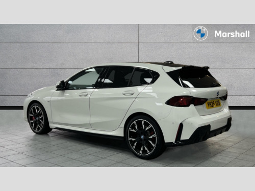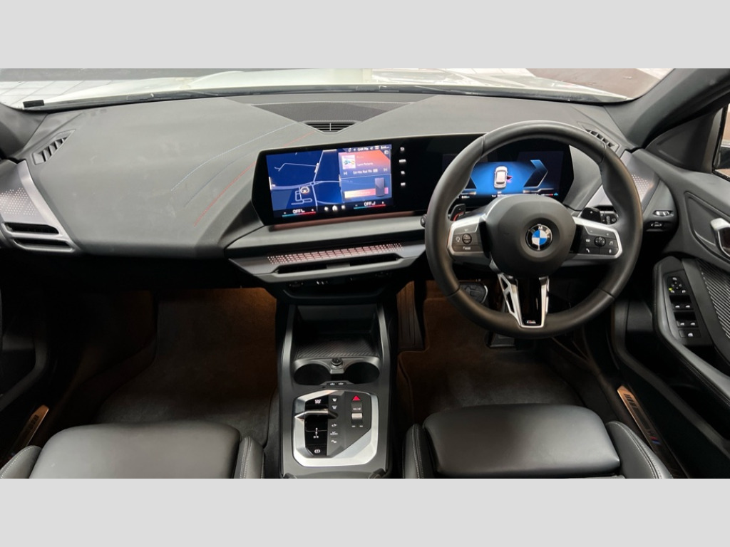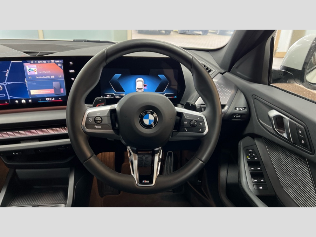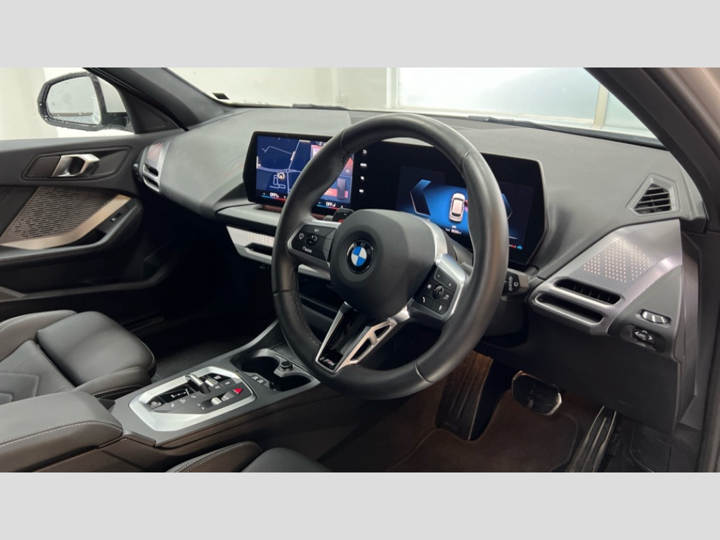 BMW 1 Series 120 M Sport 5dr Step Auto Active guard plus, Attentiveness assist, Bluetooth / WiFi interface for wireless connection of mobile terminal devices and audio streaming, BMW ConnectedDrive online services, BMW Live cockpit plus, BMW Teleservices, Check Control warning system for monitoring of lights and door/luggage compartment open warning, Eco pro mode, Electric power steering with Servotronic steering optimised at all speed ranges, Evasion assistant, Flat airvents in instrument panel with adjustable slats, Front and rear parking sensors, Front axle single joint with specific axle kinematics to minimise drive influences on steering + provide increased rigidity agile driving behaviour, Gearshift time display in manual mode, Integrated owners handbook, Left turn warning with brake function, My modes (Personal / Efficient / Sport), Oil sensor for level and grade, On board computer, Optimum shift indicator, Park assist including reversing assistant, lateral parking aid and reversing assist camera, Personal e-SIM, Personal Profile, Pull away assistant, Rigidly mounted rear subframe - Multi link construction with separate spring / damper configuration and excellent driving characteristics, Speed limit Info including no-overtaking indicator, Speed limiter, 49 litre fuel tank, Aluminium lightweight construction, Anti roll bar front and rear, Balancer shaft, Double VANOS twin scroll turbocharging system, Drive Performance Control, Electronic differential lock, Electronic selector lever, High precision injection, M Adaptive suspension, Petrol Particulate Filter, Steptronic transmission with double clutch, Twin tube gas filled shock absorbers with degressive characteristic curve, VALVETRONIC engine management, DAB Digital radio, Auto dimming rear view mirror, Automatic windscreen wipers and automatic headlight, Body colour door handles, Body colour mirror caps, Body colour roof trims, Chrome 'M' logo side designation, Chrome exhaust twin tailpipes round 90mm in left, Chrome kidney grille frame with Satin Aluminium struts, Direction indicator side lights in exterior mirrors, Electrically adjustable exterior mirror with mirror adjustment switch on drivers armrest and aspheric on driver side, convex on passenger side, Exterior M sport design elements, Fading support, Folding side mirrors with auto dimming/folding wing mirrors with auto dimming, Follow me home headlights, Front and rear bumper system with replaceable deformation elements, Front and rear electric windows with open and close fingertip control, anti trap facility and comfort closing, Front bumper panel with M specific design in vehicle colour with inserts in black high gloss, Front door sill finishers in black plastic with M designation in metallic look, Green tinted heat protection glazing, Heated rear window, High gloss black exterior mirrors, High gloss shadowline window frame, Recess cover mirror frames and B/C pillar embelisher trim, High level third brake light, Integrated front windscreen with washer jets, LED daytime running lights, LED eyebrow turn indicators, LED front fog lights, LED Headlights, Lightweight engineering, M identification on the sides, Matt black air guide grilles, Matt black wheel arch trim, Model badge on tailgate right, Nearside reverse light in rear light cluster, Preparation for high beam assistant, Rain sensor, Rear bumper panel with M-specific design in vehicle colour with inserts in black high gloss, Rear fog lights, Rear side wing doors, Rear window wiper, Shark fin antenna, Side sill covers with M specific design in body colour, Trailer stabilisation logic, Visible VIN plate, Welcome lighting, 12V power socket in front centre console with blanking plug, 3 rear seat head restraints, 3 seat bench in 2nd row, 3 spoke sports leather steering wheel with black leather and stitching, pearl chrome decorative finish, specific M Badge, Anthracite front and rear floor mats, Anthracite headlining, Black boot net with lashing eyes, Cargo function on 2nd seat row, Child seat ISOFIX attachment for two outer rear seats and front passenger seat with anchorage points, Conditioned based service, Driver and front passenger backrest net on rear, Driver and front passenger seat heating, Driver side folding compartment in instrument panel, Folding rear clothes hook, Footrest and pedals in black plastic, Four grab handles integrated in roof lining, Front and rear door pockets with bottle holders, Front and rear side armrest integrated into door trim, Front armrest with storage compartment, Gearshift paddles on steering wheel, Glove compartment, Height adjustable front head restraints, Luggage compartment for bag hooks on left and right, foldable luggage compartment liner and four lashing eyelets, Manual adjust steering wheel, Multi-function controls for steering wheel, Rear seat backrest with manual 60:40 split folding with 3 top tether clips integrated on rear of seat panels, Single front passenger seat, Storage compartment in centre console, Storage compartment in luggage compartment, Stowage of the parcel shelf in luggage compartment trim, Sun visors with vanity mirrors and insert tab, Two front centre console cupholders, Type C two USB ports in rear centre console, Upper retaining strap integrated into backrest rear panels, Connected pack professional - 1 Series, Interior lights pack - 1 Series, M Sport exterior styling aerodynamics pack - 1 Series, 2 tone horn, 3 point seatbelts on all seats, front pyrotechnic belt tensioners, stopper and belt force limiters, rear coded belt buckles, Airbags - Front driver/passenger, front and rear curtain head protection, front side, manual deactivation of front passenger airbag, Anti lock braking system (ABS) with brake assist, BMW emergency call, Brake drying, Braking readiness, Child proof locking system in rear door, Comfort modes, Cornering brake control, Crash sensor activating of airbags, Unlocking doors, hazard warning lights, interior light, safety battery terminal, D