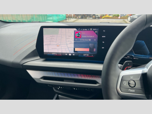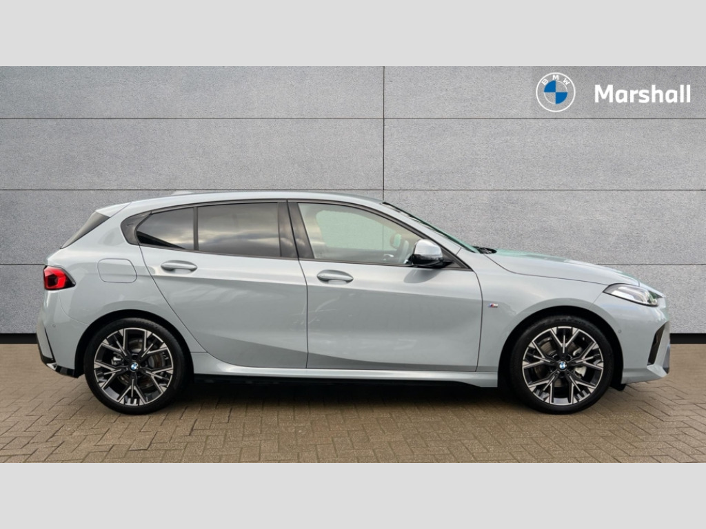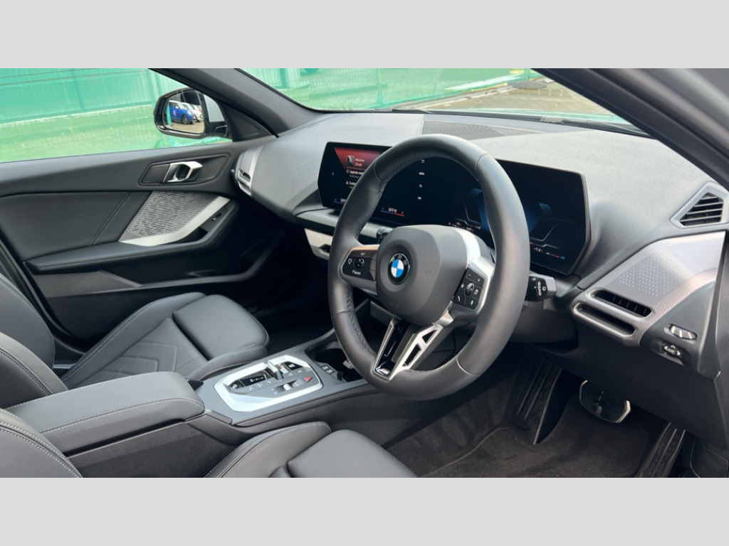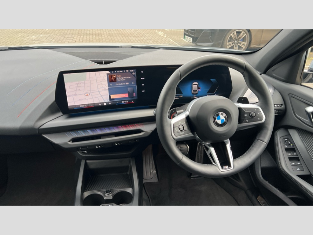 BMW 1 Series 120 M Sport 5dr Step Auto Active guard plus, Attentiveness assist, Bluetooth / WiFi interface for wireless connection of mobile terminal devices and audio streaming, BMW ConnectedDrive online services, BMW Live cockpit plus, BMW Teleservices, Check Control warning system for monitoring of lights and door/luggage compartment open warning, Eco pro mode, Electric power steering with Servotronic steering optimised at all speed ranges, Evasion assistant, Flat airvents in instrument panel with adjustable slats, Front and rear parking sensors, Front axle single joint with specific axle kinematics to minimise drive influences on steering + provide increased rigidity agile driving behaviour, Gearshift time display in manual mode, Integrated owners handbook, Left turn warning with brake function, My modes (Personal / Efficient / Sport), Oil sensor for level and grade, On board computer, Optimum shift indicator, Park assist including reversing assistant, lateral parking aid and reversing assist camera, Personal e-SIM, Personal Profile, Pull away assistant, Rigidly mounted rear subframe - Multi link construction with separate spring / damper configuration and excellent driving characteristics, Speed limit Info including no-overtaking indicator, Speed limiter, 49 litre fuel tank, Aluminium lightweight construction, Anti roll bar front and rear, Balancer shaft, Double VANOS twin scroll turbocharging system, Drive Performance Control, Electronic differential lock, Electronic selector lever, High precision injection, M Adaptive suspension, Petrol Particulate Filter, Steptronic transmission with double clutch, Twin tube gas filled shock absorbers with degressive characteristic curve, VALVETRONIC engine management, DAB Digital radio, Auto dimming rear view mirror, Automatic windscreen wipers and automatic headlight, Body colour door handles, Body colour roof trims, Chrome 'M' logo side designation, Chrome exhaust twin tailpipes round 90mm in left, Chrome kidney grille frame with Satin Aluminium struts, Direction indicator side lights in exterior mirrors, Electrically adjustable exterior mirror with mirror adjustment switch on drivers armrest and aspheric on driver side, convex on passenger side, Exterior M sport design elements, Fading support, Folding side mirrors with auto dimming/folding wing mirrors with auto dimming, Follow me home headlights, Front and rear bumper system with replaceable deformation elements, Front and rear electric windows with open and close fingertip control, anti trap facility and comfort closing, Front bumper panel with M specific design in vehicle colour with inserts in black high gloss, Front door sill finishers in black plastic with M designation in metallic look, Green tinted heat protection glazing, Heated rear window, High gloss black exterior mirrors, High gloss shadowline window frame, Recess cover mirror frames and B/C pillar embelisher trim, High level third brake light, Integrated front windscreen with washer jets, LED daytime running lights, LED eyebrow turn indicators, LED front fog lights, LED Headlights, Lightweight engineering, Matt black air guide grilles, Matt black wheel arch trim, Model badge on tailgate right, Nearside reverse light in rear light cluster, Preparation for high beam assistant, Rain sensor, Rear bumper panel with M-specific design in vehicle colour with inserts in black high gloss, Rear fog lights, Rear side wing doors, Rear window wiper, Shark fin antenna, Side sill covers with M specific design in body colour, Trailer stabilisation logic, Visible VIN plate, Welcome lighting, 12V power socket in front centre console with blanking plug, 3 rear seat head restraints, 3 seat bench in 2nd row, 3 spoke sports leather steering wheel with black leather and stitching, pearl chrome decorative finish, specific M Badge, Anthracite front and rear floor mats, Anthracite headlining, Black boot net with lashing eyes, Cargo function on 2nd seat row, Child seat ISOFIX attachment for two outer rear seats and front passenger seat with anchorage points, Conditioned based service, Driver and front passenger backrest net on rear, Driver and front passenger seat heating, Driver side folding compartment in instrument panel, Folding rear clothes hook, Footrest and pedals in black plastic, Four grab handles integrated in roof lining, Front and rear door pockets with bottle holders, Front and rear side armrest integrated into door trim, Front armrest with storage compartment, Gearshift paddles on steering wheel, Glove compartment, Height adjustable front head restraints, Luggage compartment for bag hooks on left and right, foldable luggage compartment liner and four lashing eyelets, Manual adjust steering wheel, Multi-function controls for steering wheel, Rear seat backrest with manual 60:40 split folding with 3 top tether clips integrated on rear of seat panels, Single front passenger seat, Storage compartment in centre console, Storage compartment in luggage compartment, Stowage of the parcel shelf in luggage compartment trim, Sun visors with vanity mirrors and insert tab, Two front centre console cupholders, Type C two USB ports in rear centre console, Upper retaining strap integrated into backrest rear panels, Connected pack professional - 1 Series, Interior lights pack - 1 Series, M Sport exterior styling aerodynamics pack - 1 Series, 2 tone horn, 3 point seatbelts on all seats, front pyrotechnic belt tensioners, stopper and belt force limiters, rear coded belt buckles, Airbags - Front driver/passenger, front and rear curtain head protection, front side, manual deactivation of front passenger airbag, Anti lock braking system (ABS) with brake assist, BMW emergency call, Brake drying, Braking readiness, Child proof locking system in rear door, Comfort modes, Cornering brake control, Crash sensor activating of airbags, Unlocking doors, hazard warning lights, interior light, safety battery terminal, Driver and front passenger seat belt security check, Dyna