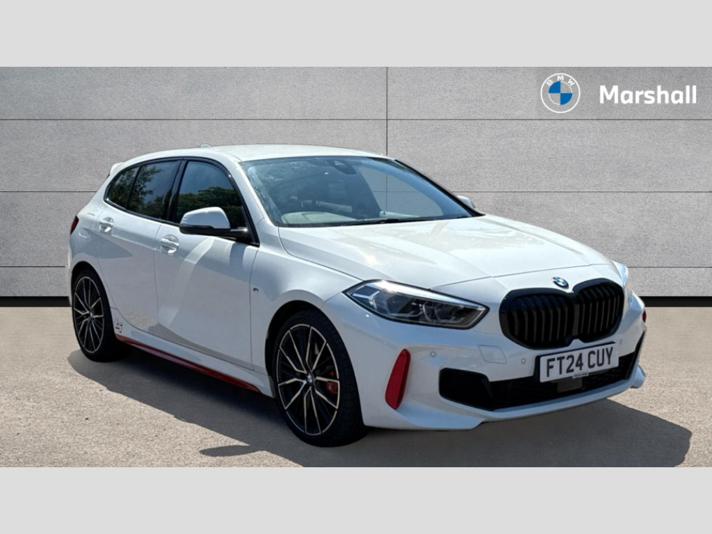 BMW 1 Series 128ti 5dr Step Auto [Live Cockpit Professional] Active guard plus, Attentiveness assist, BMW ConnectedDrive online services, BMW Teleservices, Check Control warning system for monitoring of lights and door/luggage compartment open warning, Cruise control with speed limiter, Eco pro mode, Electric power steering with Servotronic steering optimised at all speed ranges, Front axle single joint with specific axle kinematics to minimise drive influences on steering + provide increased rigidity agile driving behaviour, Integrated owners handbook, Lane departure warning system, Oil sensor for level and grade, On board computer, Optimum shift indicator, Personal Profile, Pull away assistant, Rigidly mounted rear subframe - Multi link construction with separate spring / damper configuration and excellent driving characteristics, Speed limit Info including no-overtaking indicator, Aluminium lightweight construction, Anti roll bar front and rear, Balancer shaft, Double VANOS twin scroll turbocharging system, Drive Performance Control, Eight speed sport automatic transmission with gearshift paddle switches, Electronic differential lock, High precision injection, Larger fuel tank capacity (50 litres), M sport suspension with M128i xDrive specific settings, Petrol Particulate Filter, Twin tube gas filled shock absorbers with degressive characteristic curve, VALVETRONIC engine management, DAB Digital radio, Auto dimming rear view mirror, Automatic headlight beam throw control, Automatic windscreen wipers and automatic headlight, Black chrome tailpipe finishers, BMW individual high gloss shadow line with extended content, Body colour door handles, Body colour mirror caps, Body colour roof trims, Chrome 'M' logo side designation, Direction indicator side lights in exterior mirrors, Electrically adjustable exterior mirror with mirror adjustment switch on drivers armrest and aspheric on driver side, convex on passenger side, Fading support, Folding side mirrors with auto dimming/folding wing mirrors with auto dimming, Follow me home headlights, Front and rear bumper system with replaceable deformation elements, Front and rear electric windows with open and close fingertip control, anti trap facility and comfort closing, Front door sill finishers in black plastic with M designation in metallic look, Green tinted heat protection glazing, High gloss shadowline window frame, Recess cover mirror frames and B/C pillar embelisher trim, High level third brake light, Integrated front windscreen with washer jets, Kidney frame and struts in high gloss black extended, LED daytime running lights, LED eyebrow turn indicators, Lightweight engineering, Matt black air guide grilles, Matt black wheel arch trim, Model designation on electric bootlid, Nearside reverse light in rear light cluster, Preparation for high beam assistant, Rear fog lights, Rear side wing doors, Rear window wiper, Shark fin antenna, Trailer stabilisation logic, Visible VIN plate, Welcome lighting, 12V power socket in front centre console with blanking plug, 3 rear seat head restraints, 3 seat bench in 2nd row, Anthracite headlining, Black boot net with lashing eyes, Cargo function on 2nd seat row, Child seat ISOFIX attachment for two outer rear seats and front passenger seat with anchorage points, Conditioned based service, Driver and front passenger backrest net on rear, Driver and front passenger seat heating, Driver side folding compartment in instrument panel, Folding rear clothes hook, Four grab handles integrated in roof lining, Front and rear door pockets with bottle holders, Front and rear side armrest integrated into door trim, Front armrest, Front sports seats, Glove compartment, Height adjustable front head restraints, Luggage compartment for bag hooks on left and right, foldable luggage compartment liner and four lashing eyelets, Manual adjust steering wheel, Multi-function controls for steering wheel, Single front passenger seat, Storage compartment in centre console, Storage compartment in luggage compartment, Stowage of the parcel shelf in luggage compartment trim, Sun visors with vanity mirrors and insert tab, Three spoke M sport design multi function leather steering wheel in unique red stitching, Two front centre console cupholders, Two zone automatic air conditioning, Type C two USB ports in rear centre console, Additional interior lighting pack - 1 Series, BMW live cockpit professional pack- 1 Series, Connected pack professional - 1 Series, Interior lights pack - 1 Series, M Sport exterior styling aerodynamics pack - 1 Series, 2 tone horn, 3 point seatbelts on all seats, front pyrotechnic belt tensioners, stopper and belt force limiters, rear coded belt buckles, Airbags - Front driver/passenger, front and rear curtain head protection, front side, manual deactivation of front passenger airbag, Anti lock braking system (ABS) with brake assist, BMW emergency call, Brake drying, Braking readiness, Child proof locking system in rear door, City braking function, Comfort modes, Cornering brake control, Crash sensor activating of airbags,Unlocking doors,hazard warning lights,fuel cut off,interior lighting+activation of safety battery terminal clamp, Driver and front passenger seat belt security check, Dynamic stability control + (DSC+), Dynamic Traction Control - DTC, Electrically operated hand brake including automatic hold function, Front and rear disc brakes, M Sport brakes with red calipers, M Sport seatbelts, Seatbelt warning, Side impact protection, Tyre pressure monitoring system, Warning triangle and first aid kit, Central locking switch for all doors, fuel filler cap and luggage compartment, Deadlocking function system to all doors, Drive away locking system on all doors and luggage compartment with de-activated in iDrive settings, Locking wheel bolts, Remote control with integrated key with High-gloss Black inlay and M designation and 1 button for open/ close lock, window, open luggage compartment, Start/stop button