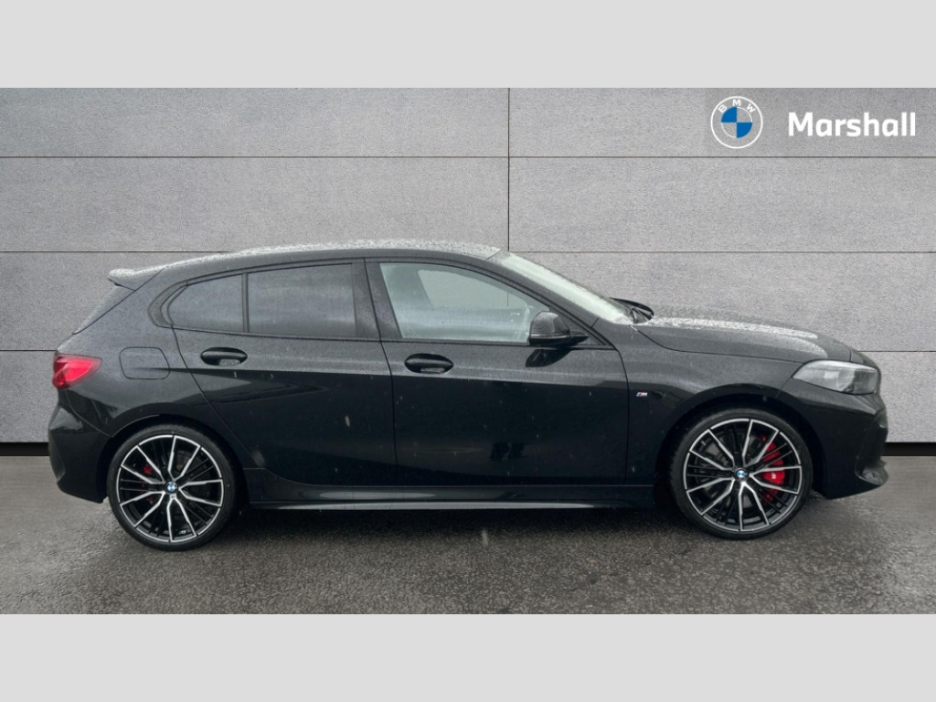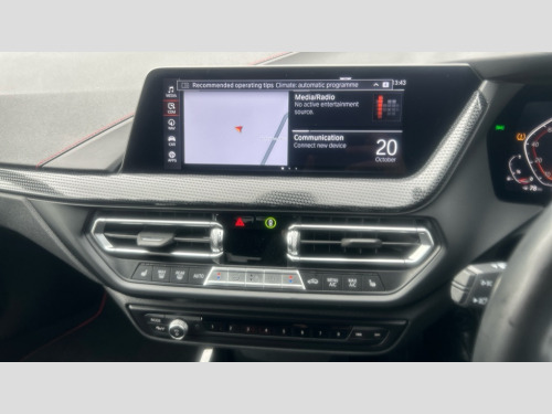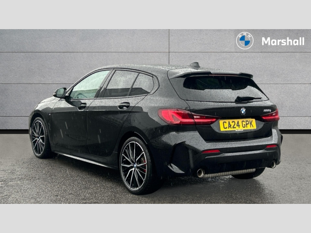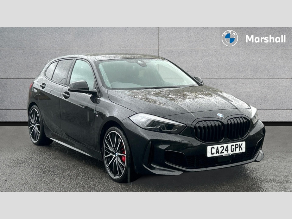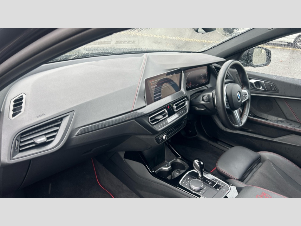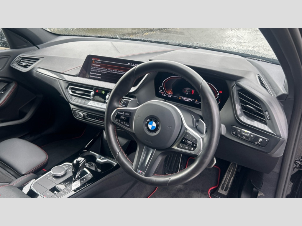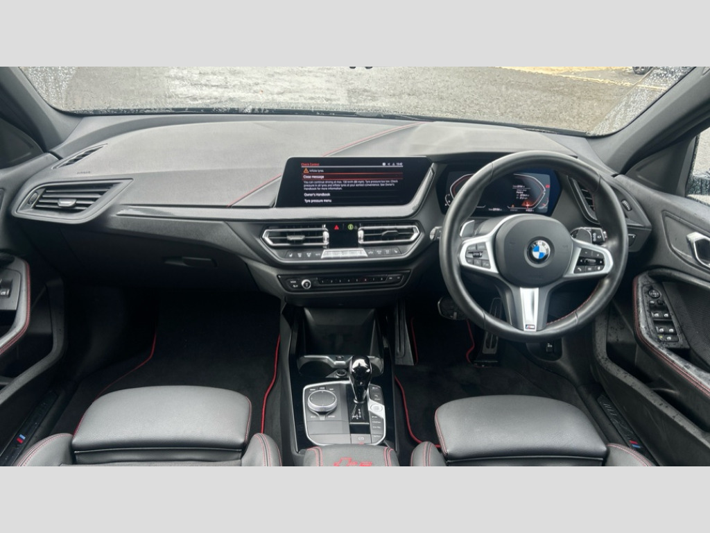 BMW 1 Series 128ti 5dr Step Auto [Live Cockpit Professional] Active guard plus, Attentiveness assist, BMW ConnectedDrive online services, BMW Teleservices, Check Control warning system for monitoring of lights and door/luggage compartment open warning, Cruise control with speed limiter, Eco pro mode, Electric power steering with Servotronic steering optimised at all speed ranges, Front axle single joint with specific axle kinematics to minimise drive influences on steering + provide increased rigidity agile driving behaviour, Integrated owners handbook, Lane departure warning system, Oil sensor for level and grade, On board computer, Optimum shift indicator, Personal Profile, Pull away assistant, Rigidly mounted rear subframe - Multi link construction with separate spring / damper configuration and excellent driving characteristics, Speed limit Info including no-overtaking indicator, Aluminium lightweight construction, Anti roll bar front and rear, Balancer shaft, Double VANOS twin scroll turbocharging system, Drive Performance Control, Eight speed sport automatic transmission with gearshift paddle switches, Electronic differential lock, High precision injection, Larger fuel tank capacity (50 litres), M sport suspension with M128i xDrive specific settings, Petrol Particulate Filter, Twin tube gas filled shock absorbers with degressive characteristic curve, VALVETRONIC engine management, DAB Digital radio, Auto dimming rear view mirror, Automatic headlight beam throw control, Automatic windscreen wipers and automatic headlight, Black chrome tailpipe finishers, BMW individual high gloss shadow line with extended content, Body colour door handles, Body colour mirror caps, Body colour roof trims, Chrome 'M' logo side designation, Direction indicator side lights in exterior mirrors, Electrically adjustable exterior mirror with mirror adjustment switch on drivers armrest and aspheric on driver side, convex on passenger side, Fading support, Folding side mirrors with auto dimming/folding wing mirrors with auto dimming, Follow me home headlights, Front and rear bumper system with replaceable deformation elements, Front and rear electric windows with open and close fingertip control, anti trap facility and comfort closing, Front door sill finishers in black plastic with M designation in metallic look, Green tinted heat protection glazing, High gloss shadowline window frame, Recess cover mirror frames and B/C pillar embelisher trim, High level third brake light, Integrated front windscreen with washer jets, Kidney frame and struts in high gloss black extended, LED daytime running lights, LED eyebrow turn indicators, Lightweight engineering, Matt black air guide grilles, Matt black wheel arch trim, Model designation on electric bootlid, Nearside reverse light in rear light cluster, Preparation for high beam assistant, Rear fog lights, Rear side wing doors, Rear window wiper, Shark fin antenna, Trailer stabilisation logic, Visible VIN plate, Welcome lighting, 12V power socket in front centre console with blanking plug, 3 rear seat head restraints, 3 seat bench in 2nd row, Anthracite headlining, Black boot net with lashing eyes, Cargo function on 2nd seat row, Child seat ISOFIX attachment for two outer rear seats and front passenger seat with anchorage points, Conditioned based service, Driver and front passenger backrest net on rear, Driver and front passenger seat heating, Driver side folding compartment in instrument panel, Folding rear clothes hook, Four grab handles integrated in roof lining, Front and rear door pockets with bottle holders, Front and rear side armrest integrated into door trim, Front armrest, Front sports seats, Glove compartment, Height adjustable front head restraints, Luggage compartment for bag hooks on left and right, foldable luggage compartment liner and four lashing eyelets, Manual adjust steering wheel, Multi-function controls for steering wheel, Single front passenger seat, Storage compartment in centre console, Storage compartment in luggage compartment, Stowage of the parcel shelf in luggage compartment trim, Sun visors with vanity mirrors and insert tab, Three spoke M sport design multi function leather steering wheel in unique red stitching, Two front centre console cupholders, Two zone automatic air conditioning, Type C two USB ports in rear centre console, Additional interior lighting pack - 1 Series, BMW live cockpit professional pack- 1 Series, Connected pack professional - 1 Series, Interior lights pack - 1 Series, M Sport exterior styling aerodynamics pack - 1 Series, 2 tone horn, 3 point seatbelts on all seats, front pyrotechnic belt tensioners, stopper and belt force limiters, rear coded belt buckles, Airbags - Front driver/passenger, front and rear curtain head protection, front side, manual deactivation of front passenger airbag, Anti lock braking system (ABS) with brake assist, BMW emergency call, Brake drying, Braking readiness, Child proof locking system in rear door, City braking function, Comfort modes, Cornering brake control, Crash sensor activating of airbags, Unlocking doors, hazard warning lights, interior light, safety battery terminal, Driver and front passenger seat belt security check, Dynamic stability control + (DSC+), Dynamic Traction Control - DTC, Electrically operated hand brake including automatic hold function, Front and rear disc brakes, M Sport brakes with red calipers, M Sport seatbelts, Seatbelt warning, Side impact protection, Tyre pressure monitoring system, Warning triangle and first aid kit, Central locking switch for all doors, fuel filler cap and luggage compartment, Deadlocking function system to all doors, Drive away locking system on all doors and luggage compartment with de-activated in iDrive settings, Locking wheel bolts, Remote control with integrated key with High-gloss Black inlay and M designation and 1 button for open/ close lock, window, open luggage compartment, Start/stop button illuminated in centre console w