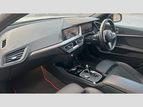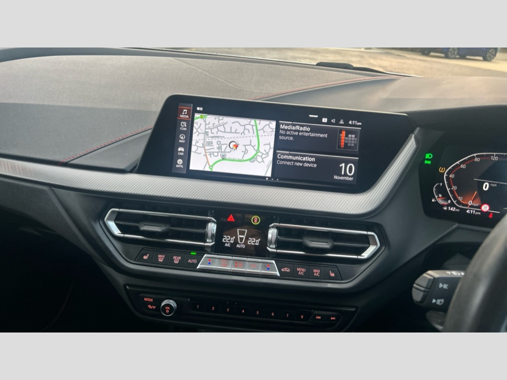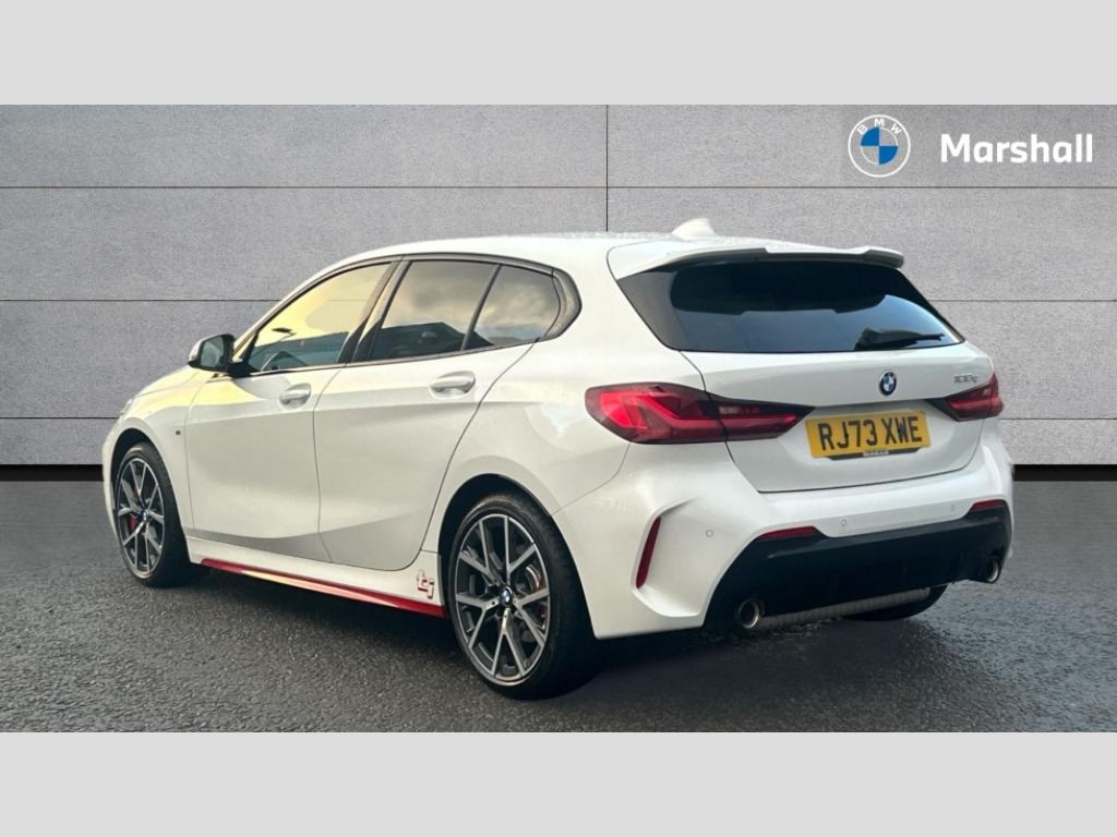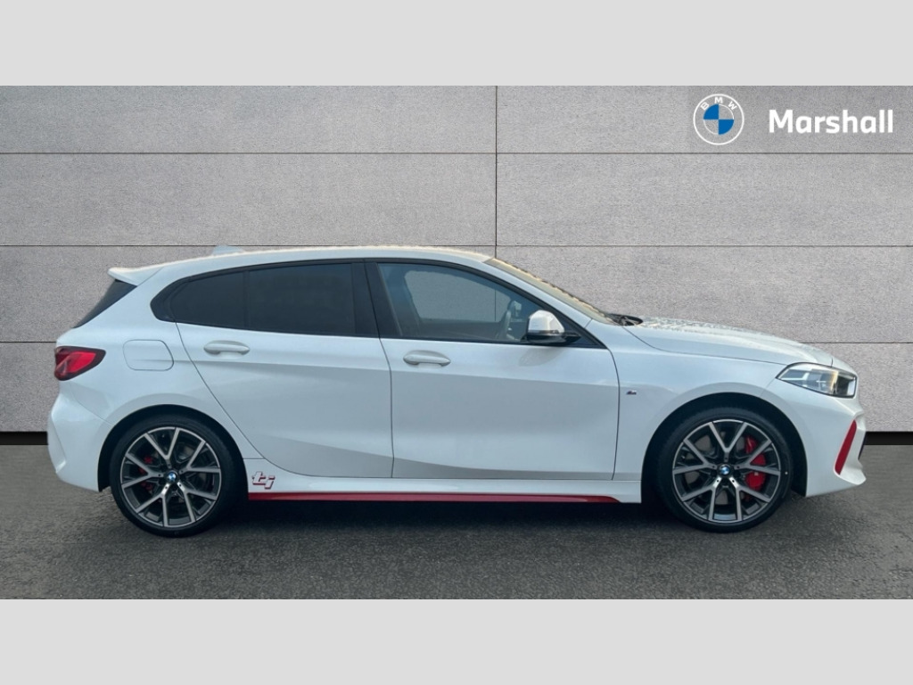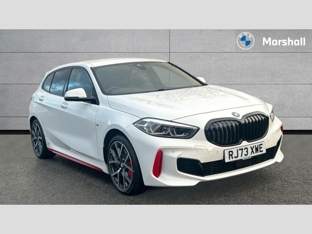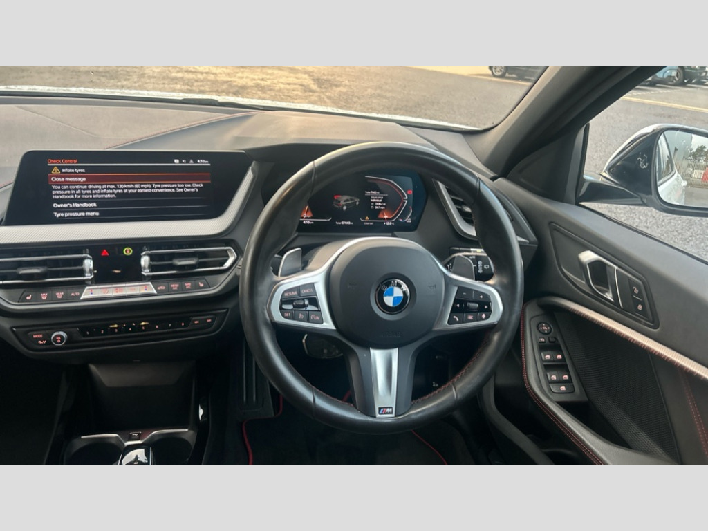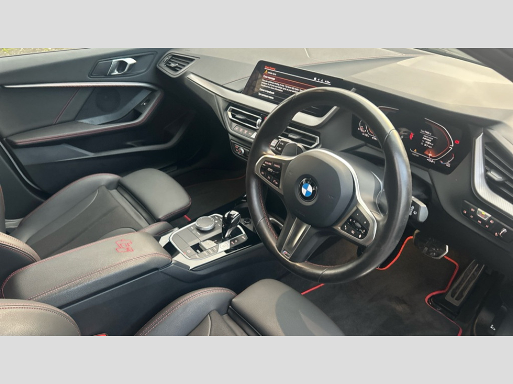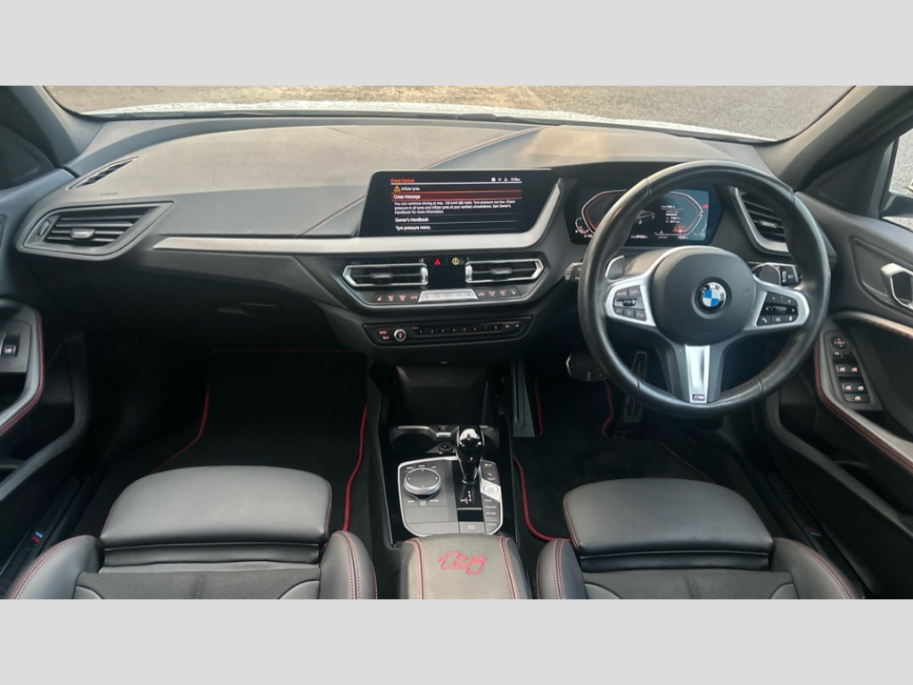 BMW 1 Series 128ti 5dr Step Auto [Live Cockpit Professional] Active guard plus, Attentiveness assist, BMW ConnectedDrive online services, BMW Teleservices, Check Control warning system for monitoring of lights and door/luggage compartment open warning, Cruise control with speed limiter, Eco pro mode, Electric power steering with Servotronic steering optimised at all speed ranges, Front axle single joint with specific axle kinematics to minimise drive influences on steering + provide increased rigidity agile driving behaviour, Integrated owners handbook, Lane departure warning system, Oil sensor for level and grade, On board computer, Optimum shift indicator, Personal Profile, Pull away assistant, Rigidly mounted rear subframe - Multi link construction with separate spring / damper configuration and excellent driving characteristics, Speed limit Info including no-overtaking indicator, Aluminium lightweight construction, Anti roll bar front and rear, Balancer shaft, Double VANOS twin scroll turbocharging system, Drive Performance Control, Eight speed sport automatic transmission with gearshift paddle switches, Electronic differential lock, High precision injection, Larger fuel tank capacity (50 litres), M sport suspension with M128i xDrive specific settings, Petrol Particulate Filter, Twin tube gas filled shock absorbers with degressive characteristic curve, VALVETRONIC engine management, DAB Digital radio, Auto dimming rear view mirror, Automatic headlight beam throw control, Automatic windscreen wipers and automatic headlight, Black chrome tailpipe finishers, BMW individual high gloss shadow line with extended content, Body colour door handles, Body colour mirror caps, Body colour roof trims, Chrome 'M' logo side designation, Direction indicator side lights in exterior mirrors, Electrically adjustable exterior mirror with mirror adjustment switch on drivers armrest and aspheric on driver side, convex on passenger side, Fading support, Folding side mirrors with auto dimming/folding wing mirrors with auto dimming, Follow me home headlights, Front and rear bumper system with replaceable deformation elements, Front and rear electric windows with open and close fingertip control, anti trap facility and comfort closing, Front door sill finishers in black plastic with M designation in metallic look, Green tinted heat protection glazing, High gloss shadowline window frame, Recess cover mirror frames and B/C pillar embelisher trim, High level third brake light, Integrated front windscreen with washer jets, Kidney frame and struts in high gloss black extended, LED daytime running lights, LED eyebrow turn indicators, Lightweight engineering, Matt black air guide grilles, Matt black wheel arch trim, Model designation on electric bootlid, Nearside reverse light in rear light cluster, Preparation for high beam assistant, Rear fog lights, Rear side wing doors, Rear window wiper, Shark fin antenna, Trailer stabilisation logic, Visible VIN plate, Welcome lighting, 12V power socket in front centre console with blanking plug, 3 rear seat head restraints, 3 seat bench in 2nd row, Anthracite headlining, Black boot net with lashing eyes, Cargo function on 2nd seat row, Child seat ISOFIX attachment for two outer rear seats and front passenger seat with anchorage points, Conditioned based service, Driver and front passenger backrest net on rear, Driver and front passenger seat heating, Driver side folding compartment in instrument panel, Folding rear clothes hook, Four grab handles integrated in roof lining, Front and rear door pockets with bottle holders, Front and rear side armrest integrated into door trim, Front armrest, Front sports seats, Glove compartment, Height adjustable front head restraints, Luggage compartment for bag hooks on left and right, foldable luggage compartment liner and four lashing eyelets, Manual adjust steering wheel, Multi-function controls for steering wheel, Single front passenger seat, Storage compartment in centre console, Storage compartment in luggage compartment, Stowage of the parcel shelf in luggage compartment trim, Sun visors with vanity mirrors and insert tab, Three spoke M sport design multi function leather steering wheel in unique red stitching, Two front centre console cupholders, Two zone automatic air conditioning, Type C two USB ports in rear centre console, Additional interior lighting pack - 1 Series, BMW live cockpit professional pack- 1 Series, Connected pack professional - 1 Series, Interior lights pack - 1 Series, M Sport exterior styling aerodynamics pack - 1 Series, 2 tone horn, 3 point seatbelts on all seats, front pyrotechnic belt tensioners, stopper and belt force limiters, rear coded belt buckles, Airbags - Front driver/passenger, front and rear curtain head protection, front side, manual deactivation of front passenger airbag, Anti lock braking system (ABS) with brake assist, BMW emergency call, Brake drying, Braking readiness, Child proof locking system in rear door, City braking function, Comfort modes, Cornering brake control, Crash sensor activating of airbags, Unlocking doors, hazard warning lights, interior light, safety battery terminal, Driver and front passenger seat belt security check, Dynamic stability control + (DSC+), Dynamic Traction Control - DTC, Electrically operated hand brake including automatic hold function, Front and rear disc brakes, M Sport brakes with red calipers, M Sport seatbelts, Seatbelt warning, Side impact protection, Tyre pressure monitoring system, Warning triangle and first aid kit, Central locking switch for all doors, fuel filler cap and luggage compartment, Deadlocking function system to all doors, Drive away locking system on all doors and luggage compartment with de-activated in iDrive settings, Locking wheel bolts, Remote control with integrated key with High-gloss Black inlay and M designation and 1 button for open/ close lock, window, open luggage compartment, Start/stop button illuminated in centre console w