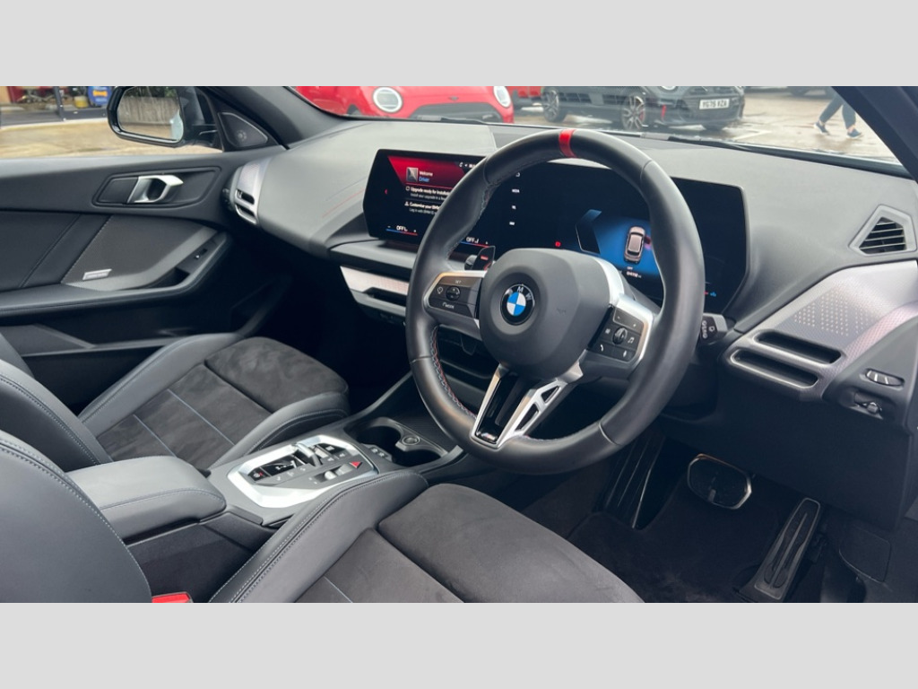 BMW 1 Series M135 xDrive 5dr Step Auto Active guard plus, Attentiveness assist, Bluetooth / WiFi interface for wireless connection of mobile terminal devices and audio streaming, BMW ConnectedDrive online services, BMW Live cockpit plus, BMW Teleservices, Check Control warning system for monitoring of lights and door/luggage compartment open warning, Eco pro mode, Electric power steering, Electro hydraulically controlled multi-plate clutch transfers drive to rear axle and with power take-off device located on the front differential., Energy efficient operating strategy, Evasion assistant, Flat airvents in instrument panel with adjustable slats, Front and rear parking sensors, Front axle single joint with specific axle kinematics to minimise drive influences on steering + provide increased rigidity agile driving behaviour, Gearshift time display in manual mode, Integrated owners handbook, Left turn warning with brake function, M Sports steering with M135i xDrive specific settings, My modes (Personal / Efficient / Sport), Oil sensor for level and grade, On board computer, Optimum shift indicator, Park assist including reversing assistant, lateral parking aid and reversing assist camera, Personal e-SIM, Personal Profile, Pull away assistant, Rigidly mounted rear subframe - Multi link construction with separate spring / damper configuration and excellent driving characteristics, Speed limit Info including no-overtaking indicator, Speed limiter, Sporty fast gear shifting in sport mode, 49 litre fuel tank, Aluminium lightweight construction, Anti roll bar front and rear, Balancer shaft, Double VANOS, Drive Performance Control, Electronic differential lock, Electronic selector lever, Engine cover with M performance designation, High precision injection, Launch control, M Adaptive suspension, M135i specific heavily de-throttled engine intake air guide, M135i specific high-performance cooling package, M135i specific larger turbocharger with integrated divert-air valve, Petrol Particulate Filter, Steptronic transmission with double clutch, Twin tube gas filled shock absorbers with degressive characteristic curve, VALVETRONIC engine management, Variable, stepless and infinitely adjustable distribution of drive torque between the front and rear axles, xDrive intelligent all wheel drive with M135i specific reinforced components, DAB Digital radio, Harman/Kardon surround sound audio system with 12 speakers, Auto dimming rear view mirror, Automatic windscreen wipers and automatic headlight, Body colour door handles, Body colour roof trims, Cerium grey exterior mirror caps, Direction indicator side lights in exterior mirrors, Electrically adjustable exterior mirror with mirror adjustment switch on drivers armrest and aspheric on driver side, convex on passenger side, Exhaust tailpipe, Cerium Grey with bevelled finish - twin, round 100mm, left and right split, Fading support, Folding side mirrors with auto dimming/folding wing mirrors with auto dimming, Follow me home headlights, Front and rear bumper system with replaceable deformation elements, Front and rear electric windows with open and close fingertip control, anti trap facility and comfort closing, Front door sill finishers with M135i designation, Green tinted heat protection glazing, Heated rear window, High gloss shadowline window frame, Recess cover mirror frames and B/C pillar embelisher trim, High level third brake light, Integrated front windscreen with washer jets, Kidney grille frame in Cerium Grey with Mesh design, LED daytime running lights, LED eyebrow turn indicators, LED Headlights, Lightweight engineering, M Performance exhaust system with valve control and minimised exhaust back pressure, M Performance specific setup, M rear spoiler in high gloss black, M sport roof spoiler, Matt black air guide grilles, Matt black wheel arch trim, Model badge on tailgate right, Nearside reverse light in rear light cluster, Preparation for high beam assistant, Rain sensor, Rear fog lights, Rear side wing doors, Rear window wiper, Reinforced crank drive, new pistons and adapted con rods, Shark fin antenna, Sun protection glass, Trailer stabilisation logic, Visible VIN plate, Welcome lighting, 12V power socket in front centre console with blanking plug, 3 rear seat head restraints, 3 seat bench in 2nd row, 3 spoke Walknappa leather steering wheel, decorative stitching, badge, pearl chrome finish, thumbnails, red centre and black/red high gloss paddles, Anthracite front and rear floor mats, Anthracite headlining, Black boot net with lashing eyes, Cargo function on 2nd seat row, Child seat ISOFIX attachment for two outer rear seats and front passenger seat with anchorage points, Conditioned based service, Driver and front passenger backrest net on rear, Driver and front passenger seat heating, Driver side folding compartment in instrument panel, Folding rear clothes hook, Footrest and pedals in black plastic, Four grab handles integrated in roof lining, Front and rear door pockets with bottle holders, Front and rear side armrest integrated into door trim, Front armrest with storage compartment, Glove compartment, Height adjustable front head restraints, Luggage compartment for bag hooks on left and right, foldable luggage compartment liner and four lashing eyelets, Manual adjust steering wheel, Multi-function controls for steering wheel, Rear seat backrest with manual 60:40 split folding with 3 top tether clips integrated on rear of seat panels, Single front passenger seat, Storage compartment in centre console, Storage compartment in luggage compartment, Stowage of the parcel shelf in luggage compartment trim, Sun visors with vanity mirrors and insert tab, Two front centre console cupholders, Type C two USB ports in rear centre console, Upper retaining strap integrated into backrest rear panels, Connected pack professional - 1 Series, Interior lights pack - 1 Series, M Sport exterior styling aerodynamics pack - 1 Series 135i, 2 tone horn, 3 point seatb