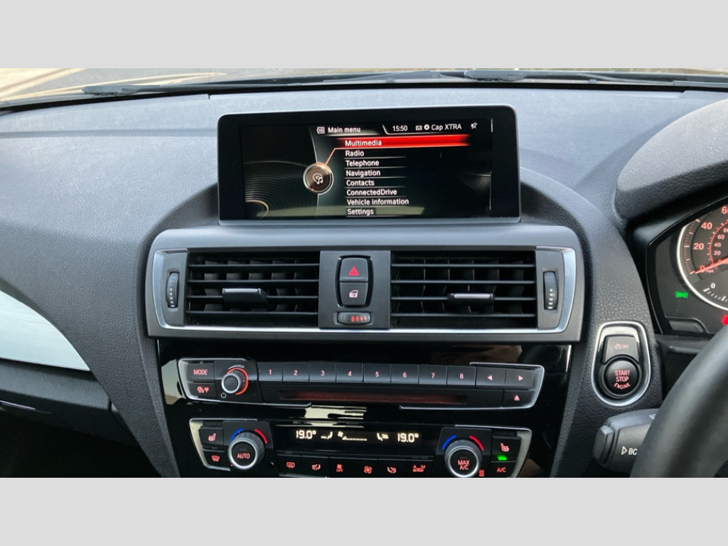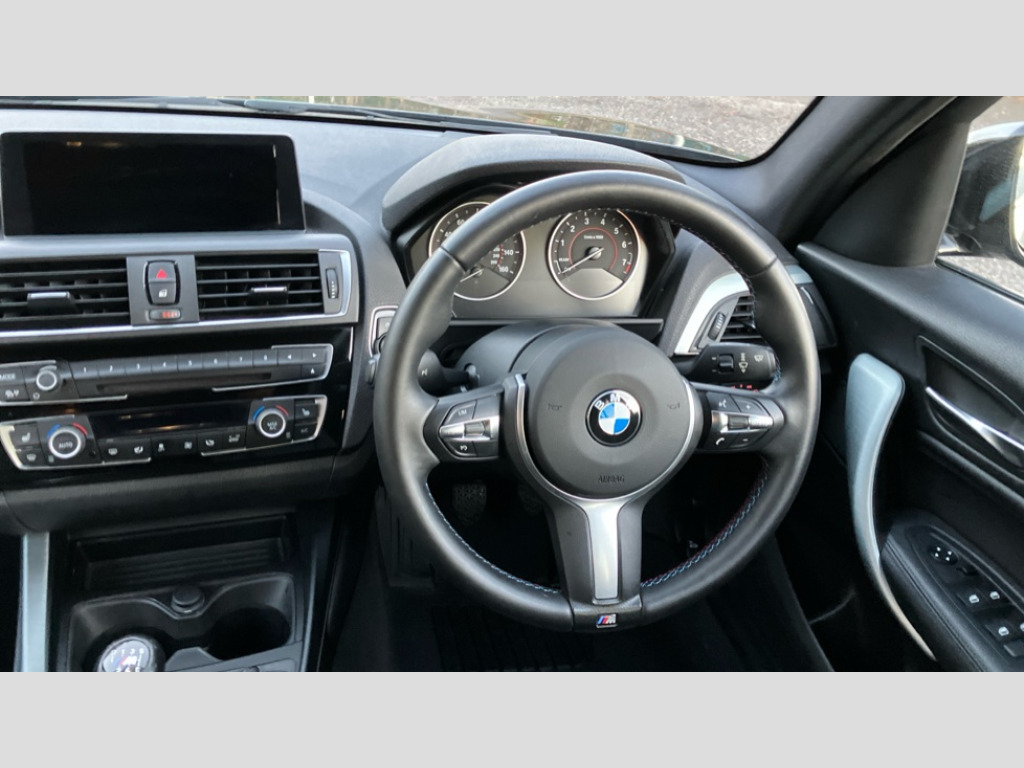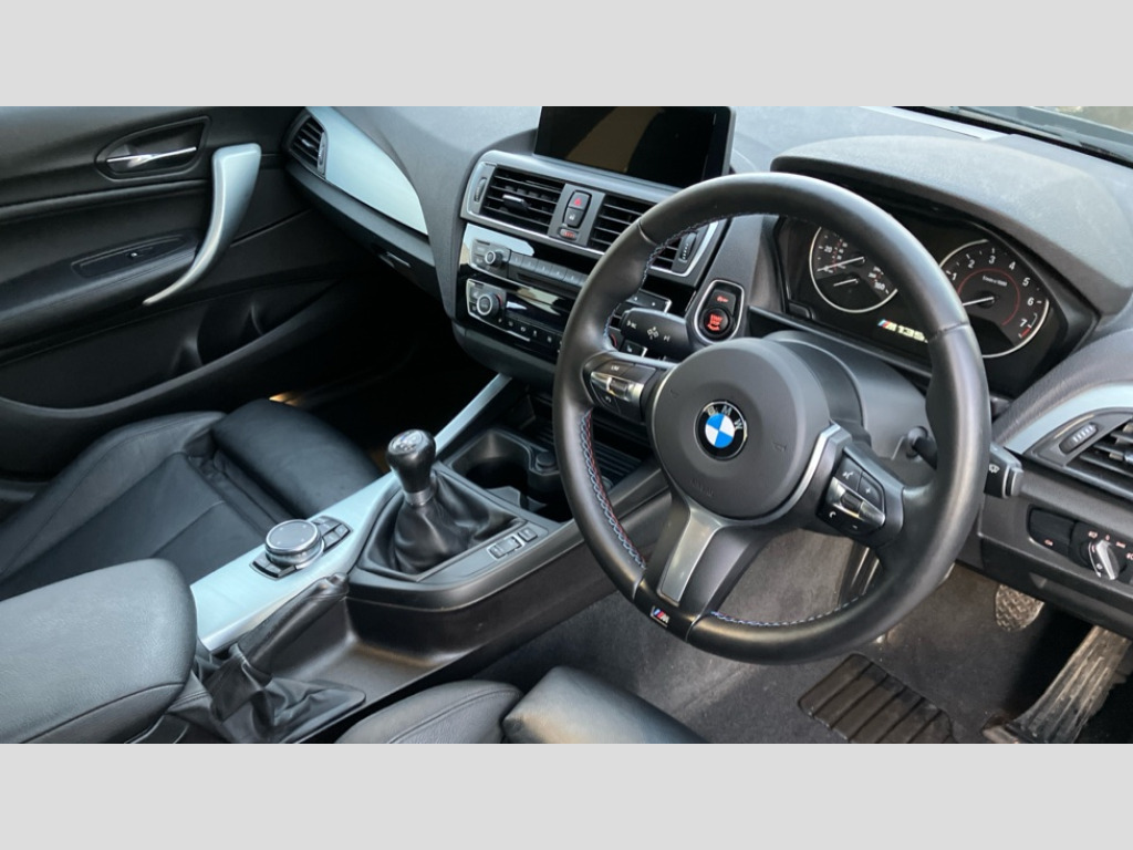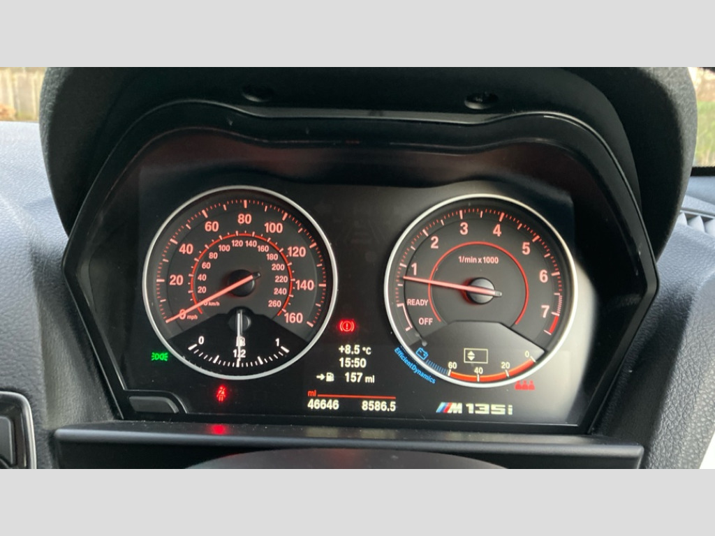 BMW 1 Series M135i 5dr 'Lights On' Reminder warning buzzer, BMW Teleservices, Brake force display, Engine start/stop button, Oil level indicator, On board computer, On board diagnostics, Outside temperature display, Service interval indicator, Speed limiter, Variable sport steering, Drive Performance Control, Auxiliary point for auxiliary devices, BMW professional radio with CD player, DAB Digital radio, Body colour bumpers, Body colour door handles, Chrome kidney grille with black vertical slats, Dark chrome plated exhaust tailpipes, Electric front windows + one touch + anti-pinch, Electric rear windows, Electrically adjustable door mirrors, Ferric grey mirror caps, Follow me home headlights, Green tinted heat insulating glass, Heated door mirrors, Heated windscreen washer jets, M aerodynamic bodystyling, Rain sensor including auto headlights activation, Rear wash/wipe, Welcome lighting, 12V power socket in centre console, 12V power socket in passenger footwell, 4 grab handles, 60/40 split rear seats, Anthracite Velour floor mats, Dakota leather upholstery, Door armrests, Door sill finishers with M135i designation, Driver/passenger sunvisors with ticket holders, Folding rear seat head rests, Front door storage bins, Front folding/sliding centre armrest with storage, Front head restraints, Front sports seats with electric side bolster adjustment, Front/rear courtesy lights with soft on/off dimming, Full black panel display, Glovebox, Individual anthracite headlining, Isofix rear child seat preparation, Leather gear knob and handbrake grip, Load restraint lashing eyes, Multifunction steering wheel with audio controls, Reach + rake adjustable steering column, Storage compartments in doors, Interior comfort pack - 1 Series, ABS/EBD, Automatic Stability Control (ASC), BMW emergency call, Child locks on rear doors, Cornering brake control (CBC), Crash sensor, Driver/Passenger airbags (Impact dependent), Drivers knee airbag, DSC+, Dynamic brake control, Dynamic Traction Control - DTC, Front passenger airbag deactivation, Front side airbags, Hill start assist, ITS head airbags for front/rear, M Sport braking system, Pyrotechnically pre-tensioned front seatbelts, Seat belt force limiter, Three 3 point rear seatbelts, Tyre pressure monitor, Warning triangle and first aid kit, Automatic drive away locking facility, Electronic immobiliser, Remote central locking, Thatcham Cat.1 alarm, 18" light alloy wheels - M Double spoke style 436M