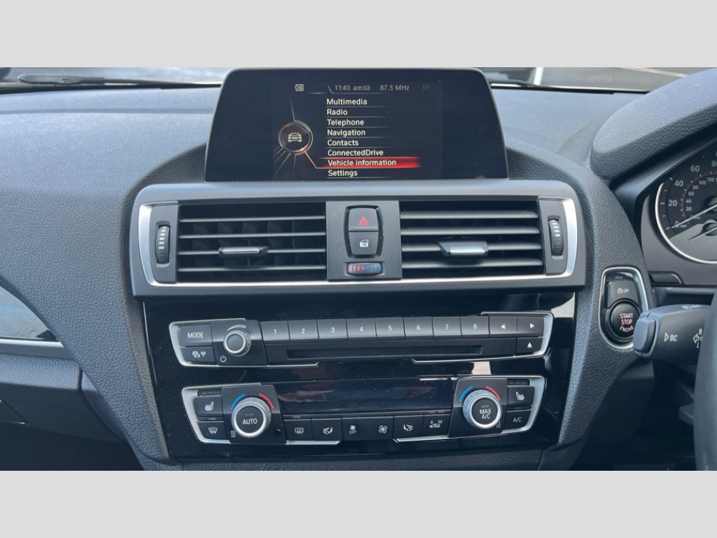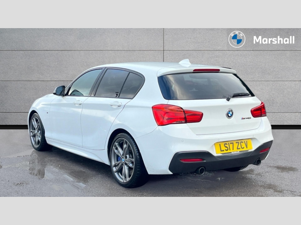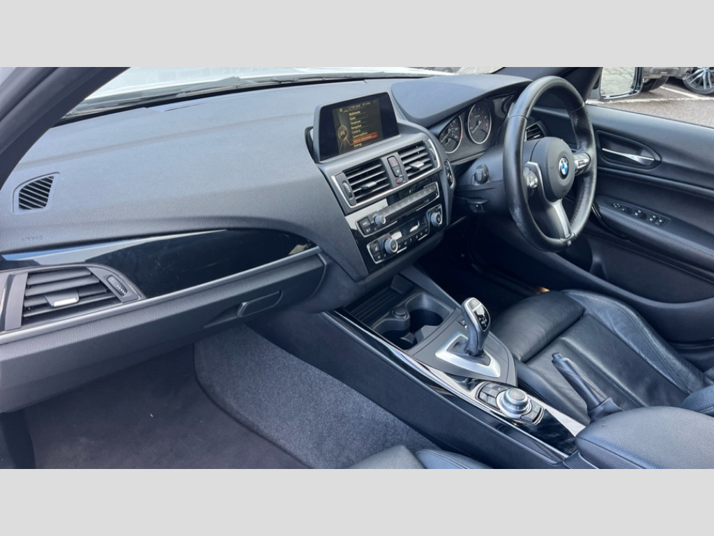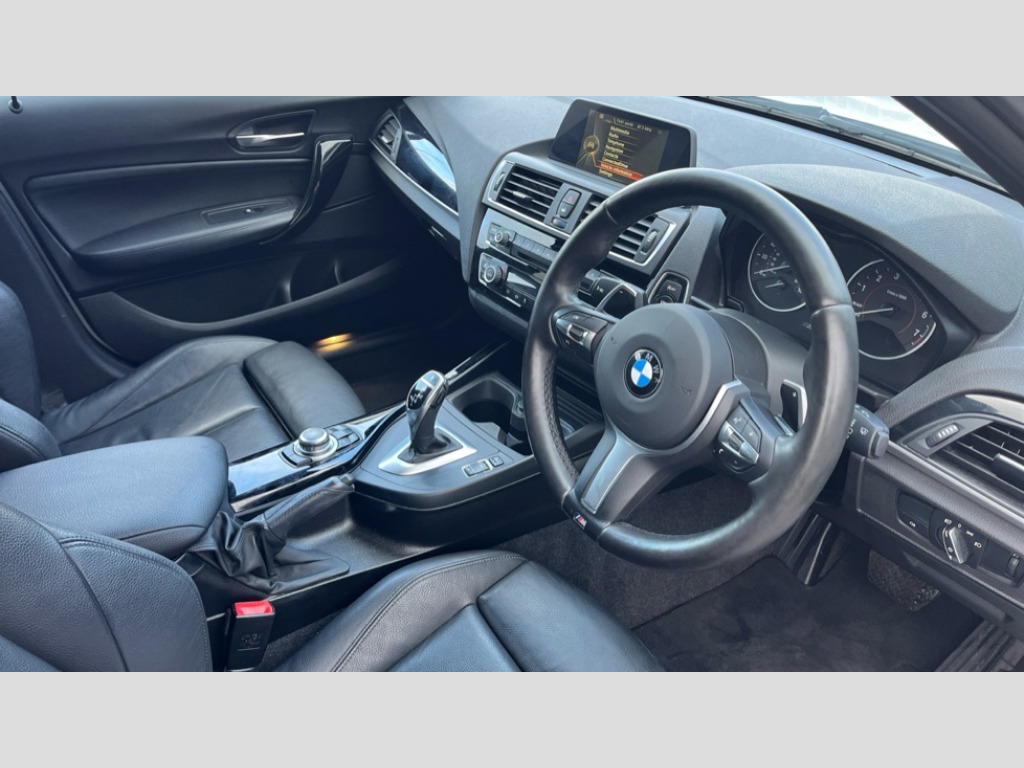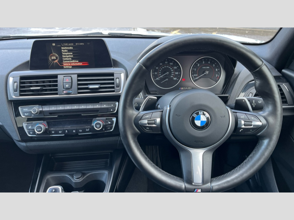 BMW 1 Series M140i 5dr [Nav] Step Auto 'Lights On' Reminder warning buzzer, BMW Online services, BMW Teleservices, Brake force display, Engine start/stop button, Oil level indicator, On board computer, On board diagnostics, Outside temperature display, Service interval indicator, Speed limiter, Variable sport steering, Drive Performance Control, Sports function on gearbox with steering wheel mounted gearshift paddles, Auxiliary point for auxiliary devices, BMW professional radio with CD player, DAB Digital radio, Auto dimming rear view mirror, Body colour bumpers, Body colour door handles, Chrome kidney grille with black vertical slats, Dark chrome plated exhaust tailpipes, Electric front windows + one touch + anti-pinch, Electrically adjustable door mirrors, Ferric grey mirror caps, Follow me home headlights, Green tinted heat insulating glass, Heated door mirrors, Heated windscreen washer jets, M aerodynamic bodystyling, Rain sensor including auto headlights activation, Rear wash/wipe, Welcome lighting, 12V power socket in centre console, 12V power socket in passenger footwell, 4 grab handles, 60/40 split rear seats, Anthracite Velour floor mats, Dakota leather upholstery, Door armrests, Driver/passenger sunvisors with ticket holders, Folding rear seat head rests, Front folding/sliding centre armrest with storage, Front head restraints, Front sports seats with electric side bolster adjustment, Front/rear courtesy lights with soft on/off dimming, Glovebox, Individual anthracite headlining, Isofix rear child seat preparation, Leather gear knob and handbrake grip, Load restraint lashing eyes, M sports leather steering wheel, Multifunction steering wheel with audio controls, Reach + rake adjustable steering column, Storage compartments in doors, Interior comfort pack - 1 Series, ABS/EBD, Automatic Stability Control (ASC), BMW emergency call, Child locks on rear doors, Cornering brake control (CBC), Crash sensor, Driver/Passenger airbags (Impact dependent), Drivers knee airbag, DSC+, Dynamic brake control, Dynamic Traction Control - DTC, Front passenger airbag deactivation, Front side airbags, Hill start assist, ITS head airbags for front/rear, M Sport braking system, Pyrotechnically pre-tensioned front seatbelts, Seat belt force limiter, Three 3 point rear seatbelts, Tyre pressure monitor, Warning triangle and first aid kit, Automatic drive away locking facility, Electronic immobiliser, Remote central locking, Thatcham Cat.1 alarm, 18" light alloy wheels - M Double spoke style 436M