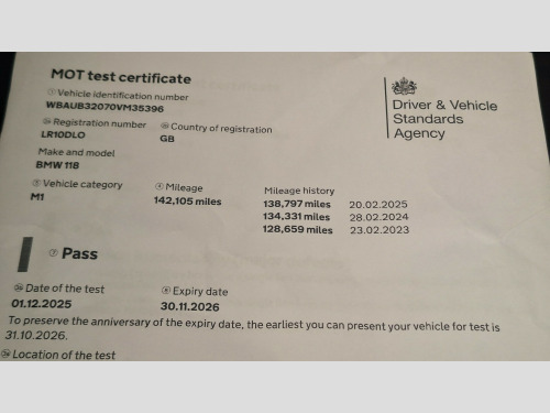 This 2010 BMW 1 Series is a reliable hatchback with a powerful 2.0 118d SE Diesel engine, boasting 143 PS and a fuel-efficient Euro 5 rating. With a mileage of 142,027 miles, this 3-door vehicle comes in a striking Crimson Red color and is equipped with 17in V Spoke Alloy Wheels and RunFlat Tyres for a smooth and safe ride. The interior features 5 comfortable seats and includes modern amenities such as an auto-dimming interior mirror, USB & Audio interface, and has an MOT valid until 09/03/2026. Whether for daily commuting or weekend adventures, this BMW 1 Series offers both practicality and style for any driver., in double spoke alloy wheels style 222, 16in v- spoke alloy wheels- style 229, 16in v- spoke alloy wheels- style 255, 16in v- spoke light alloy wheels style 360, runflat tyres when with larger wheel sizes, 4 seats ilo 5, 5 seats, manual height adjust front seats, model designation deletion, non smokers pack, silver interior trim, smokers pack, three 3 point rear seatbelts, bmw assist- 6 months subscription, bmw business radio with single cd & mp3 player, bmw business radio with single cd player, bmw connecteddrive- assist, bmw connecteddrive- online, bmw online services, halogen headlights, pas, voice control system when with bluetooth telephone preparation with telematics