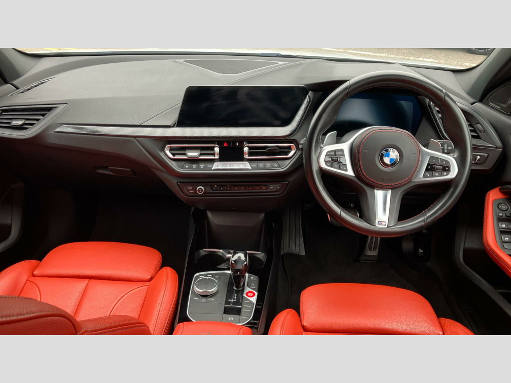 This 2021 BMW 1 Series 128ti boasts a full service history, with its last service completed on 2025-10-02 at 31043 miles, offering excellent provenance for its age. This Euro 6 compliant model features a 2.0L petrol engine and comes with a 12 month warranty and 12 months MOT provided on purchase. Inside, you'll find the BMW Live Cockpit Plus with Bluetooth connectivity, a Harman Kardon loudspeaker system, and striking Perforated Dakota Leather upholstery in Magma Red with Grey Highlight. The 128ti Pro Pack enhances the experience further, and the electrically operated handbrake includes an automatic hold function for added convenience.
