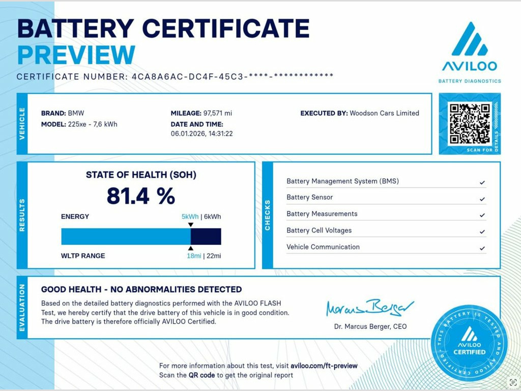 Finance Soft Search Pre Approval. This BMW 225xe 7.6kWh Sport Petrol Plug-In Hybrid Auto 4WD Euro 6 (224bhp) has covered 97000 miles in grey with black leather interior. Pan roof, sat nav, bluetooth, parking sensors, isofix, DAB radio, auto lights, electric boot + much more. *MAIN DEALER PART EXCHANGE* Warranty included. VOSA Mileage History Checked and HPI Clear. Vehicle has received an independent health check with report ++ Any inspection is more than welcome ++ Nationwide Delivery Service Available ++ Credit/Debit Card Accepted ++ Approved Finance Partner with Consumer Credit Licence ++ Call/Message anytime including evenings ++ Facetime/Video Call Available Around Your Schedule ++ Warranty Included. Late Night Appointments Available. Woodson Cars, Manchester. 01618509848 (For Sat Nav use Postcode M44 5AH) Extended Lighting, Comfort Access System, Driving Assistant, 12V Power Socket - Centre Console, 12V Power Socket - Passenger Footwell, 12V Power Socket in Centre Console Rear , 17in Alloy Wheels - Star Spoke - 379, Active Guard, Air Conditioning - Automatic with Two-Zo, Air Curtain, Airbags, Alarm System Thatcham Category 1 with Re, Armrest Front - Free Standing and can be, Automatic Tailgate, BMW ConnectedDrive, BMW ConnectedDrive Online Services, BMW Emergency Call, BMW Navigation, BMW Professional Radio with Single CD Pl, BMW TeleServices, BMW i Badges on Front Wings, Battery Safety Cut Off, Bluetooth Hands Free with USB Audio Inte, Brake Pad Wear Indicator - Front and Rea, Bumper - Rear