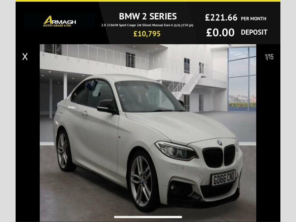 This 2016 BMW 2 Series 2.0 218d M Sport Coupe 2dr Diesel Manual Euro 6 (s Coupe is currently available for £10,795 in Armagh with Diesel engine and Manual gearbox. For more information or to arrange a viewing, click here to send us an email using form below.