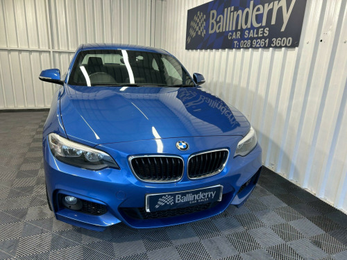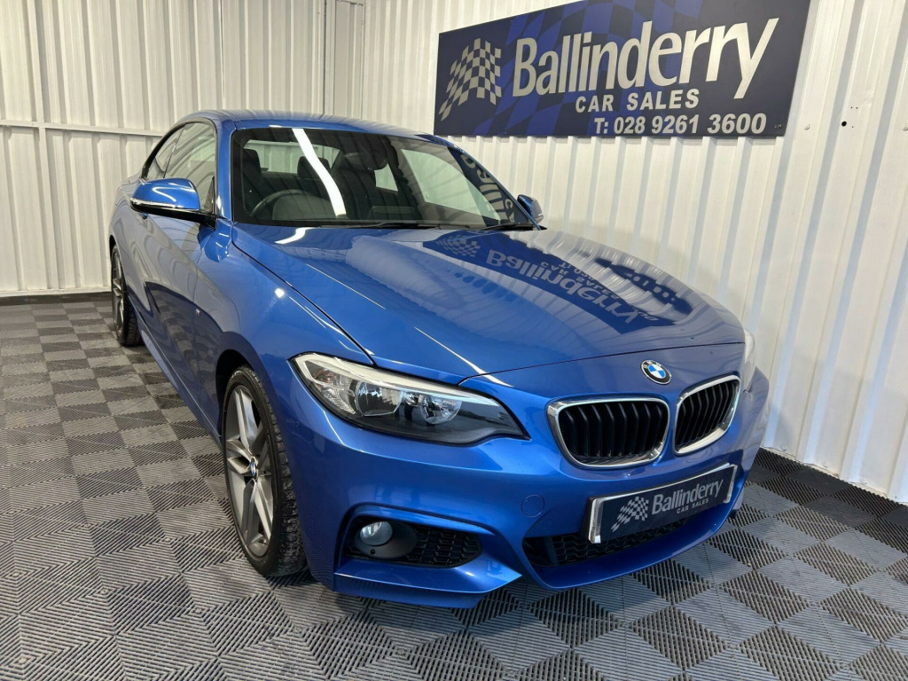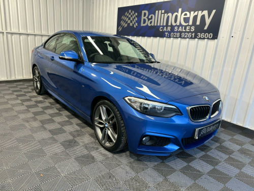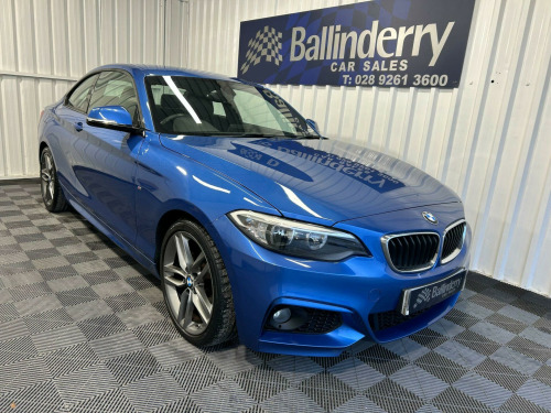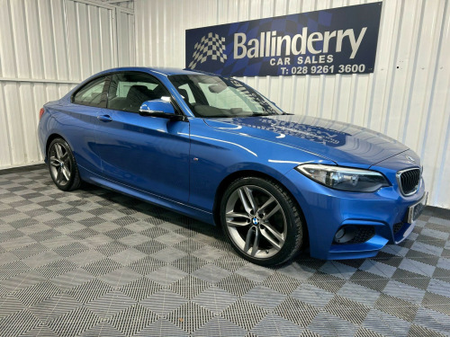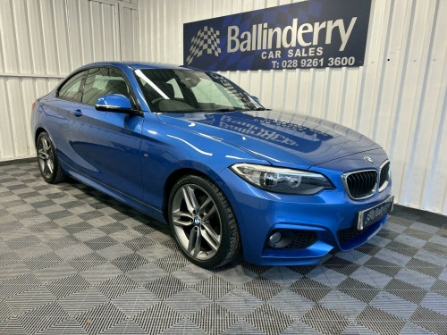 PERFECT EXAMPLE OF THIS BMW 220D M SPORT COUPE AUTO IN ESTORIL BLUE: SPEC INCLUDES:** ONLY £20 ROAD TAX** 18 INCH ALLOYS** PRIVACY GLASS** SAT NAV** SPORTS SEATS** ENHANCED BLUE TOOTHLOW RATE FINANCE DEALS AVAILABLE WITH NO DEPOSIT REQUIRED.ALL TRADE IN`S WELCOMETELEPHONE MARK OR STUART ON 02892 613600 OR 07802 396444. 12V Power Socket - Centre Console, 12V Power Socket - Passenger Footwell, 18in Alloy Wheels - M Double Spoke - 461M, 6.5in Colour Display Screen, ABS - Anti Lock Braking System, ASC - Automatic Stability Control, Air Conditioning - Automatic - Single Zone, Airbags - Driver, Airbags - Front Side, Airbags - Head - Front and Rear, Airbags - Passenger, Airbags - Passenger Deactivation, Alarm System Thatcham 1 with Remote Control, Ambient Light - Front, Ambient Lighting - Switchable BMW Classic Orange - Cold White - LED, Armrest - Front and Rear Integrated into Door Trim, Armrest - Front with Sliding Adjustment, Automatic Lock when Driving Away Selectable, Auxiliary Input, BMW Emergency Call, BMW Professional Radio - Single CD and MP3, BMW TeleServices, Battery Safety Cut Off, Bluetooth - Audio Streaming - with Compatible Devices, Bluetooth Hands Free with USB Audio Interface, Brake Assist, Brake Drying, Brake Pad Wear Indicator - Front and Rear, Bumper System Front and Rear - Replaceable Deformation Elements for Impacts Up to 9mph, Bumpers - Body Colour, CBC - Cornering Brake Control, Central Locking - Remote, Check Control Warning System, Child Seat ISOFIX Attachment - Rear x2, Comfort Go Keyless Engine Start, Crash Sensor, Crash Sensor - Activating Central Locking-Hazard Warning Lights-Fuel Cut Off, Cup Holders - Front x2, DAB Digital Radio, DBC - Dynamic Brake Control, DSC - Dynamic Stability Control Plus, DTC - Dynamic Traction Control, Daytime Running Lights, Door Handles - Body Colour, Door Mirrors - Body Coloured Housing, Door Mirrors - Electric and Heated, Door Sill Finishers - M Designation, Drive Performance Control - ECO PRO - Comfort - Sport - Sport Plus, Dynamic Brake Lights, Electric Windows - Front and Rear with Open-Close Fingertip Control, Engine Immobiliser, Exhaust Tailpipe - Chrome - Dual - Round - Left, Exterior Trim - Chrome, Exterior Trim - High-Gloss Shadowline, First Aid Kit, Floor Mats - Velour, Follow Me Home Headlight Function, Front Fog Lights, Gearshift Lever with M Designation, Glove Box with Chrome Surround and Key Lock, Grab Handles - in Roof Lining x4, Grab Handles with Coat Hooks, Halogen Headlights, Handbrake Lever - Gear Lever Knob and Gaiters in Leather, Head Restraints - Rear and Folding, Headlights - Automatic Activation, Headlights - Beam Throw Control, Headlining - Anthracite, Heat Protection Glazing with Green Tint, Heated Windscreen Washer Jets, High Level Third Brake Light, Hill Start Assist, Incorrect Fuelling Protection System, Kidney Grille - Chrome Extra-Wide High-Gloss Black Vertical Slats, LED Rear Light Bars, LED Tailights, Lights-on Audio Warning, Locking Wheel Bolts, Luggage Compartment - Electric Unlocking via the Keys Remote Control, Luggage Compartment - Lashing Eyes x2, M Aerodynamic Bodystyling, M Sport Package, M Sport Suspension, Multifunction Controls for Steering Wheel, OBC - On-Board Computer, Optimum Shift Indicator, Outside Temperature Display with Ice Warning, PDC - Park Distance Control - Rear, Personal Profile, Power Steering - Electric, Rain Sensor with Automatic Headlight Activation, Reading Lights - Front and Rear, Roof Mouldings - Body Colour, Run Flat Tyres, Seat Belt Security Check for Driver and Front Passenger, Seats - 60-40 Split Folding Rear, Seats - Electric Adjustment for Backrest Side Bolsters, Seats - Front - Manual Height Adjustment, Shark Fin Aerial, Side Impact Protection, Speed Limit Function, Sport Instrument Cluster - Differentiated Dial Design Featuring Finer Chrono-Scaling, Sport Seats - Front, Steering Column with Manual Reach and Rake Adjustment, Steering Wheel - Leather - M Sport, Storage Compartment - Rear Centre Console and in Door Trim - Front, Sun Visors with Illuminated Vanity Mirrors and Ticket Pocket, TPMS - Tyre Pressure Monitoring System, Trim Finisher - Estoril Blue - Matt, Tyres - Reduced Rolling Resistance, USB Audio Interface, Warning Triangle, Welcome Light, 18in Alloy Wheels - M Star Spoke - 461M, ADB Sport - Active Differe.