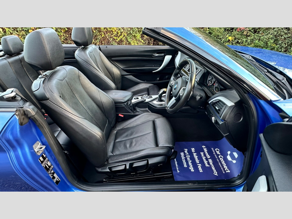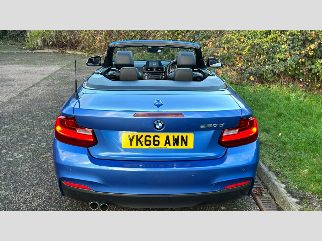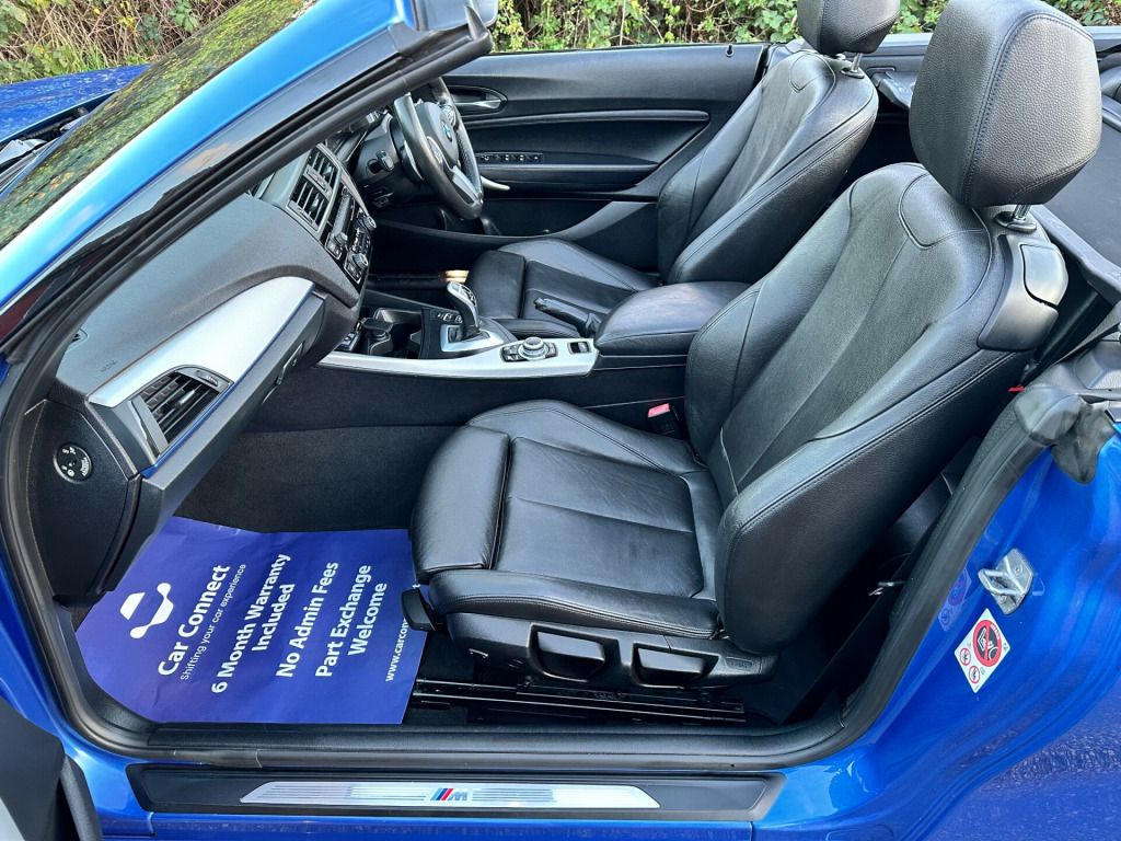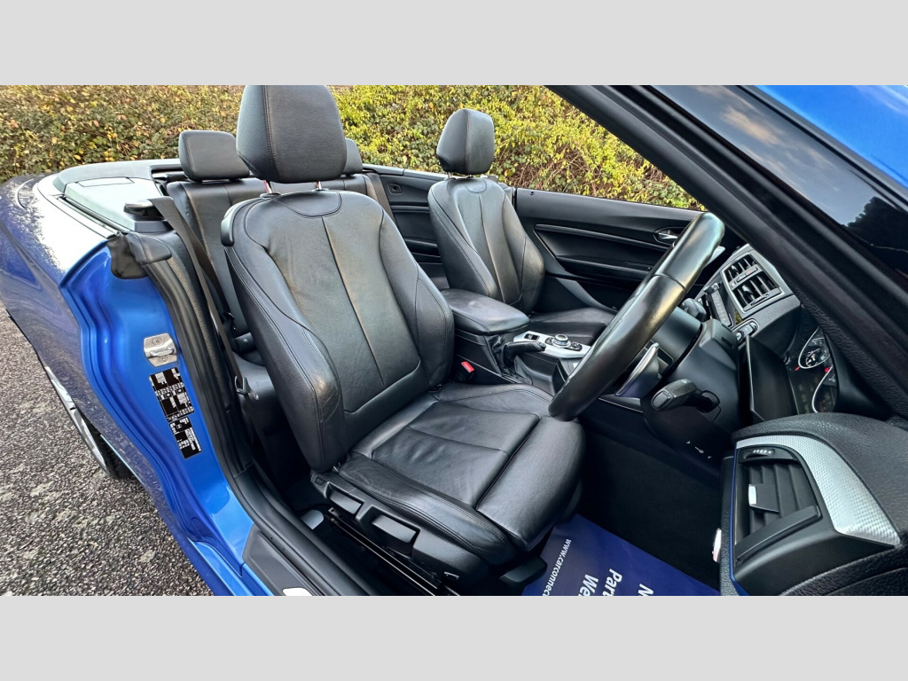 This 2016 BMW 2 Series 2.0 220d M Sport Convertible 2dr Diesel Auto Euro 6 (s/s) (190 ps) is a sleek convertible with just 62000 miles on the clock. This diesel car is ULEZ compliant and comes with an MOT that expires on 29/04/2026. With 4 seats and 2 doors, it's perfect for enjoying the open road. The interior is stylish, featuring Brushed Aluminium with Oxide Silver Matt Finisher trim, while the exterior is finished in Estoril Blue. Additionally, it includes a wind deflector, cruise control with brake function, and PDC - Park Distance Control - Front and Rear. Perfect for those sunny weekend getaways, this BMW 2 Series is the ultimate convertible for any adventure. v power socket - centre console, 12v power socket - passenger footwell, 3.5mm auxiliary input point for auxiliary playing devices, bmw connecteddrive online services, bmw emergency call, bmw navigation, bmw professional radio with single cd player - with mp3 playback compatibility, bmw teleservices, bluetooth hands-free facility with usb audio interface and audio streaming, dab digital radio, full black panel display, rear aerial, shark fin aerial, 18in alloy wheels - m light double spoke - 461m, acoustic soft-top in anthracite, bumper system - front and rear, direction indicator - side repeaters - integrated in exterior mirrors, direction indicator lights - clear lenses, door mirrors - electric and heated, electric windows - front and rear with open-close fingertip control - anti-trap facility and comfort closing function, exhaust tailpipe - chrome - dual - round - left, exterior parts in body colour, exterior trim - high-gloss shadowline, heat protection glazing with green tint, kidney grille - chrome extra-wide eight high-gloss black vertical slats, locking wheel bolts, m aerodynamic bodystyling, m logo designation on front wings in chrome, m sport package, model designation, reversing light in rear light clusters, run flat tyres, tyres - reduced rolling resistance, active differential brake - adb sport - electronic differential lock in dsc-off mode, airbags, alarm system - thatcham 1 with remote control and engine immobiliser, battery safety cut off, child seat isofix attachment for the two outer rear seats, crash sensor, dsc - dynamic stability control plus, dynamic brake lights, first aid kit and warning triangle, incorrect fuelling protection system, remote control with integrated key with insert in blue, seat belt security check for driver and front passenger, side impact protection, three-point seat belts - all seats, visible vin, air conditioning - automatic - single zone, ambient lighting - switchable, armrest - front with sliding adjustment, central locking switch - doors - fuel filler cap - luggage compartment, cup holders x2, door sill finishers - m designation, floor mats - velour, gearshift lever with m designation - short-shift, glove box with chrome surround and key lock, handbrake lever and gear lever in leather, interior lighting - front centre over interior mirror and rear centre, interior trim - aluminium hexagon with estoril blue finisher, lashing eyes in luggage compartment at sill x2, luggage compartment - light, luggage compartment access via bmw roundel, multifunction controls for steering wheel, personal profile - extended, rain sensor with automatic headlight activation, rear fog light, side armrests - front and rear integrated into door trim, sport seats - front, standard seat for driver and passenger with manual adjustment, start-stop button with comfort go keyless engine start and auto start-stop deactivation button, steering wheel - m sport leather multifunction finished in nappa leather, steering-wheel column adjustment - manual, storage compartment - rear centre console and in door trim - front, sun visors with vanity mirrors and ticket holder, twin horns, welcome light, battery age recognition function, brake pad wear indicator, drive performance control - eco pro - comfort - sport - sport plus, eco pro mode, m sport suspension, obc - on-board computer, optimum shift indicator, pdc - park distance control - rear, power steering - electric, sport instrument cluster - differentiated dial design featuring finer chrono-scaling, tpms - tyre pressure monitoring system, check control warning system for monitoring of lights and door-luggage compartment open warning, daytime driving lights, front fog lights, headlights - washer system, high level third brake light, led rear light bars, lights-on warning by audio warning signal when ignition is switched off, xenon headlight package