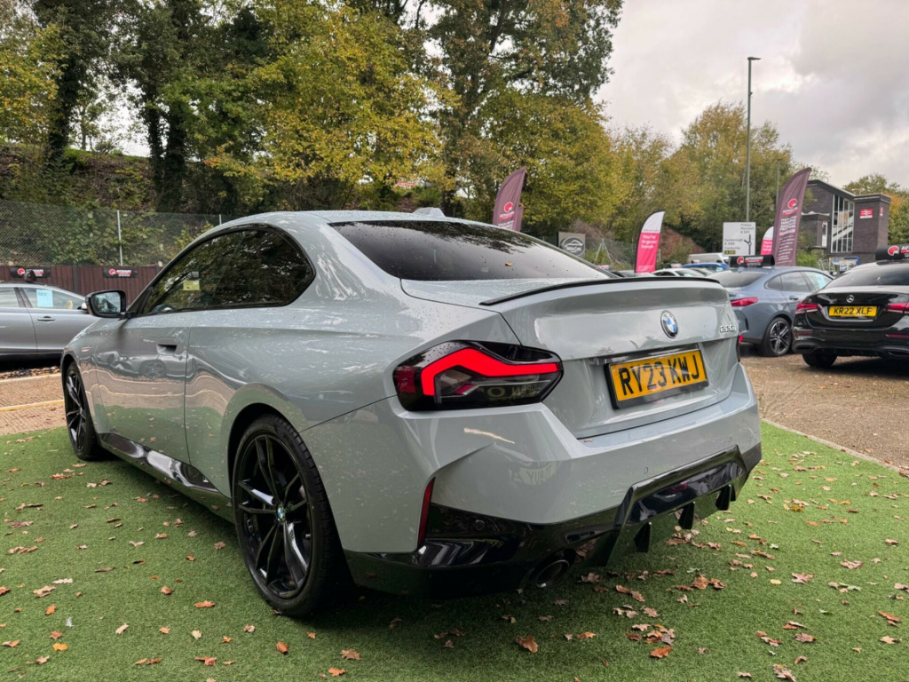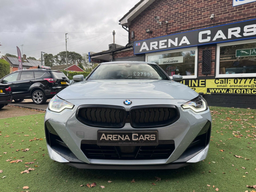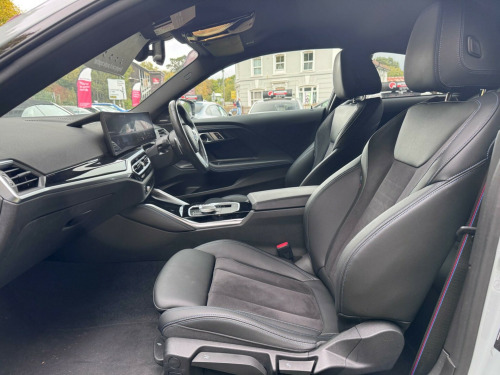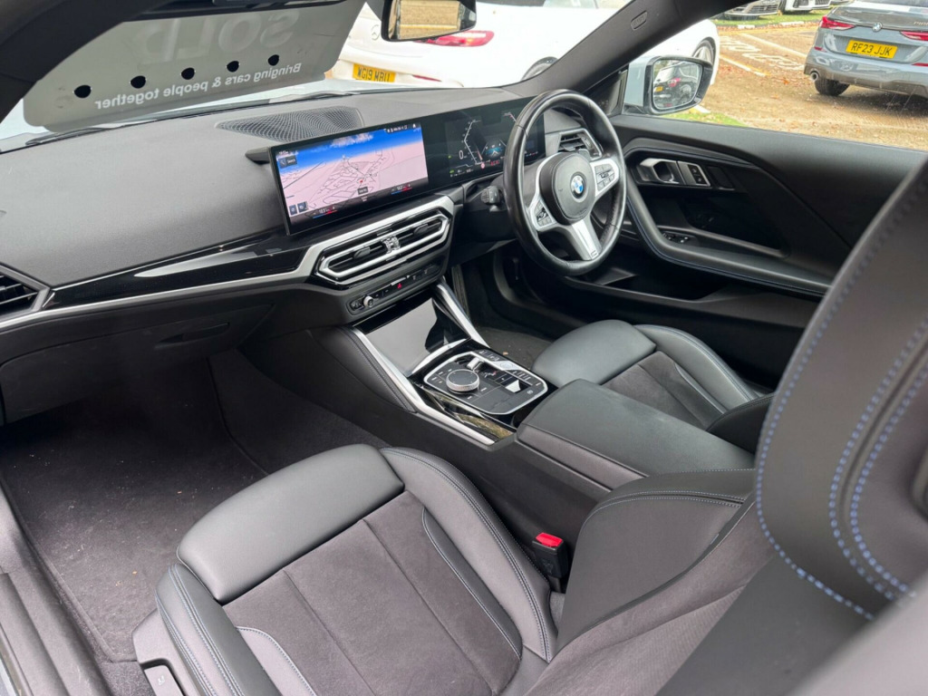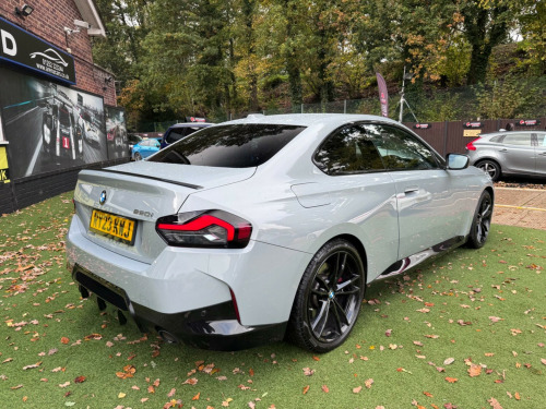 This 2023 BMW 2 Series 220i M Sport is a superb example, having had only one owner since new. This stylish coupe features the M Sport trim and is powered by a 2.0 litre petrol engine, meeting Euro 6 emission standards. Inside, you'll find a premium experience with the Harman Kardon Surround Audio Sound System and heated front seats for added comfort. The M Sport Pro Pack enhances the driving dynamics, while the BMW Connected Package Professional seamlessly integrates your smartphone with Android Auto and Apple CarPlay. Adaptive LED headlights provide excellent visibility, ensuring a sophisticated and practical drive.This particular 220i M Sport stands out with its impressive fuel economy, achieving up to 44 miles per gallon, which is a significant advantage for everyday driving. Furthermore, its low CO2 emissions and low insurance group rating indicate that running costs are kept to a minimum, making it a more economical choice compared to similar vehicles. These highlights collectively demonstrate the thoughtful specification and efficient nature of this well maintained BMW 2 Series. sport pro pack, harman kardon surround audio sound system, sun protection glazing, 19in alloy wheels - double spoke style - 791 m - jet black with mixed tyres, m sport brakes with red calipers, alcantara-sensatec - black with blue-black stitching, 12v power socket in centre console front with blanking plug, 18in alloy wheels - double spoke style - 848 bicolour jet black, acoustic windscreen for reduced driving noise, active guard plus, adaptive led headlights, air conditioning - automatic with three-zone, airbags - driver and front passenger side, airbags - driver and passenger, airbags - head - front and rear, alarm system thatcham category 1 with remote control and engine immobiliser, ambient lighting, armrest - front, attentiveness assistant, automatic windscreen wipers and headlights, automatically dimming rear view mirror, bmw connected package professional, bmw connecteddrive online services, bmw legal emergency call, bmw live cockpit plus, bmw mobility tyre sealing system, bmw teleservices, bluetooth - audio streaming - with compatible devices, bluetooth with usb, bumper system - front and rear, central locking switch - doors - fuel filler cap - luggage compartment, check control system for monitoring of lights and door-luggage compartment open warning, child seat isofix attachment for the two outer rear seats, crash sensor, cruise control with brake function, cupholders - two front centre console, dab tuner, dsc - dynamic stability control - stabilises the vehicle in extreme situations - controls traction, dead-locking function system to all doors, door sill finishers in plastic with bmw designation, drive performance control with eco pro - comfort and sport modes, drive-away locking system on all doors-luggage compartment - can be de-activated in idrive settings, eps - electric power steering, electric windows - front, electrically operated handbrake including automatic hold function - automatic release when driving off, exhaust tailpipe - 2x 90mm - left and right, extended storage, exterior parts in black high-gloss, exterior parts in body colour, exterior trim - high gloss shadowline, first aid kit and warning triangle, floor mats - velour, front passenger airbag deactivation, front sport seats, front windscreen wipers with integrated washer jets, head restraints - rear and folding, headlining - m anthracite, heat protection glazing with green tint, high level third brake light, high-beam assistant, integrated owners handbook - within idrive menu, interior trim - black high gloss, interior and exterior mirror package, kidney grille - one piece - with surround in high-gloss chrome - no vertical kidney bars, led rear lights, led registration plate light, launch control, locking wheel bolts, m aerodynamics package, m sport exterior styling, m sport leather steering wheel, m sport package, m sport suspension, model designation on tailgate - right, oil sensor for level and grade, optimum shift indicator, parking distance control, personal profile, rear fog light, rear seat backrest with manual 40-20-40 split folding, rear seat centre foldable armrest with integrated cup holder, remote control including integrated key - 2, reversing light in rear light clusters, seat belt security check for driver and front passenger, seat belt warning if driver starts ignition without putting on seatbelt, seats - front heated, seats - front sports, shark fin - antenna, side armrests - front and rear integrated into door trim, side impact protection, sport seat geometry for driver and passenger, start-stop button - illuminated in centre console with keyless engine start and auto start-stop deactivation button, steering wheel - gearshift paddles, steering-wheel column adjustment - manual, stereo speaker system, storage features, sun visors with vanity mirrors and insert tab, tpms - tyre pressure monitoring system, three-point seat belts - all seats, through-loading system, two tone horn, tyres - reduced rolling resistance, variable sport steering, visible vin, widescreen multi-media display