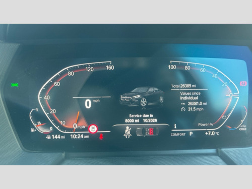 BMW 2 Series 218i [136] M Sport 4dr DCT Active guard plus, Attentiveness assist, Auto start-stop, BMW Intelligent Personal Assistant, BMW Live Cockpit Professional with 10.25" high resolution instrument and control display, BMW Online services, BMW operating system with 7.0 mid interface, BMW Teleservices, Check Control warning system for monitoring of lights and door/luggage compartment open warning, Cruise control with braking function, iDrive controller with 7 short cut favourite buttons on centre console, Integrated navigation data with map data via USB +features such as 3D landmarks and micro city models, Integrated owners handbook, Intelligent voice assistant, Lane departure warning system, M Sports steering, On board computer - average speed+fuel consumption, service interval, clock/date, odometer/trip meter, outside temperature display and ice warning, Optimum shift indicator, Personal Profile, Pull away assistant, Speed limiting function, Aluminium lightweight construction, Balancer shaft, Double VANOS, Drive performance control with ECO PRO comfort + sport mode, Dual clutch automatic transmission, Electronic differential lock, High precision injection, M Sport suspension with stiffer spring/damper set-up and vehicle lowered by 10mm + twin tube gasfilled shock absorbers and Anti roll bars, Performance Control, Petrol Particulate Filter, VALVETRONIC engine management, 2x USB Type C ports (for charging and data transfer), 4G LTE Connectivity with hard wied 4G network sim card, DAB digital radio, MP3 players and RDS double tuner, Auto wipers, Automatic headlight beam throw control, Automatically dimming rear view mirror, Body colour door handles, Body colour mirror caps, Chrome 'M' logo side designation, Chrome exhaust single tailpipe, round, Direction indicator side lights integrated exterior mirrors, Electric windows - front and rear, with open/close fingertip control and trap release, Exterior mirrors - electrically folding with anti-dazzle, Fading support, Follow me home headlights, Front and rear bumper system with replaceable deformation elements, Front door sill finishers in black plastic with M designation in metallic look, Heated, electrically adjustable exterior mirror aspheric on driver side, convex on passenger side, High gloss black B pillar finish, High gloss shadow line exterior trim, High level third brake light, LED daytime running lights, LED front fog lights, LED Headlights, Lightweight engineering, Model designation on right side of tailgate, Preparation for high beam assistant, Rain sensor with automatic headlight activation, Rear boot, Rear fog lights, Rear side wing doors, Reversing light in rear light cluster, Welcome lighting, 12V power socket in centre console, 2 cupholders in front centre console, 3 rear seat head restraints, 3 rear seats, 3 spoke M sports design leather steering wheel finished in nappa leather with specific M badge, Anthracite finished floor mats with contrasting surround, Anthracite headlining, Automatic two zone climate control air conditioning, Child seat ISOFIX attachment for two outer rear seats and front passenger seat with anchorage points, Conditioned based service, Driver and front passenger seat heating, Front and rear door pockets including bottle trays, Front and rear side armrests integrated into door trim, Front armrest foldable with integrated storage compartment, Front centre interior light over interior mirror and rear centre automatic interior light when door is opened/ignition switched off or via remote key, Front head restraints, Front passenger seat, Front sports seats with electric side bolster adjustment, Glove compartment, Glovebox with light, Luggage compartment lighting, Manually adjustment steering wheel column, Multi-function controls for steering wheel, Sun visors with vanity mirrors and insert tab, Through loading system with 40/20/40 split folding rear seat, Two lashing eyes, Additional interior lighting pack - 2 Series Gran Coupe, Extended storage pack - 2 Series Gran Coupe, M Sport exterior styling aerodynamics pack - 2 Series Gran Coupe, 2 tone horn, Airbag - Front driver and passenger, front and rear head, front side, curtain head protection, manual deactivation of front passenger airbag possible, Anti lock braking system (ABS) with cornering brake control, BMW emergency call, Brake drying, Braking readiness, City braking function, Crash sensor activating of airbags, Unlocking doors, hazard warning lights, interior light, safety battery terminal, Dynamic stability control + (DSC+), Dynamic Traction Control - DTC, Electrically operated hand brake, Rear brake discs, Rear child proof door locks, Seat belt security check for driver and front passenger, Seatbelt warning, Side impact protection, Three point seat belts on all seats including front belt stopper, pyrotechnic belt tensioners and belt force limiters, Trailer stability control, Tyre pressure monitoring system, Ventilated front disc brakes, Warning triangle and first aid kit, Central locking switch for all doors, fuel filler cap and luggage compartment, Deadlocking function system to all doors, Drive away locking system on all doors and luggage compartment, Locking wheel bolts, Start/Stop button (illuminated) in centre console with keyless engine start and Auto Start-Stop deactivation button, Thatcham Cat.1 alarm and immobiliser, Two remote control key with integrated key - open/close doors/fuel flap/tailgate +1 button for unlock compartment with M design high gloss black inlay, Contrast stitching on instrument panel, 18" Burnished M double spoke bi-colour alloy wheels finished in orbit grey - style 819M, Reduced rolling resistance tyres