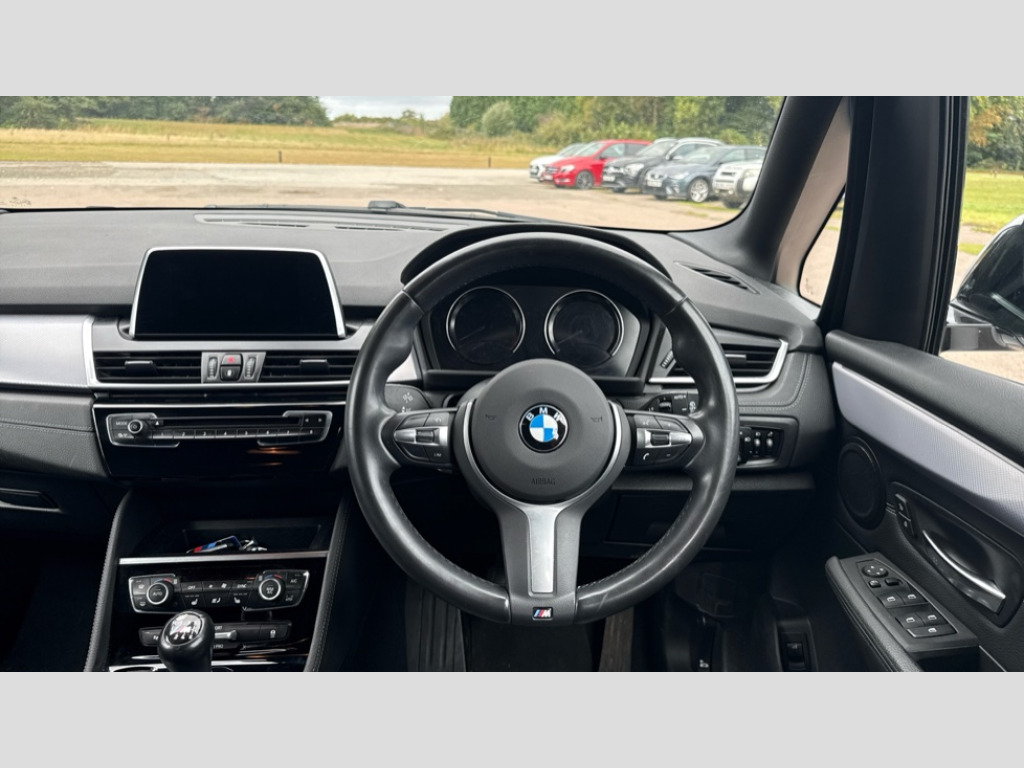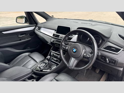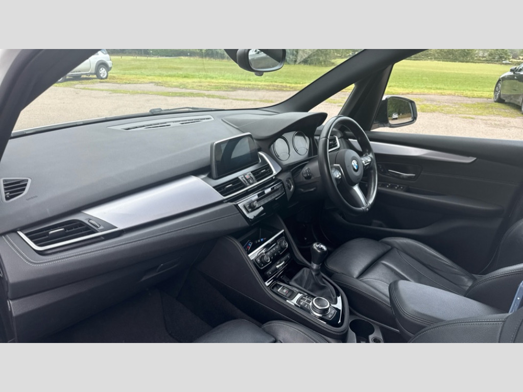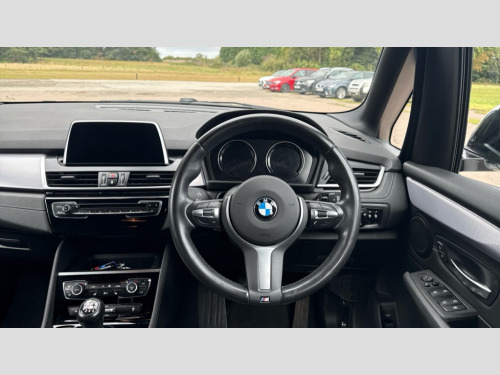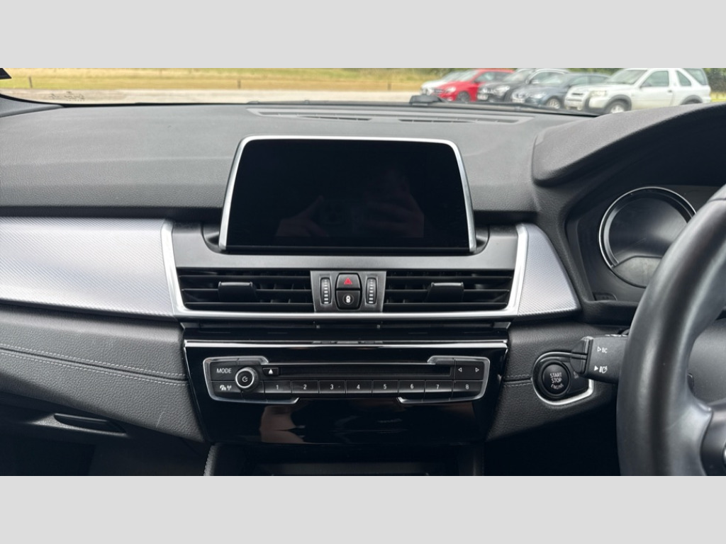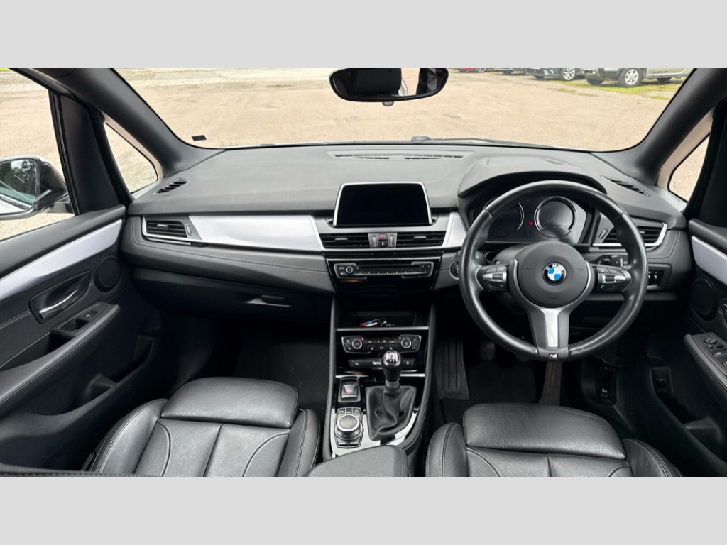 BMW 2 Series 218i M Sport 5dr Active Guard incl speed limiting and lane departure functions with auto steering, and front collision warning with brake intervention, Apple car play, Attentiveness assist, Automatic tailgate operation, BMW Online services, BMW remote services, BMW Teleservices, Brake pad wear indicator in front and rear, Check Control warning system for monitoring of lights and door/luggage compartment open warning, Cruise control with brake assist, Front/rear park distance control (PDC), Instrument cluster with speedometer with miles per hour read out, tachometer and fuel gauge, Lights on warning by audio warning signal when ignition is switched off, On board computer - average speed+fuel consumption, service interval, clock/date, odometer/trip meter, outside temperature display and ice warning, Optimum shift indicator, Park assist system with steering assist, Personal Profile - automatic lock when driving away selectable, Real time traffic information, Service interval indicator, Servotronic variable electric power steering (EPS), Speed limiter, Drive performance control with ECO PRO comfort + sport mode, Electronic differential lock, Intervention on the front axle when DSC deactivated, 2 USB sockets in rear, BMW professional radio/CD/MP3, DAB Digital radio, Body colour - front and rear bumpers, door handles, mirror caps, roof mouldings, Chrome kidney grille with extra wide black, high gloss black vertical slats, Clear lenses direction indicator lights, Direction indicator side lights integrated exterior mirrors, Dynamic brake lights, Electric windows - front and rear, with open/close fingertip control, anti-trap facility and comfort closing, Electrically adjustable door mirrors with aspheric on driver side, convex on passenger side with integrated indicators, Green tinted heat protection glazing, Heated windscreen washer jets, High beam assistant, High gloss shadow line, High level third brake light, LED front fog lights, Lightweight engineering, M aerodynamic body styling with dark shadow elements, M logo designation in side chrome, Model designation, Rain sensor including auto headlights activation, Rear fog lights, Rear window aerial, Rear window wiper integrated under roof spoiler, Reversing light in rear light cluster, Shark fin antenna, Single chrome exhaust tailpipe, Visible VIN plate, Welcome lighting, 12V power socket in centre console + front with blanking plug, Ambiance lighting - switchable, Anthracite headlining, Automatic two zone climate control air conditioning, Central locking switches for door, fuel filler cap and luggage compartment, Child seat ISOFIX attachment for two outer rear seats and front passenger seat with anchorage points, Dakota leather upholstery with perforation and contrast stitching, Folding rear seats, Four grab handles integrated in roof lining, Front and rear side armrest integrated into door trim, Front armrest, Front door sill finishers with M designation, Front head restraints, Front sports seats with electric side bolster adjustment, Gearshift lever with M designation, Glovebox with light, Interior lighting, front centre over interior mirror and rear centre automatic interior light activation when door is opened, Luggage compartment access via BMW roundel, Luggage compartment lighting, M Sport multifunction leather steering wheel, Multi-function controls for steering wheel, Rear centre armrest, Steering wheel column manual adjustment, Sunvisor with ticket holder, Sunvisors with vanity mirrors and ticket pocket, Three rear headrests, Two cupholders, Velour floor mats, Extended storage pack - 2 Series Active/Gran Tourer, Non-smoker package, 3 point seatbelts on all seats, front pyrotechnic belt tensioners, stopper and belt force limiters, rear coded belt buckles, Airbag - Front driver and passenger, front and rear head, front side, curtain head protection, manual deactivation of front passenger airbag possible, Anti lock braking system (ABS) with brake assist, Battery safety cut-off, BMW emergency call, Brake drying, Brake energy regeneration, Braking lock, Braking readiness, Child proof locking system in rear door, Crash Sensor - activates hazard/interior lighting + unlocks doors, Dynamic stability control + (DSC+), Dynamic Traction Control - DTC, Electrically operated hand brake, Front ventilated disc brakes, Hill start assist, Rear disc brakes, Seat belt security check for driver and front passenger, Seatbelt warning, Side impact protection, Twin horns, Tyre pressure monitoring system, Warning triangle and first aid kit, Locking wheel bolts, Remote control with integrated key with silver highlight and M designation, Thatcham 1 alarm system with remote control and engine immobiliser, Contrast stitching on instrument panel, 18" Burnished M double spoke alloy wheels finished in ferric grey - style 486, Reduced rolling resistance tyres, Run flat tyres