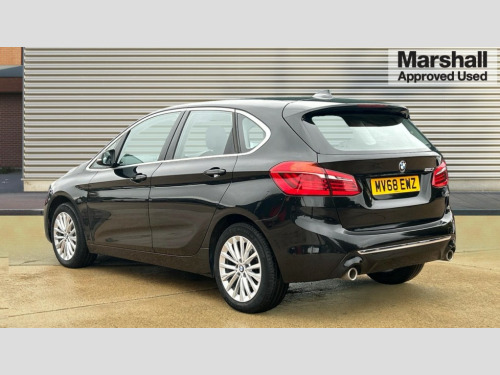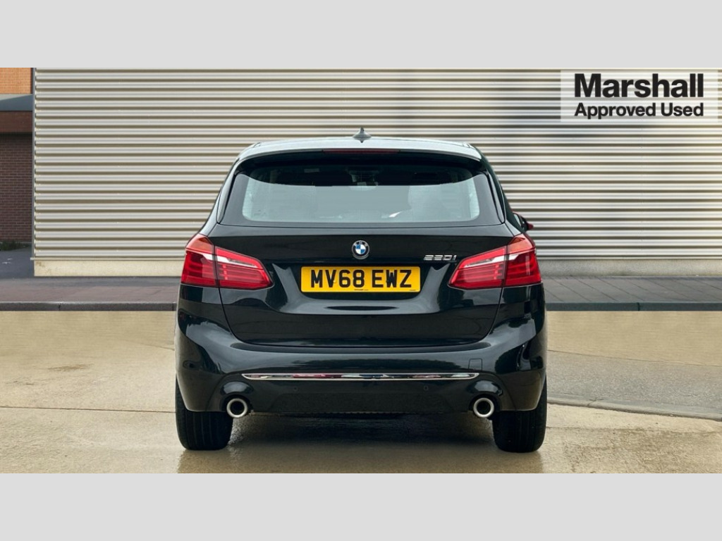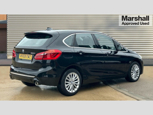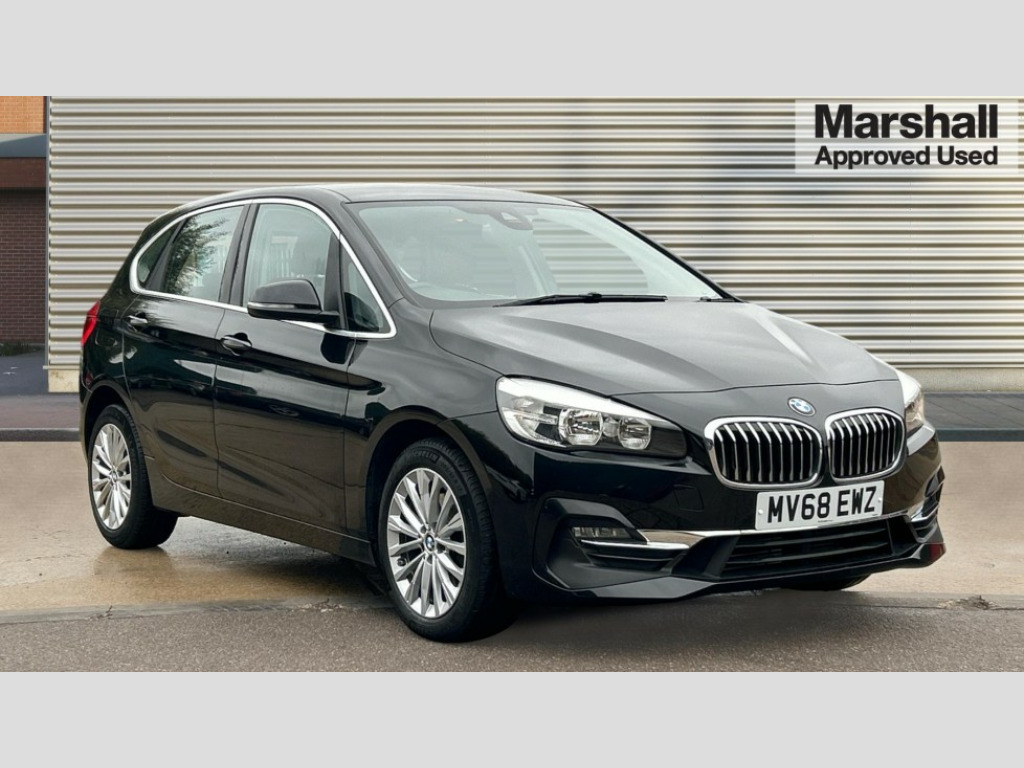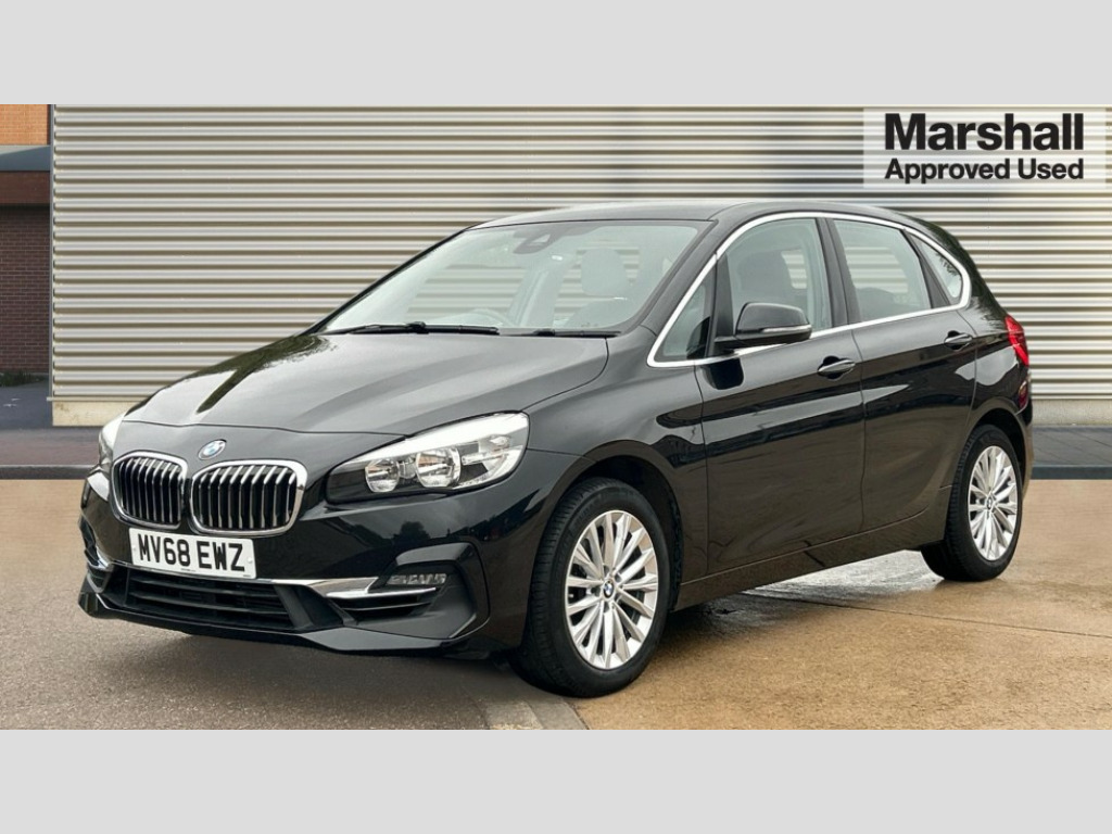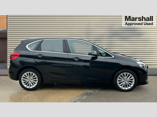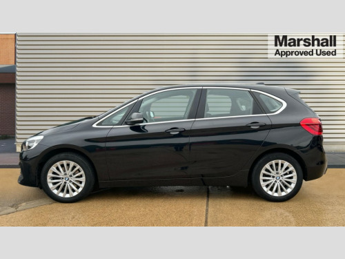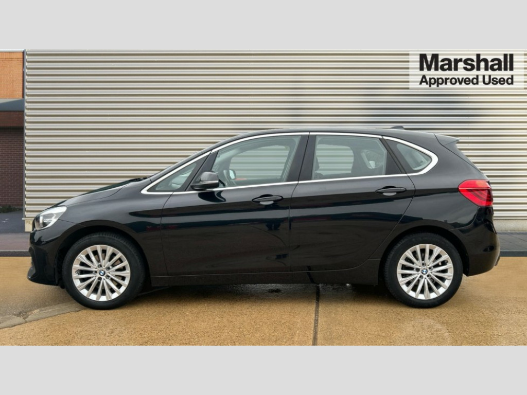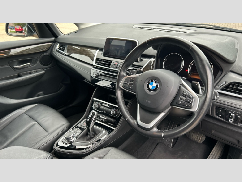 BMW 2 Series 220i Luxury 5dr DCT Active Guard incl speed limiting and lane departure functions with auto steering, and front collision warning with brake intervention, Attentiveness assist, Automatic tailgate operation, BMW Online services, BMW remote services, BMW Teleservices, Brake pad wear indicator in front and rear, Check Control warning system for monitoring of lights and door/luggage compartment open warning, Cruise control with brake assist, Instrument cluster with speedometer with miles per hour read out, tachometer and fuel gauge, Lights on warning by audio warning signal when ignition is switched off, On board computer - average speed+fuel consumption, service interval, clock/date, odometer/trip meter, outside temperature display and ice warning, Personal Profile - automatic lock when driving away selectable, Service interval indicator, Speed limiter, Drive performance control with ECO PRO comfort + sport mode, Dual clutch sport automatic transmission, Electronic differential lock, Intervention on the front axle when DSC deactivated, 2x USB sockets in front, BMW professional radio/CD/MP3, DAB Digital radio, Body colour - front and rear bumpers, door handles, mirror caps, roof mouldings, Clear lenses direction indicator lights, Direction indicator side lights integrated exterior mirrors, Dynamic brake lights, Electric windows - front and rear, with open/close fingertip control, anti-trap facility and comfort closing, Electrically adjustable door mirrors with aspheric on driver side, convex on passenger side with integrated indicators, Exclusive front door sill finishers with BMW designation, Follow me home headlights, Front air inlet with chrome finish, Front and rear bumper system, Green tinted heat protection glazing, Halogen headlights, Headlight beam throw control, Heated windscreen washer jets, High level third brake light, Kidney grille with 12 Chrome fronted vertical slats, LED daytime running lights, LED front fog lights, Lightweight engineering, Rain sensor including auto headlights activation, Rear bumper with chrome finisher, Rear fog lights, Rear window aerial, Rear window wiper integrated under roof spoiler, Reversing light in rear light cluster, Shark fin antenna, Twin chrome exhaust tailpipes, Visible VIN plate, Welcome lighting, 12V power socket in centre console + front with blanking plug, Automatic two zone climate control air conditioning, Central locking switches for door, fuel filler cap and luggage compartment, Child seat ISOFIX attachment for two outer rear seats and front passenger seat with anchorage points, Dakota leather upholstery with perforation and contrast stitching, Four grab handles integrated in roof lining, Front and rear side armrest integrated into door trim, Front armrest, Front head restraints, Glovebox with light, Interior lighting, front centre over interior mirror and rear centre automatic interior light activation when door is opened, LED ambient lighting in door trim, Luggage compartment access via BMW roundel, Luggage compartment lighting, Multi-function controls for steering wheel, Rear centre armrest, Sliding rear seat bench, Steering wheel column manual adjustment, Sunvisors with vanity mirrors and ticket pocket, Three rear headrests, Three spoke sport leather steering wheel, Two cupholders, Velour floor mats, Extended storage pack - 2 Series Active/Gran Tourer, 3 point seatbelts on all seats, front pyrotechnic belt tensioners, stopper and belt force limiters, rear coded belt buckles, Airbag - Front driver and passenger, front and rear head, front side, curtain head protection, manual deactivation of front passenger airbag possible, Anti lock braking system (ABS) with brake assist, Battery safety cut-off, BMW emergency call, Brake drying, Brake energy regeneration, Braking lock, Braking readiness, Child proof locking system in rear door, Crash Sensor - activates hazard/interior lighting + unlocks doors, Dynamic stability control + (DSC+), Dynamic Traction Control - DTC, Electrically operated hand brake, Front ventilated disc brakes, Hill start assist, Rear disc brakes, Seat belt security check for driver and front passenger, Seatbelt warning, Side impact protection, Twin horns, Tyre pressure monitoring system, Warning triangle and first aid kit, Locking wheel bolts, Remote control with integrated key with silver highlight, Thatcham 1 alarm system with remote control and engine immobiliser, Contrast stitching on instrument panel, Reduced rolling resistance tyres
