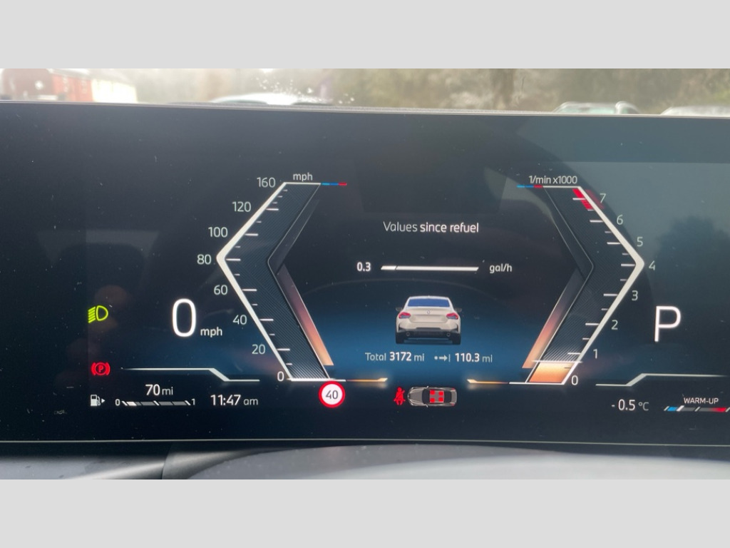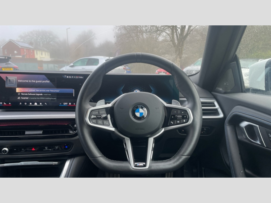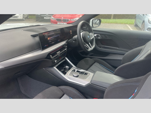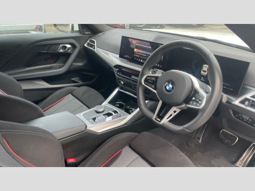 BMW 2 Series 220i M Sport 2dr Step Auto Active guard plus, Attentiveness assist, Bluetooth with USB, BMW ConnectedDrive online services, BMW Intelligent Personal Assistant, BMW Live cockpit plus, BMW Teleservices, Check Control warning system for monitoring of lights and door/luggage compartment open warning, Control Infotainment, Direct selection buttons, Drive off assistant, Electric power steering, eSim with 5G connectivity, Front and rear parking sensors, iDrive controller with turn and press function, Intelligent functions, Oil sensor for level and grade, Optimum shift indicator, Personal Profile, Smartphone integration, Touch operation on control display, Variable sport steering, Widescreen display with 12.3" fully digital instrument cluster and 14.9" control display, WiFi interface for wireless connection of mobile terminal devices, Aluminium lightweight construction, Balancer shaft, BMW TwinPower Turbo four-cylinder petrol engine, Double VANOS, Drive performance control with ECO PRO comfort + sport mode, Electronic differential lock, High precision injection, M sport suspension, Petrol Particulate Filter, Steptronic transmission with gearshift paddles, Twin scroll turbocharger with Valvetronic, 1 x USB Type A with data transfer and 1.5 Ampere charging function in the centre console, 1 x USB Type C with 3 Ampere charging function in the front centre armrest, DAB tuner, Acoustic windscreen wipers for reduced driving noise, Automatic windscreen wipers and automatic headlight, Body colour door handles flush with door surface, Body colour door mirrors, Body colour front and rear bumpers, Daytime running lights, Electric windows - front and rear, with open/close fingertip control and trap release, Exhaust tailpipes x2 - 90mm in left and right, Fading support, Front and rear bumper system with replaceable deformation elements, Front door sill finishers in black plastic with BMW designation, Front windscreen wipers with integrated washer jets, Green tinted heat protection glazing, High gloss black sill, bumper trim sides and diffuser insert, High level third brake light, Indicators integrated int mirror housing, Interior rear-view mirror with automatic anti-dazzle function, LED registration plate light, LED technology rear tail lights, brake lights and turn indicators, M high gloss shadowline, Rear boot, Rear fog lights, Reversing light in rear light cluster, Shark fin antenna, Single part LED rear lights with smoked glass components, Trailer stabilisation logic, Visible VIN plate, 12V power socket in front centre console with blanking plug, 2 cupholders in front centre console, 2 zone automatic air conditioning, Ambient lighting, Conditioned based service, English handbook, Folding rear seat head rests, Front and rear side armrests integrated into door trim, Front armrest, Front door pockets, Front head restraints, Heated front seats, Illuminated glove compartment with separate small compartment, M headliner Anthracite, M sport leather steering wheel, Manually adjustment steering wheel column, Rear seat backrest with manual 40:20:40 split folding, Rear seat centre foldable armrest with integrated cup holder, Single front passenger seat, Storage compartment between rear seats, Storage tray and compartment with cover in centre console, Sun visors with vanity mirrors and insert tab, Through loading system with 40/20/40 split folding 2 rear seat in 2nd row, Velour floor mats, Connected pack professional - 2 Series Coupe, Storage compartment pack - 2 Series Coupe, 2 tone horn, Anti lock braking system (ABS) with cornering brake control, BMW emergency call, Brake drying, Child seat ISOFIX attachment for the two outer rear seats, Crash sensor activating of airbags, Unlocking doors, hazard warning lights, interior light, safety battery terminal, Deactivation of fuel pump in the event of a crash, Driver and front passenger airbags, Driver and front passenger side airbags, integrated in the door side seat backrest bolsters for all seat variants, Dynamic brake control, Dynamic stability control + (DSC+), Dynamic Traction Control - DTC, Electrically operated hand brake including automatic hold function and automatic release when driving off, Front and rear disc brakes, Front centre airbag between driver and front passenger seats, Front passenger airbag deactivation, Head airbags for all 4 outer seats, PC iBrake (Post crash approach control warning with light braking function), Seat belt security check for driver and front passenger, Seatbelt warning, Side impact protection, Three point seat belts on 4 seats including front belt stopper, pyrotechnic belt tensioners and belt force limiters, Tyre pressure monitoring system, Warning triangle and first aid kit, Alarm system (Thatcham 1) with remote control and electronic engine immobiliser, Central locking switch for all doors, fuel filler cap and luggage compartment, Deadlocking function system to all doors, Drive away locking system on all doors and luggage compartment, Locking wheel bolts, Start/Stop button (illuminated) in centre console with keyless engine start and Auto Start-Stop deactivation button, Two remote control key with integrated key - one button for open and close doors/fuel flap/tailgate and separate button for unlock luggage compartment, Electrically powered 12V compressor, Reduced rolling resistance tyres, Tyre repair kit