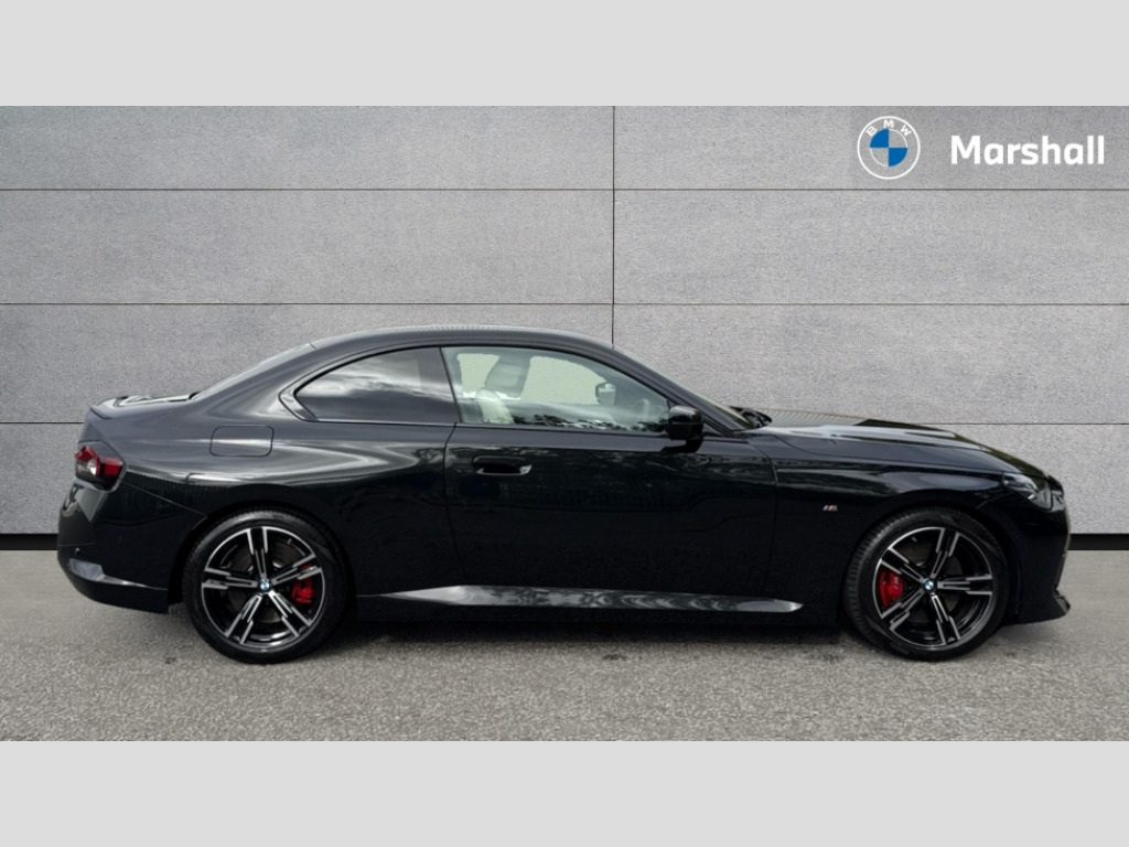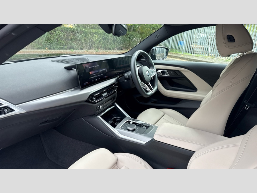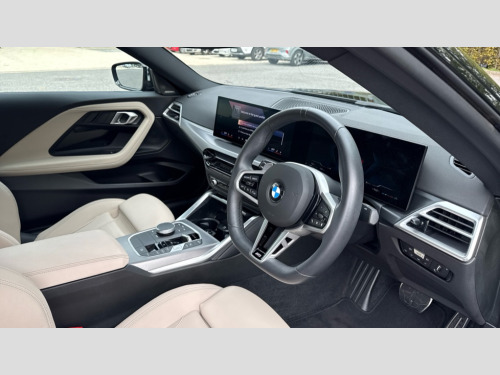 BMW 2 Series 220i M Sport 2dr Step Auto 2 USB connections for charging and transferring data, Active guard plus, Attentiveness assist, Bluetooth with USB, BMW ConnectedDrive online services, BMW Intelligent Personal Assistant, BMW Live cockpit plus, BMW operating system 8 with variable, configurable widgets display information in real time, BMW Teleservices, Check Control warning system for monitoring of lights and door/luggage compartment open warning, Control Infotainment, Direct selection buttons, Drive off assistant, Eco pro mode, Electric power steering, eSim with 5G connectivity, Front and rear parking sensors, iDrive controller with turn and press function, Integrated owners handbook, Intelligent functions, Oil sensor for level and grade, Optimum shift indicator, Personal Profile, Smartphone integration, Touch operation on control display, Variable sport steering, Widescreen multi-media display, WiFi interface for wireless connection of mobile terminal devices, Aluminium lightweight construction, Balancer shaft, BMW TwinPower Turbo four-cylinder petrol engine, Double VANOS, Drive performance control with ECO PRO comfort + sport mode, Electronic differential lock, High precision injection, M sport suspension, Petrol Particulate Filter, Steptronic transmission with gearshift paddles, Twin scroll turbocharger with Valvetronic, DAB tuner, Acoustic windscreen wipers for reduced driving noise, Automatic windscreen wipers and automatic headlight, Body colour door handles flush with door surface, Body colour door mirrors, Body colour front and rear bumpers, Daytime running lights, Electric windows - front and rear, with open/close fingertip control and trap release, Exhaust tailpipes x2 - 90mm in left and right, Extended high gloss shadow line exterior trim, Fading support, Front and rear bumper system with replaceable deformation elements, Front door sill finishers in black plastic with BMW designation, Front windscreen wipers with integrated washer jets, Green tinted heat protection glazing, High beam assistant, High gloss black sill, bumper trim sides and diffuser insert, High level third brake light, Indicators integrated int mirror housing, Interior rear-view mirror with automatic anti-dazzle function, LED registration plate light, LED technology rear tail lights, brake lights and turn indicators, Lightweight engineering, M lights shadowline, One piece kidney grille with hight gloss chrome surround, Rear boot, Rear fog lights, Rear spoiler in black sapphire, Reversing light in rear light cluster, Shark fin antenna, Single part LED rear lights with smoked glass components, Trailer stabilisation logic, Visible VIN plate, 12V power socket in front centre console with blanking plug, 2 cupholders in front centre console, 2 zone automatic air conditioning, Ambient lighting, Compartment in front of cupholder, Conditioned based service, English handbook, Folding rear seat head rests, Front and rear side armrests integrated into door trim, Front armrest, Front door pockets, Front head restraints, Heated front seats, Illuminated glove compartment with separate small compartment, M headliner Anthracite, M sport leather steering wheel, Manually adjustment steering wheel column, Rear seat backrest with manual 40:20:40 split folding, Rear seat centre foldable armrest with integrated cup holder, Single front passenger seat, Storage compartment between rear seats, Storage tray and compartment with cover in centre console, Sun visors with vanity mirrors and insert tab, Through loading system with 40/20/40 split folding 2 rear seat in 2nd row, Velour floor mats, Additional storage compartment pack without USB - 2 Series Coupe, Connected pack professional - 2 Series Coupe, 2 tone horn, Anti lock braking system (ABS) with cornering brake control, Automatic Stability Control (ASC), BMW emergency call, Brake drying, Child seat ISOFIX attachment for the two outer rear seats, Crash sensor activating of airbags, Unlocking doors, hazard warning lights, interior light, safety battery terminal, Deactivation of fuel pump in the event of a crash, Driver and front passenger airbags, Driver and front passenger side airbags, integrated in the door side seat backrest bolsters for all seat variants, Dynamic brake control, Dynamic stability control + (DSC+), Dynamic Traction Control - DTC, Electrically operated hand brake including automatic hold function and automatic release when driving off, Front and rear disc brakes, Front centre airbag between driver and front passenger seats, Front passenger airbag deactivation, Head airbags for all 4 outer seats, M seat belts, PC iBrake (Post crash approach control warning with light braking function), Seat belt security check for driver and front passenger, Seatbelt warning, Side impact protection, Three point seat belts on 4 seats including front belt stopper, pyrotechnic belt tensioners and belt force limiters, Tyre pressure monitoring system, Warning triangle and first aid kit, Alarm system (Thatcham 1) with remote control and electronic engine immobiliser, Central locking switch for all doors, fuel filler cap and luggage compartment, Deadlocking function system to all doors, Drive away locking system on all doors and luggage compartment, Locking wheel bolts, Start/Stop button (illuminated) in centre console with keyless engine start and Auto Start-Stop deactivation button, Two remote control key with integrated key - one button for open and close doors/fuel flap/tailgate and separate button for unlock luggage compartment, Electrically powered 12V compressor, Reduced rolling resistance tyres, Tyre repair kit