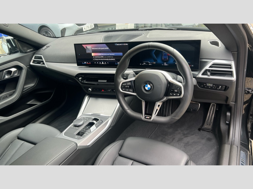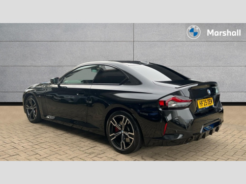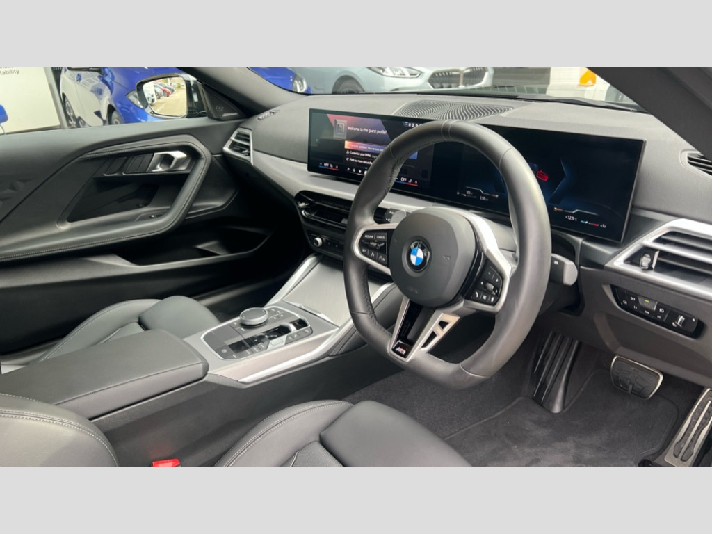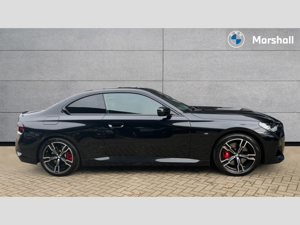 BMW 2 Series 220i M Sport 2dr Step Auto 2 USB connections for charging and transferring data, Active guard plus, Attentiveness assist, Bluetooth with USB, BMW ConnectedDrive online services, BMW Intelligent Personal Assistant, BMW Live cockpit plus, BMW operating system 8 with variable, configurable widgets display information in real time, BMW Teleservices, Check Control warning system for monitoring of lights and door/luggage compartment open warning, Control Infotainment, Direct selection buttons, Drive off assistant, Eco pro mode, Electric power steering, eSim with 5G connectivity, Front and rear parking sensors, iDrive controller with turn and press function, Integrated owners handbook, Intelligent functions, Oil sensor for level and grade, Optimum shift indicator, Personal Profile, Smartphone integration, Touch operation on control display, Variable sport steering, Widescreen multi-media display, WiFi interface for wireless connection of mobile terminal devices, Aluminium lightweight construction, Balancer shaft, BMW TwinPower Turbo four-cylinder petrol engine, Double VANOS, Drive performance control with ECO PRO comfort + sport mode, Electronic differential lock, High precision injection, M sport suspension, Petrol Particulate Filter, Steptronic transmission with gearshift paddles, Twin scroll turbocharger with Valvetronic, DAB tuner, Acoustic windscreen wipers for reduced driving noise, Automatic windscreen wipers and automatic headlight, Body colour door handles flush with door surface, Body colour door mirrors, Body colour front and rear bumpers, Daytime running lights, Electric windows - front and rear, with open/close fingertip control and trap release, Exhaust tailpipes x2 - 90mm in left and right, Extended high gloss shadow line exterior trim, Fading support, Front and rear bumper system with replaceable deformation elements, Front door sill finishers in black plastic with BMW designation, Front windscreen wipers with integrated washer jets, Green tinted heat protection glazing, High beam assistant, High gloss black sill, bumper trim sides and diffuser insert, High level third brake light, Indicators integrated int mirror housing, Interior rear-view mirror with automatic anti-dazzle function, LED registration plate light, LED technology rear tail lights, brake lights and turn indicators, Lightweight engineering, M lights shadowline, One piece kidney grille with hight gloss chrome surround, Rear boot, Rear fog lights, Rear spoiler in black sapphire, Reversing light in rear light cluster, Shark fin antenna, Single part LED rear lights with smoked glass components, Trailer stabilisation logic, Visible VIN plate, 12V power socket in front centre console with blanking plug, 2 cupholders in front centre console, 2 zone automatic air conditioning, Ambient lighting, Compartment in front of cupholder, Conditioned based service, English handbook, Folding rear seat head rests, Front and rear side armrests integrated into door trim, Front armrest, Front door pockets, Front head restraints, Heated front seats, Illuminated glove compartment with separate small compartment, M headliner Anthracite, M sport leather steering wheel, Manually adjustment steering wheel column, Rear seat backrest with manual 40:20:40 split folding, Rear seat centre foldable armrest with integrated cup holder, Single front passenger seat, Storage compartment between rear seats, Storage tray and compartment with cover in centre console, Sun visors with vanity mirrors and insert tab, Through loading system with 40/20/40 split folding 2 rear seat in 2nd row, Velour floor mats, Additional storage compartment pack without USB - 2 Series Coupe, Connected pack professional - 2 Series Coupe, 2 tone horn, Anti lock braking system (ABS) with cornering brake control, Automatic Stability Control (ASC), BMW emergency call, Brake drying, Child seat ISOFIX attachment for the two outer rear seats, Crash sensor activating of airbags, Unlocking doors, hazard warning lights, interior light, safety battery terminal, Deactivation of fuel pump in the event of a crash, Driver and front passenger airbags, Driver and front passenger side airbags, integrated in the door side seat backrest bolsters for all seat variants, Dynamic brake control, Dynamic stability control + (DSC+), Dynamic Traction Control - DTC, Electrically operated hand brake including automatic hold function and automatic release when driving off, Front and rear disc brakes, Front centre airbag between driver and front passenger seats, Front passenger airbag deactivation, Head airbags for all 4 outer seats, M seat belts, PC iBrake (Post crash approach control warning with light braking function), Seat belt security check for driver and front passenger, Seatbelt warning, Side impact protection, Three point seat belts on 4 seats including front belt stopper, pyrotechnic belt tensioners and belt force limiters, Tyre pressure monitoring system, Warning triangle and first aid kit, Alarm system (Thatcham 1) with remote control and electronic engine immobiliser, Central locking switch for all doors, fuel filler cap and luggage compartment, Deadlocking function system to all doors, Drive away locking system on all doors and luggage compartment, Locking wheel bolts, Start/Stop button (illuminated) in centre console with keyless engine start and Auto Start-Stop deactivation button, Two remote control key with integrated key - one button for open and close doors/fuel flap/tailgate and separate button for unlock luggage compartment, Electrically powered 12V compressor, Reduced rolling resistance tyres, Tyre repair kit