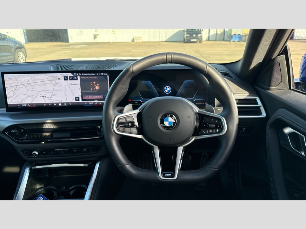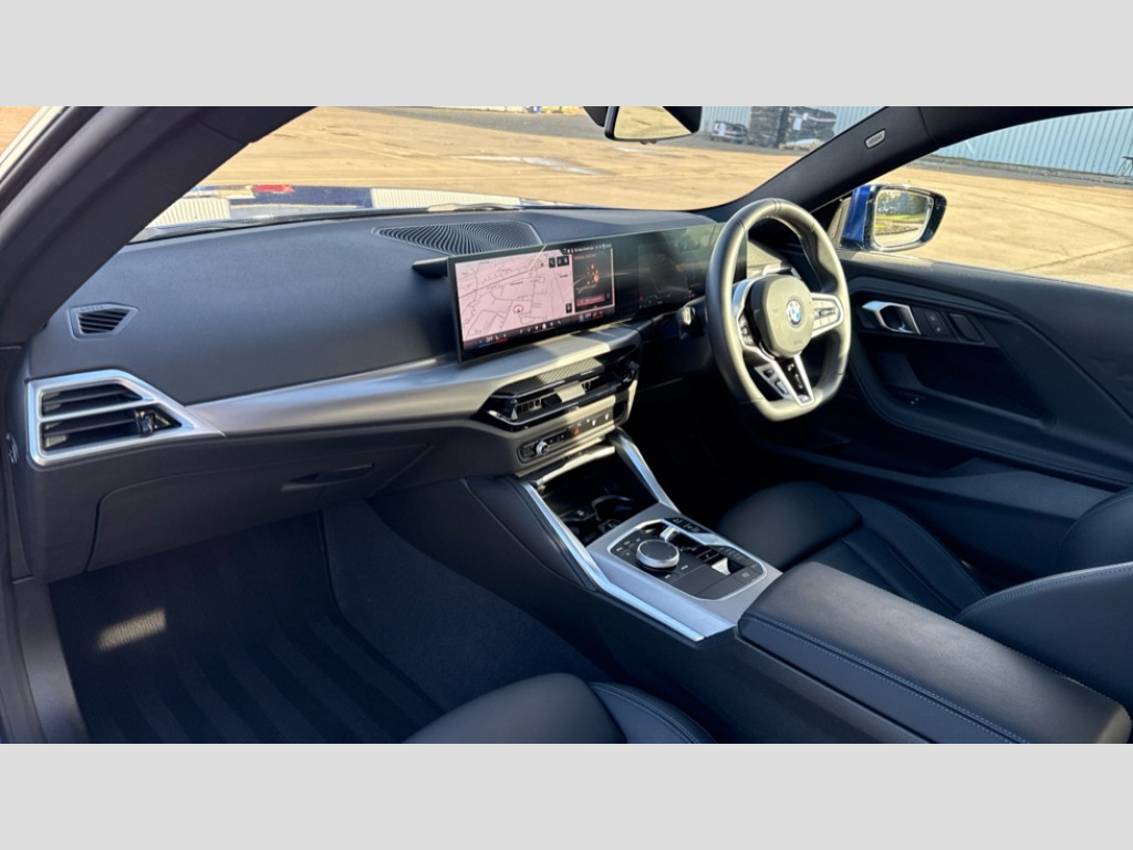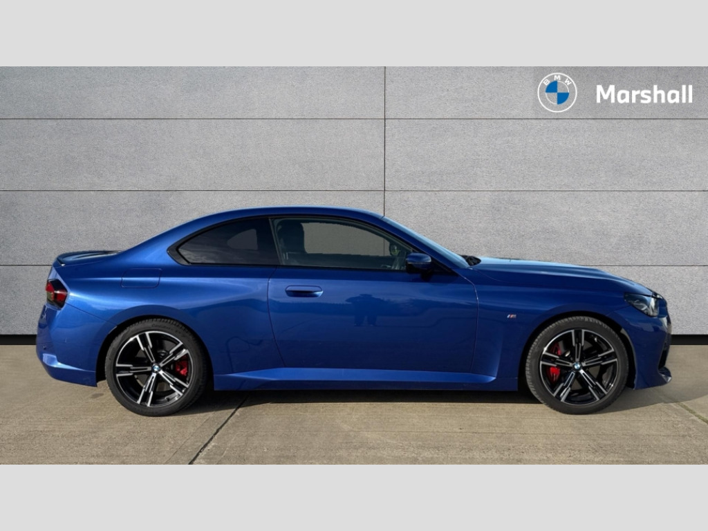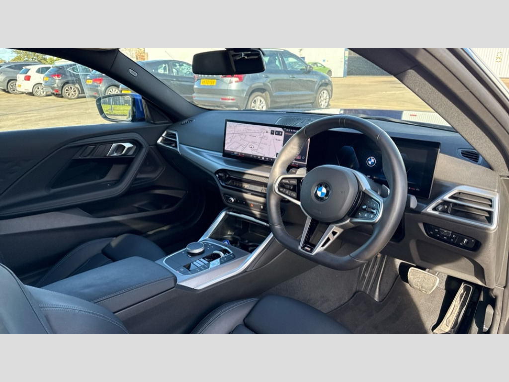 BMW 2 Series 220i M Sport 2dr Step Auto 2 USB connections for charging and transferring data, Active guard plus, Attentiveness assist, Bluetooth with USB, BMW ConnectedDrive online services, BMW Intelligent Personal Assistant, BMW Live cockpit plus, BMW operating system 8 with variable, configurable widgets display information in real time, BMW Teleservices, Check Control warning system for monitoring of lights and door/luggage compartment open warning, Control Infotainment, Direct selection buttons, Drive off assistant, Eco pro mode, Electric power steering, eSim with 5G connectivity, Front and rear parking sensors, iDrive controller with turn and press function, Integrated owners handbook, Intelligent functions, Oil sensor for level and grade, Optimum shift indicator, Personal Profile, Smartphone integration, Touch operation on control display, Variable sport steering, Widescreen multi-media display, WiFi interface for wireless connection of mobile terminal devices, Aluminium lightweight construction, Balancer shaft, BMW TwinPower Turbo four-cylinder petrol engine, Double VANOS, Drive performance control with ECO PRO comfort + sport mode, Electronic differential lock, High precision injection, M sport suspension, Petrol Particulate Filter, Steptronic transmission with gearshift paddles, Twin scroll turbocharger with Valvetronic, DAB tuner, Acoustic windscreen wipers for reduced driving noise, Automatic windscreen wipers and automatic headlight, Body colour door handles flush with door surface, Body colour door mirrors, Body colour front and rear bumpers, Daytime running lights, Electric windows - front and rear, with open/close fingertip control and trap release, Exhaust tailpipes x2 - 90mm in left and right, Extended high gloss shadow line exterior trim, Fading support, Front and rear bumper system with replaceable deformation elements, Front door sill finishers in black plastic with BMW designation, Front windscreen wipers with integrated washer jets, Green tinted heat protection glazing, High beam assistant, High gloss black sill, bumper trim sides and diffuser insert, High level third brake light, Indicators integrated int mirror housing, Interior rear-view mirror with automatic anti-dazzle function, LED registration plate light, LED technology rear tail lights, brake lights and turn indicators, Lightweight engineering, M lights shadowline, One piece kidney grille with hight gloss chrome surround, Rear boot, Rear fog lights, Rear spoiler in black sapphire, Reversing light in rear light cluster, Shark fin antenna, Single part LED rear lights with smoked glass components, Trailer stabilisation logic, Visible VIN plate, 12V power socket in front centre console with blanking plug, 2 cupholders in front centre console, 2 zone automatic air conditioning, Ambient lighting, Compartment in front of cupholder, Conditioned based service, English handbook, Folding rear seat head rests, Front and rear side armrests integrated into door trim, Front armrest, Front door pockets, Front head restraints, Heated front seats, Illuminated glove compartment with separate small compartment, M headliner Anthracite, M sport leather steering wheel, Manually adjustment steering wheel column, Rear seat backrest with manual 40:20:40 split folding, Rear seat centre foldable armrest with integrated cup holder, Single front passenger seat, Storage compartment between rear seats, Storage tray and compartment with cover in centre console, Sun visors with vanity mirrors and insert tab, Through loading system with 40/20/40 split folding 2 rear seat in 2nd row, Velour floor mats, Additional storage compartment pack without USB - 2 Series Coupe, Connected pack professional - 2 Series Coupe, 2 tone horn, Anti lock braking system (ABS) with cornering brake control, Automatic Stability Control (ASC), BMW emergency call, Brake drying, Child seat ISOFIX attachment for the two outer rear seats, Crash sensor activating of airbags, Unlocking doors, hazard warning lights, interior light, safety battery terminal, Deactivation of fuel pump in the event of a crash, Driver and front passenger airbags, Driver and front passenger side airbags, integrated in the door side seat backrest bolsters for all seat variants, Dynamic brake control, Dynamic stability control + (DSC+), Dynamic Traction Control - DTC, Electrically operated hand brake including automatic hold function and automatic release when driving off, Front and rear disc brakes, Front centre airbag between driver and front passenger seats, Front passenger airbag deactivation, Head airbags for all 4 outer seats, M seat belts, PC iBrake (Post crash approach control warning with light braking function), Seat belt security check for driver and front passenger, Seatbelt warning, Side impact protection, Three point seat belts on 4 seats including front belt stopper, pyrotechnic belt tensioners and belt force limiters, Tyre pressure monitoring system, Warning triangle and first aid kit, Alarm system (Thatcham 1) with remote control and electronic engine immobiliser, Central locking switch for all doors, fuel filler cap and luggage compartment, Deadlocking function system to all doors, Drive away locking system on all doors and luggage compartment, Locking wheel bolts, Start/Stop button (illuminated) in centre console with keyless engine start and Auto Start-Stop deactivation button, Two remote control key with integrated key - one button for open and close doors/fuel flap/tailgate and separate button for unlock luggage compartment, Electrically powered 12V compressor, Reduced rolling resistance tyres, Tyre repair kit