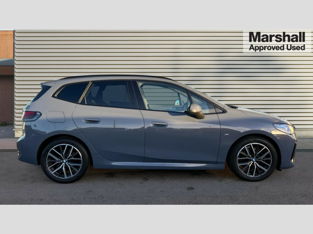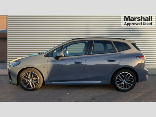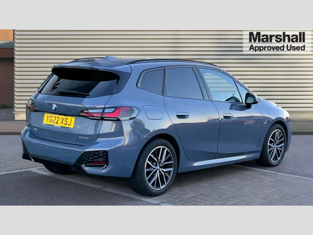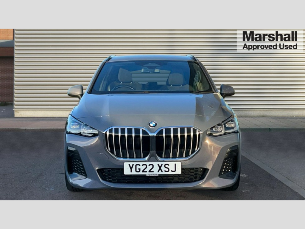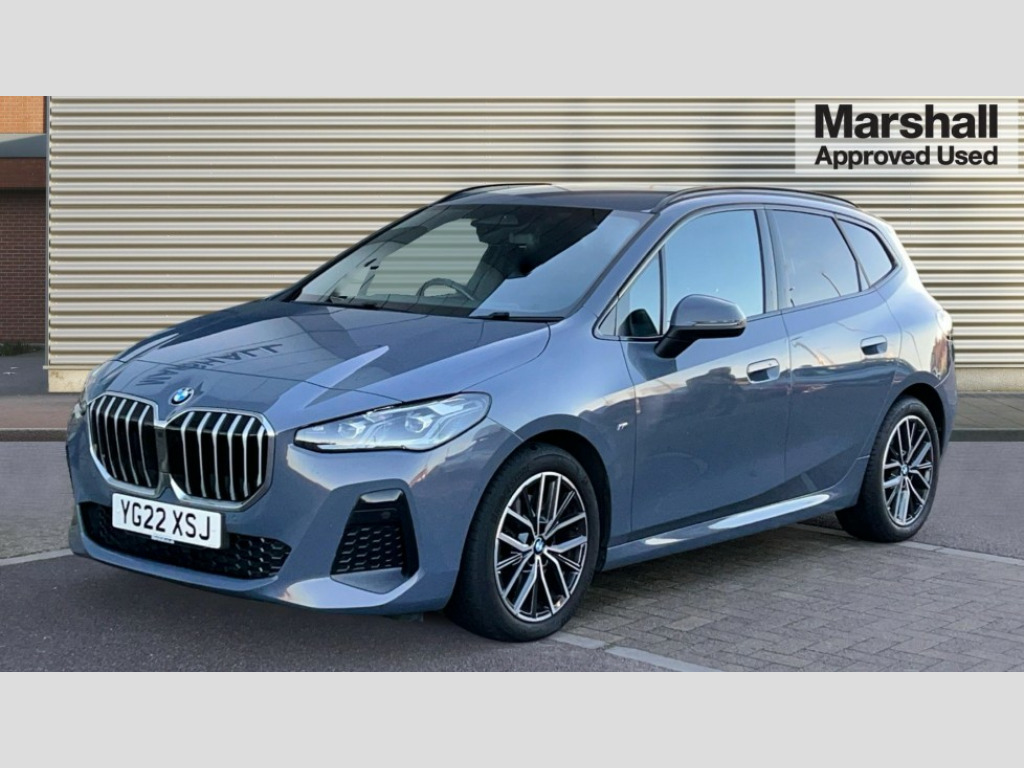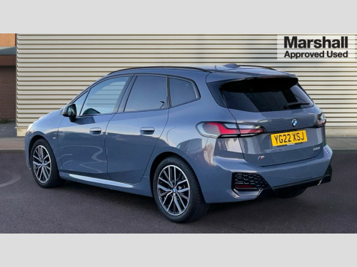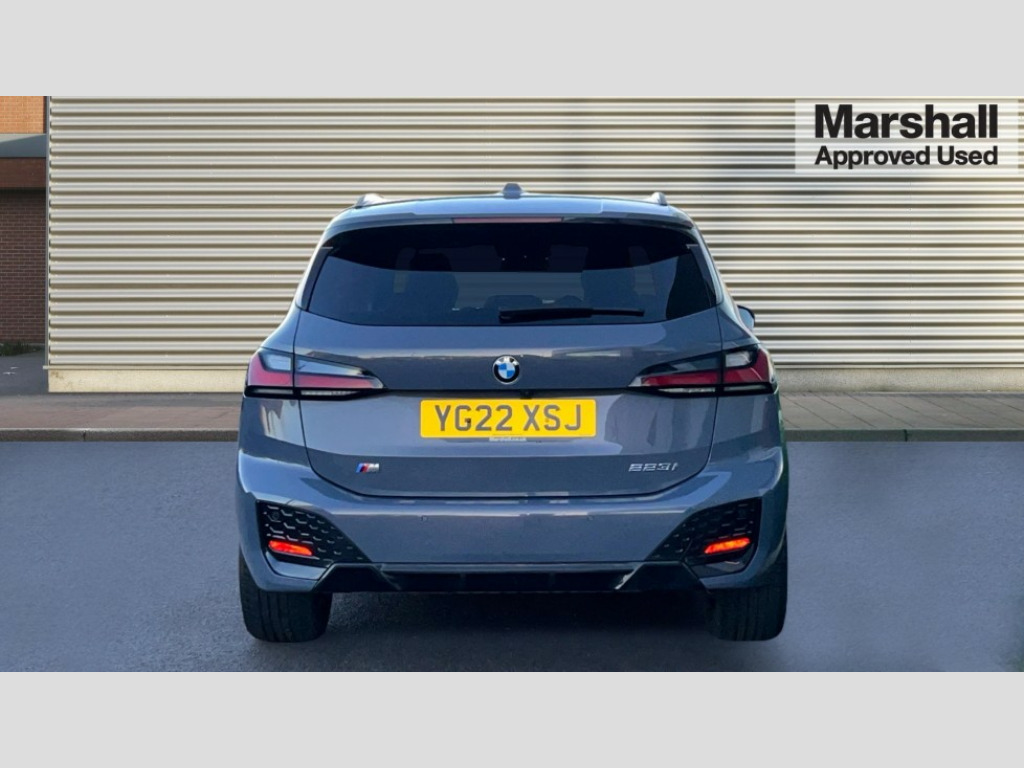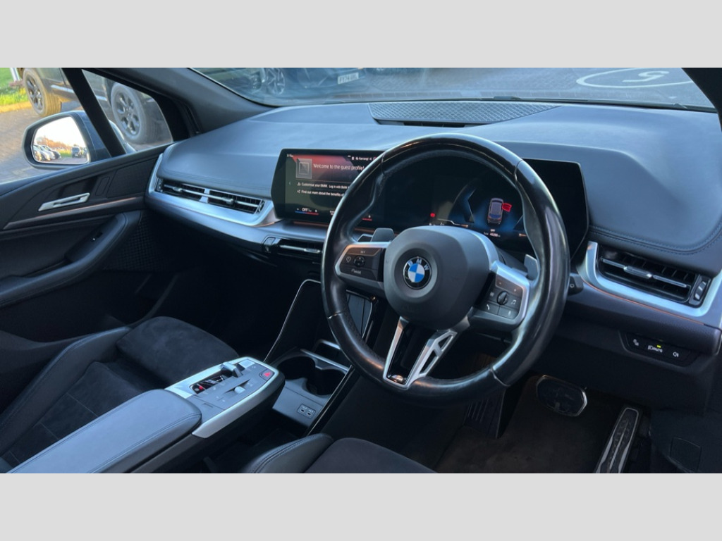 BMW 2 Series 223i MHT M Sport 5dr DCT Active Guard incl speed limiting and lane departure functions with auto steering, and front collision warning with brake intervention, Automatic powered tailgate, Automatic start/stop function, BMW Live cockpit plus with Navigation function, BMW Teleservices, Brake pad wear indicator in front and rear, Drive off assistant, Flat air vents on instrument panel in high gloss black, adjustable slats with elements in pearl chrome, iDrive controller, Instrument cluster with speedometer with miles per hour read out, tachometer and fuel gauge, Language version English, On board computer - average speed+fuel consumption, service interval, clock/date, odometer/trip meter, outside temperature display and ice warning, Parking assistant with active park distance control, reversing assistant, lateral parking aid and rear view camera, Servotronic variable electric power steering (EPS), Smartphone integration, Widescreen display, Drive performance control with ECO PRO comfort + sport mode, Gear selector switch with toggle operation, M Adaptive suspension, Petrol Particulate Filter, Steptronic sport transmission with double clutch and gear shift paddles, 2x USB Type C ports in front centre console for charging and data transfer, 2x USB Type C ports in rear centre console for charging, DAB Digital radio, Air inlet middle part on front apron in lines specific design with trim strip in satinised aluminium, Automatic headlights, BMW emblem, engine compartment lid and tailgate, Body colour roof mouldings, Body coloured door mirror caps, Contoured rear roof spoiler in vehicle colour with side aeroblades in black high-gloss, Driver side exterior mirror lighting with BMW logo projection, Dynamic brake lights, Electric adjustable heated door mirrors, Electric windows - front and rear, with open/close fingertip control, anti-trap facility and comfort closing, Folding door handles integrated flush with surface, Front and rear windscreen wipers with heated front washer nozzles, Front bumper cover with independent design in body colour with inserts in black high gloss, Front bumper design elements in satinised aluminium, Front door exit lights, Front door sill finishers aluminium inserts with M inscription, Front entry sills with aluminium inserts + BMW inscription, Front oramental grille with radiator grille bars in satinised aluminium, Heated rear window, Hidden exhaust pipe, High gloss shadow line, High gloss shadowline roof rails, Key with M identification, LED Daytime running lights and parking lights with turn indicators, LED number plate light, LED third brake light in rear spoiler, M identification on sides, Manual headlight range control, Model inscription on right tailgate, Rain sensor, Rear bumper cover with independent design in body colour with inserts in black high gloss, Rear bumper trim strip in satinised aluminium, Rear side wing doors, Shark fin antenna, Side sill covers with independent design in Body colour, Trailer stabilisation logic, Trims on front and rear bumper covers colour-coordinated with side window graphic, Visible VIN plate, Welcome lighting, Windscreen washer nozzle for rear view camera, 12V power socket in luggage compartment and front centre console, 12V socket in right side trim panel, 2 bag hooks in luggage compartment, 2 front reading lights, 2 open cup holders in front centre console, 3 seat bench in 2nd row, 40:20:40 split folding rear seat backrests, Ambient lighting front and rear, Automatic two zone climate control air conditioning, Bottle trays in all doors, Child seat ISOFIX attachment for two outer rear seats and front passenger seat with anchorage points, Driver and front passenger sports seats, Four grab handles integrated in roof lining, Front and rear door pockets, Front and rear footwell lighting, Front and rear side armrest integrated into door trim, Front centre console storage compartment, Front head restraints, Glovebox with light, Heated front seats, Height adjustable 3 rear head restraints, Interior door handle recess light on all doors, Luggage compartment lighting, M Anthracite headlining, M specific floor mats, M sport leather steering wheel, Map pockets, Mechanical rear seats with fore/aft adjustment, Multi-function controls for steering wheel, One piece parcel shelf opens together with tailgate and removable, Rear cloth hooks, Single front passenger seat, Sliding rear seat bench, Stainless steel pedals, Steering wheel column manual adjustment, Storage compartment lighting in centre console and storage tray in centre stack, Storage compartment net in left side trim panel, Storage compartment with folding cover under centre console armrest cushion, Storage tray in right side trim panel, Sunvisors with illuminated vanity mirrors, Three spoke sport leather steering wheel, Connected pack professional - 2 Series Active Tourer, Technology pack - 2 Series Active Tourer - MY22, 3 point seatbelts on all seats, front pyrotechnic belt tensioners, stopper and belt force limiters, rear coded belt buckles, Airbag - Front driver and passenger, front and rear head, front side, curtain head protection, manual deactivation of front passenger airbag possible, Anti lock braking system (ABS) with brake assist, Automatic hold function, BMW emergency call, Brake drying, Braking readiness, Child proof locking system in rear door, Cornering brake control, Crash Sensor - activates hazard/interior lighting + unlocks doors, DSC - Dynamic Stability Control, Dynamic brake control, Dynamic Traction Control - DTC, Electromechanical parking brake, Energy recovery system, Front disc brakes, Integrated braking system, PC iBrake PostCrash approach control warning with light braking function, Rear disc brakes, Tyre pressure monitoring system, Warning triangle and first aid kit, Anti theft alarm system, Closing system with central locking, Engine immobiliser, Locking wheel bolts, Front centre console trim in high gloss black, BMW mobility tyre sealing system