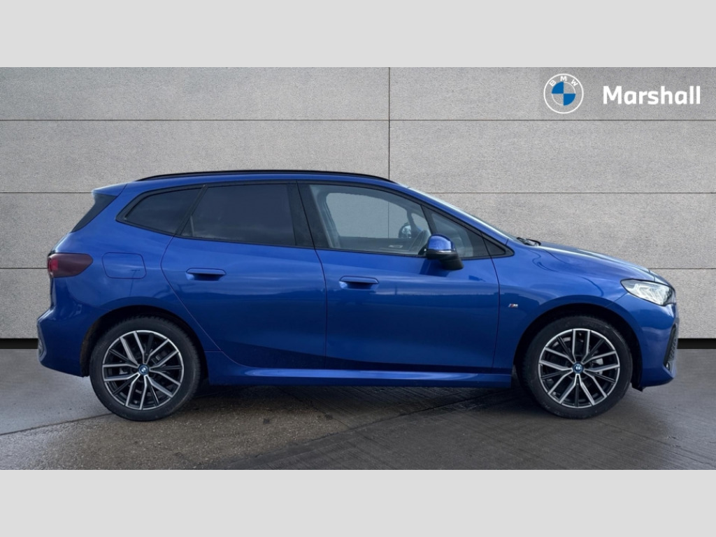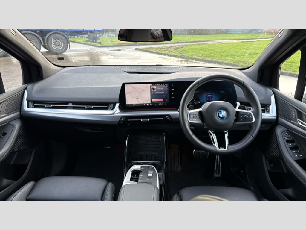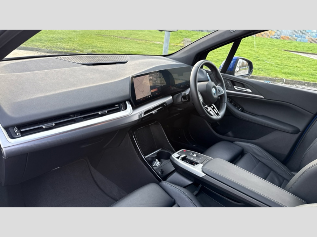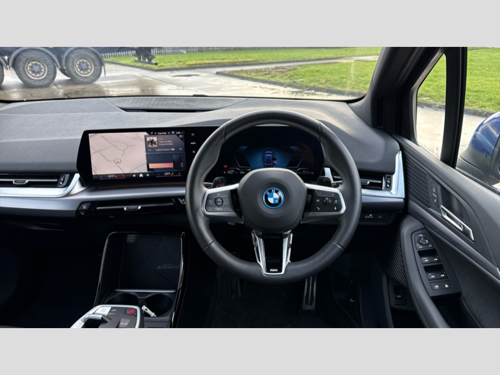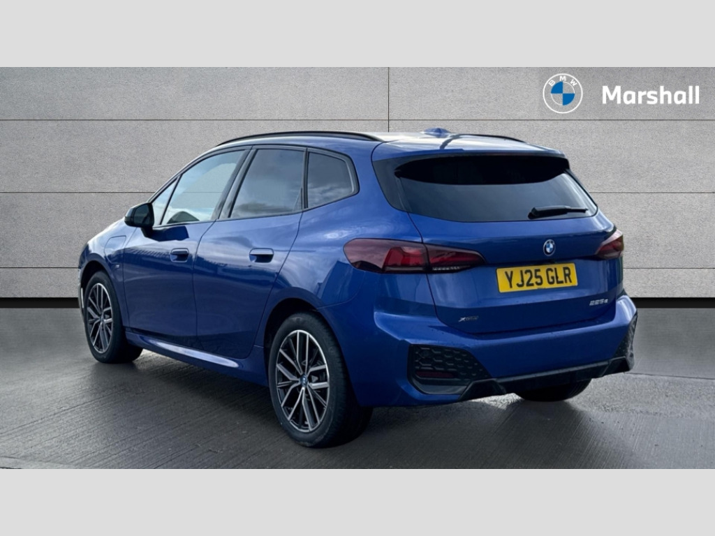 BMW 2 Series 225e xDrive M Sport 5dr DCT Active Guard, Attentiveness assist, Automatic powered tailgate, Automatic start/stop function, BMW Online services, BMW Operating system 9 with BMW Maps, real-time traffic information, in-car experiences, remote services and smartphone integration, BMW Teleservices, Brake pad wear indicator in front and rear, Condition based service, ConnectedDrive Services, Drive off assistant, Flat air vents on instrument panel in high gloss black, adjustable slats with elements in pearl chrome, iDrive controller, Instrument cluster with speedometer with miles per hour read out, tachometer and fuel gauge, Language version English, On board computer - average speed+fuel consumption, service interval, clock/date, odometer/trip meter, outside temperature display and ice warning, Parking assistant with active park distance control, reversing assistant, lateral parking aid and rear view camera, Servotronic variable electric power steering (EPS), Widescreen display, Wireless charging, 11kW AC charging, Drive performance control with ECO PRO comfort + sport mode, eDrive exterior sound, Gear selector switch with toggle operation, M Adaptive suspension, Mode 3 public charging cable, Performance Control, Petrol Particulate Filter, Steptronic transmission with double clutch and gear shift paddles, 1x USB Type C ports in rear centre console for charging, 2x USB Type C ports in front centre console for charging and data transfer, DAB Digital radio, Personal eSim, Welcome sound upon opening of the front driver or passenger door, Air inlet middle part on front apron in lines specific design with trim strip in satinised aluminium, Automatic headlights, Black rear bumper trim strip, BMW emblem, engine compartment lid and tailgate, Body colour roof mouldings, Body coloured door mirror caps, Contoured rear roof spoiler in vehicle colour with side aeroblades in black high-gloss, Courtesy lights in exterior mirror with BMW logo projection, Dynamic brake lights, Electric adjustable heated door mirrors, Electric windows - front and rear, with open/close fingertip control, anti-trap facility and comfort closing, Folding door handles integrated flush with surface, Front and rear windscreen wipers with heated front washer nozzles, Front bumper cover with independent design in body colour with inserts in black high gloss, Front bumper design elements in satinised aluminium, Front door exit lights, Front door sill finishers aluminium inserts with M inscription, Front entry sills with aluminium inserts + BMW inscription, Front oramental grille with radiator grille bars in satinised aluminium, Heated rear window, Hidden exhaust pipe, High gloss shadow line, High gloss shadowline roof rails, Home light, Key with M identification, LED Daytime running lights and parking lights with turn indicators, LED number plate light, LED rear lights, LED third brake light in rear spoiler, Manual headlight range control, Model inscription on right tailgate, Rain sensor, Rear bumper cover with independent design in body colour with inserts in black high gloss, Rear side wing doors, Shark fin antenna, Side sill covers with independent design in Body colour, Trailer stabilisation logic, Trims on front and rear bumper covers colour-coordinated with side window graphic, Visible VIN plate, Welcome lighting, Window washer nozzle for rear view camera, 12V socket in right side trim panel, 2 bag hooks in luggage compartment, 2 front reading lights, 2 open cup holders in front centre console, 2x 12V power socket in luggage compartment and front centre console, 3 seat bench in 2nd row, 40:20:40 split folding rear seat backrests, Additional under floor storage in luggage compartment, Ambient lighting front and rear, Automatic two zone climate control air conditioning, Bottle trays in all doors, Child seat ISOFIX attachment for two outer rear seats and front passenger seat with anchorage points, Driver and front passenger sports seats, Embellishers on steering wheel spokes in pearl chrome, Four grab handles integrated in roof lining, Front and rear door pockets, Front and rear footwell lighting, Front and rear side armrest integrated into door trim, Front centre console storage compartment, Front head restraints, Glovebox with light, Heated front seats, Height adjustable 3 rear head restraints, Illuminated wireless charging tray, Interior door handle recess light on all doors, Luggage compartment lighting on right side, M Anthracite headlining, M specific floor mats, M sport leather steering wheel, Map pockets, Mechanical rear seats with fore/aft adjustment, Middle centre console storage compartment, Multi-function controls for steering wheel, One piece parcel shelf opens together with tailgate and removable, Rear cloth hooks, Single front passenger seat, Stainless steel pedals, Steering wheel column manual adjustment, Storage compartment lighting in centre console and storage tray in centre stack, Storage compartment net in left side trim panel, Storage compartment with folding cover under centre console armrest cushion, Sunvisors with illuminated vanity mirrors, Tilt adjustment incl. cargo function of 2nd row of seats, 3 point seatbelts on all seats, front pyrotechnic belt tensioners, stopper and belt force limiters, rear coded belt buckles, Acoustic protection for pedestrians, Airbag - Front driver and passenger, front and rear head, front side, curtain head protection, manual deactivation of front passenger airbag possible, Anti lock braking system (ABS) with brake assist, Automatic hold function, BMW emergency call, Brake drying, Braking readiness, Child proof locking system in rear door, Cornering brake control, Crash Sensor - activates hazard/interior lighting + unlocks doors, DSC - Dynamic Stability Control, Dynamic brake control, Dynamic Traction Control - DTC, Electromechanical parking brake, Energy recovery system, Front disc brakes, Integrated braking system, PC iBrake PostCrash approach control warning with 