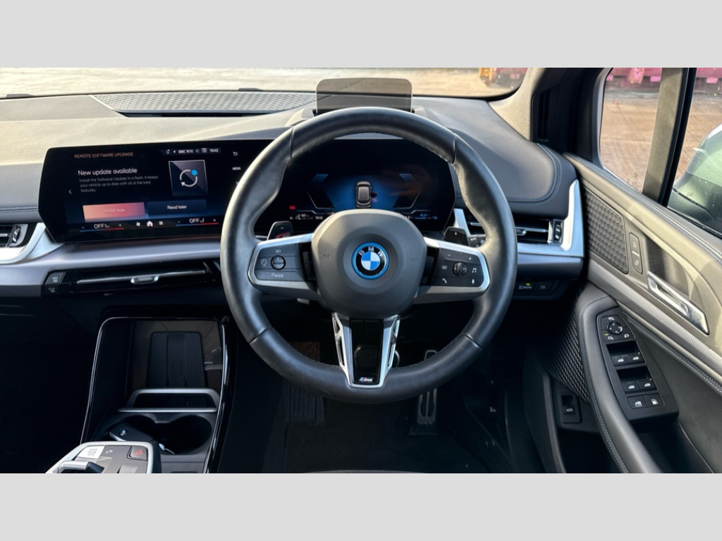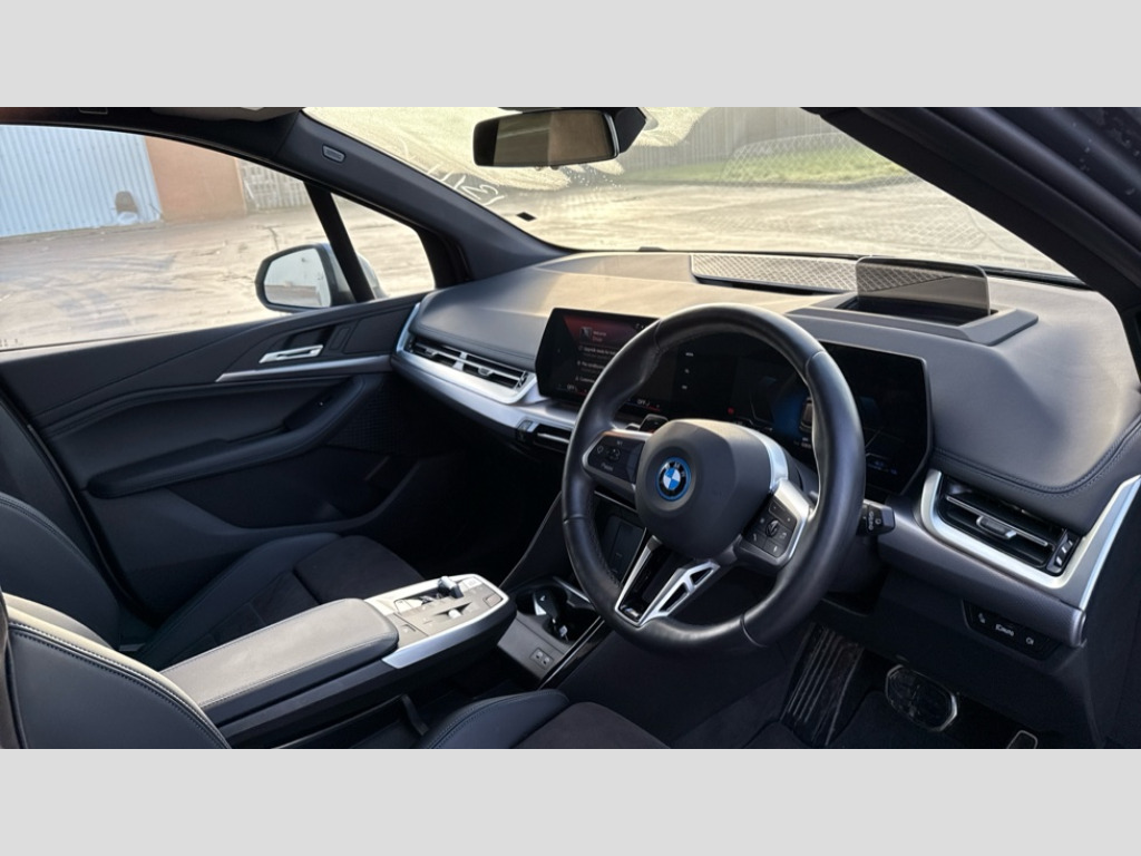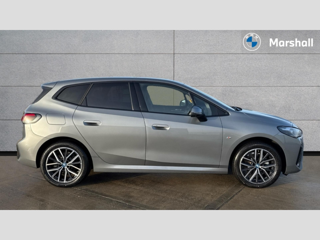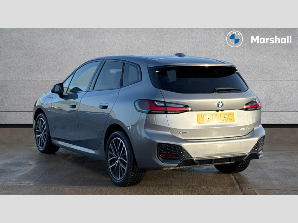 BMW 2 Series 225e xDrive M Sport 5dr DCT Active Guard, Attentiveness assist, Automatic powered tailgate, Automatic start/stop function, BMW Head up display, BMW Online services, BMW Operating system 9 with BMW Maps, real-time traffic information, in-car experiences, remote services and smartphone integration, BMW Teleservices, Brake pad wear indicator in front and rear, Condition based service, ConnectedDrive Services, Drive off assistant, Flat air vents on instrument panel in high gloss black, adjustable slats with elements in pearl chrome, iDrive controller, Instrument cluster with speedometer with miles per hour read out, tachometer and fuel gauge, Language version English, On board computer - average speed+fuel consumption, service interval, clock/date, odometer/trip meter, outside temperature display and ice warning, Servotronic variable electric power steering (EPS), Widescreen display, Drive performance control with ECO PRO comfort + sport mode, eDrive exterior sound, Gear selector switch with toggle operation, M Adaptive suspension, Mode 3 charging cable, Performance Control, Petrol Particulate Filter, Steptronic transmission with double clutch and gear shift paddles, 2x USB Type C ports in front centre console for charging and data transfer, 2x USB Type C ports in rear centre console for charging, DAB Digital radio, Personal eSim, Welcome sound upon opening of the front driver or passenger door, Air inlet middle part on front apron in lines specific design with trim strip in satinised aluminium, Automatic headlights, Black rear bumper trim strip, BMW emblem, engine compartment lid and tailgate, Body colour roof mouldings, Body coloured door mirror caps, Contoured rear roof spoiler in vehicle colour with side aeroblades in black high-gloss, Driver side exterior mirror lighting with BMW logo projection, Dynamic brake lights, Electric adjustable heated door mirrors, Electric windows - front and rear, with open/close fingertip control, anti-trap facility and comfort closing, Folding door handles integrated flush with surface, Front and rear windscreen wipers with heated front washer nozzles, Front bumper cover with independent design in body colour with inserts in black high gloss, Front bumper design elements in satinised aluminium, Front door exit lights, Front door sill finishers aluminium inserts with M inscription, Front entry sills with aluminium inserts + BMW inscription, Front oramental grille with radiator grille bars in satinised aluminium, Heated rear window, Hidden exhaust pipe, High gloss shadow line, Home light, Key with M identification, LED Daytime running lights and parking lights with turn indicators, LED number plate light, LED third brake light in rear spoiler, M identification on sides, Manual headlight range control, Model inscription on right tailgate, Rain sensor, Rear bumper cover with independent design in body colour with inserts in black high gloss, Rear side wing doors, Shark fin antenna, Side sill covers with independent design in Body colour, Trailer stabilisation logic, Trims on front and rear bumper covers colour-coordinated with side window graphic, Visible VIN plate, Welcome lighting, Windscreen washer nozzle for rear view camera, 12V power socket in luggage compartment and front centre console, 12V socket in right side trim panel, 2 bag hooks in luggage compartment, 2 front reading lights, 2 open cup holders in front centre console, 2 x USB Type C ports for charging in front centre console + 2 x USB Type C ports for charging in rear centre console, 3 seat bench in 2nd row, 40:20:40 split folding rear seat backrests, Ambient lighting front and rear, Automatic two zone climate control air conditioning, Bottle trays in all doors, Child seat ISOFIX attachment for two outer rear seats and front passenger seat with anchorage points, Driver and front passenger sports seats, Embellishers on steering wheel spokes in pearl chrome, Four grab handles integrated in roof lining, Front and rear door pockets, Front and rear footwell lighting, Front and rear side armrest integrated into door trim, Front centre console storage compartment, Front head restraints, Glovebox with light, Heated front seats, Height adjustable 3 rear head restraints, Illuminated wireless charging tray, Interior door handle recess light on all doors, Luggage compartment lighting, M Anthracite headlining, M specific floor mats, M sport leather steering wheel, Manual adjustment of seat height, fore/aft position, seat depth, backrest tilt and head restraint height, Map pockets, Mechanical rear seats with fore/aft adjustment, Middle centre console storage compartment, Multi-function controls for steering wheel, One piece parcel shelf opens together with tailgate and removable, Rear cloth hooks, Single front passenger seat, Stainless steel pedals, Steering wheel column manual adjustment, Storage compartment lighting in centre console and storage tray in centre stack, Storage compartment net in left side trim panel, Storage compartment with folding cover under centre console armrest cushion, Sunvisors with illuminated vanity mirrors, Driving assistant plus package - 2 series Active Tourer, Technology plus pack - 2 Series Active Tourer, 3 point seatbelts on all seats, front pyrotechnic belt tensioners, stopper and belt force limiters, rear coded belt buckles, Acoustic protection for pedestrians, Airbag - Front driver and passenger, front and rear head, front side, curtain head protection, manual deactivation of front passenger airbag possible, Anti lock braking system (ABS) with brake assist, Automatic hold function, BMW emergency call, Brake drying, Braking readiness, Child proof locking system in rear door, Cornering brake control, Crash Sensor - activates hazard/interior lighting + unlocks doors, DSC - Dynamic Stability Control, Dynamic brake control, Dynamic Traction Control - DTC, Electromechanical parking brake, Energy recovery system, Front disc brakes, Integrated braking system, PC iBrake