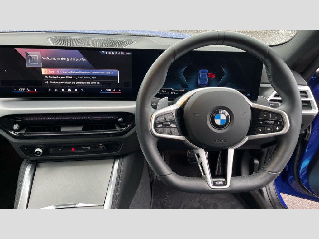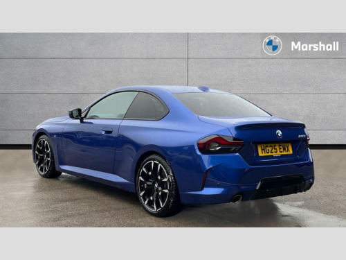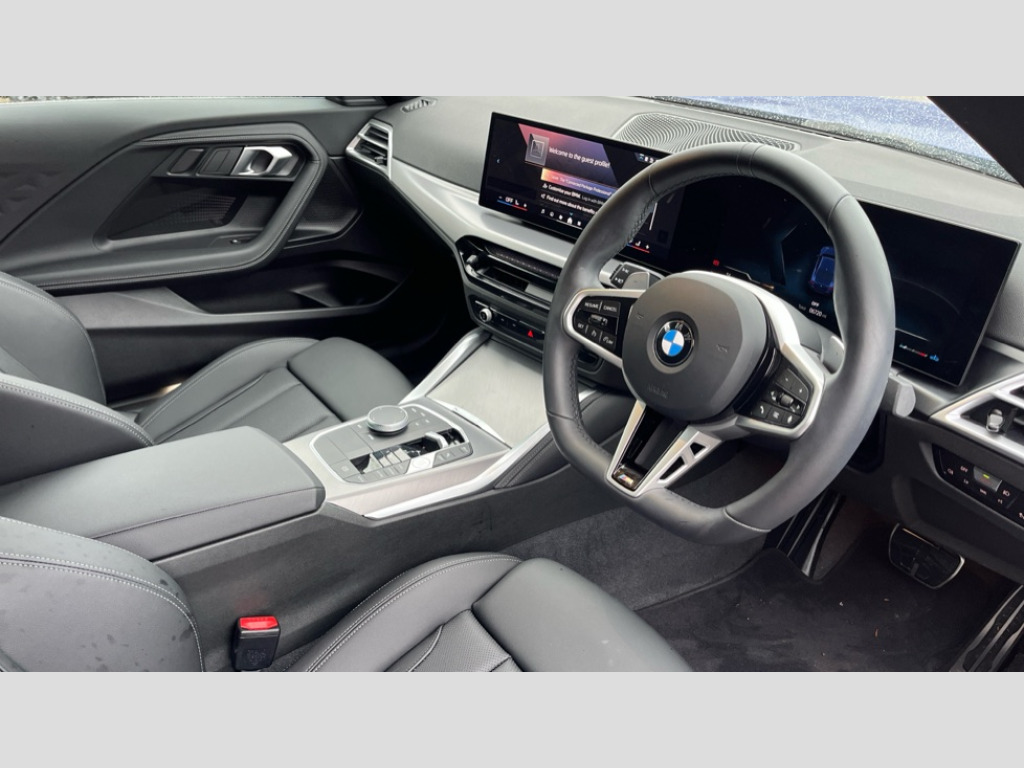 BMW 2 Series 230i M Sport 2dr Step Auto Active guard plus, Attentiveness assist, Bluetooth with USB, BMW ConnectedDrive online services, BMW Intelligent Personal Assistant, BMW Live cockpit plus, BMW Teleservices, Check Control warning system for monitoring of lights and door/luggage compartment open warning, Control Infotainment, Direct selection buttons, Drive off assistant, Electric power steering, eSim with 5G connectivity, Front and rear parking sensors, iDrive controller with turn and press function, Intelligent functions, Oil sensor for level and grade, Optimum shift indicator, Personal Profile, Smartphone integration, Touch operation on control display, Variable sport steering, Widescreen display with 12.3" fully digital instrument cluster and 14.9" control display, WiFi interface for wireless connection of mobile terminal devices, Aluminium lightweight construction, Balancer shaft, BMW TwinPower Turbo four-cylinder petrol engine, Double VANOS, Drive performance control with ECO PRO comfort + sport mode, Electronic differential lock, High precision injection, M sport suspension, Petrol Particulate Filter, Steptronic transmission with gearshift paddles, Twin scroll turbocharger with Valvetronic, 1 x USB Type A with data transfer and 1.5 Ampere charging function in the centre console, 1 x USB Type C with 3 Ampere charging function in the front centre armrest, DAB tuner, Acoustic windscreen wipers for reduced driving noise, Automatic windscreen wipers and automatic headlight, Body colour door handles flush with door surface, Body colour door mirrors, Body colour front and rear bumpers, Daytime running lights, Electric windows - front and rear, with open/close fingertip control and trap release, Exhaust tailpipes x2 - 90mm in left and right, Fading support, Front and rear bumper system with replaceable deformation elements, Front door sill finishers in black plastic with BMW designation, Front windscreen wipers with integrated washer jets, Green tinted heat protection glazing, High gloss black sill, bumper trim sides and diffuser insert, High level third brake light, Indicators integrated int mirror housing, Interior rear-view mirror with automatic anti-dazzle function, LED registration plate light, LED technology rear tail lights, brake lights and turn indicators, M high gloss shadowline, Rear boot, Rear fog lights, Reversing light in rear light cluster, Shark fin antenna, Single part LED rear lights with smoked glass components, Trailer stabilisation logic, Visible VIN plate, 12V power socket in front centre console with blanking plug, 2 cupholders in front centre console, 2 zone automatic air conditioning, Ambient lighting, Conditioned based service, English handbook, Folding rear seat head rests, Front and rear side armrests integrated into door trim, Front armrest, Front door pockets, Front head restraints, Heated front seats, Illuminated glove compartment with separate small compartment, M headliner Anthracite, M sport leather steering wheel, Manually adjustment steering wheel column, Rear seat backrest with manual 40:20:40 split folding, Rear seat centre foldable armrest with integrated cup holder, Single front passenger seat, Storage compartment between rear seats, Storage tray and compartment with cover in centre console, Sun visors with vanity mirrors and insert tab, Through loading system with 40/20/40 split folding 2 rear seat in 2nd row, Velour floor mats, Connected pack professional - 2 Series Coupe, Storage compartment pack - 2 Series Coupe, 2 tone horn, Anti lock braking system (ABS) with cornering brake control, BMW emergency call, Brake drying, Child seat ISOFIX attachment for the two outer rear seats, Crash sensor activating of airbags, Unlocking doors, hazard warning lights, interior light, safety battery terminal, Deactivation of fuel pump in the event of a crash, Driver and front passenger airbags, Driver and front passenger side airbags, integrated in the door side seat backrest bolsters for all seat variants, Dynamic brake control, Dynamic stability control + (DSC+), Dynamic Traction Control - DTC, Electrically operated hand brake including automatic hold function and automatic release when driving off, Front and rear disc brakes, Front centre airbag between driver and front passenger seats, Front passenger airbag deactivation, Head airbags for all 4 outer seats, PC iBrake (Post crash approach control warning with light braking function), Seat belt security check for driver and front passenger, Seatbelt warning, Side impact protection, Three point seat belts on 4 seats including front belt stopper, pyrotechnic belt tensioners and belt force limiters, Tyre pressure monitoring system, Warning triangle and first aid kit, Alarm system (Thatcham 1) with remote control and electronic engine immobiliser, Central locking switch for all doors, fuel filler cap and luggage compartment, Deadlocking function system to all doors, Drive away locking system on all doors and luggage compartment, Locking wheel bolts, Start/Stop button (illuminated) in centre console with keyless engine start and Auto Start-Stop deactivation button, Two remote control key with integrated key - one button for open and close doors/fuel flap/tailgate and separate button for unlock luggage compartment, Electrically powered 12V compressor, Reduced rolling resistance tyres, Tyre repair kit