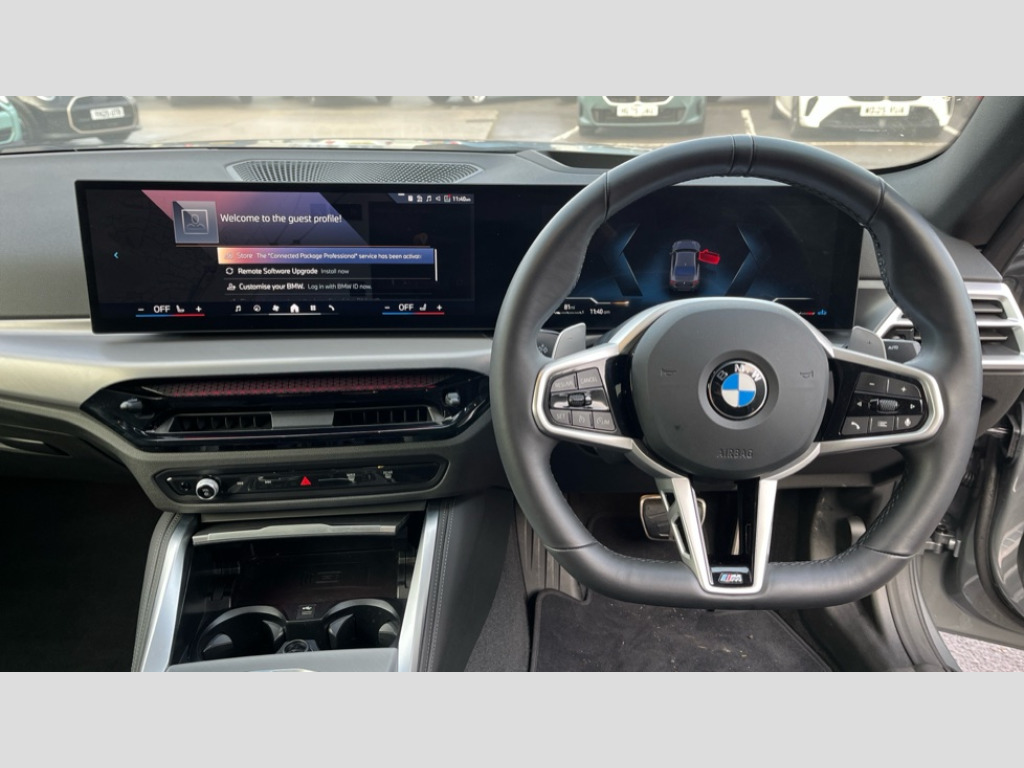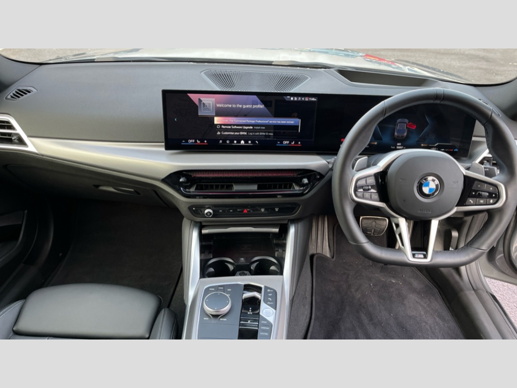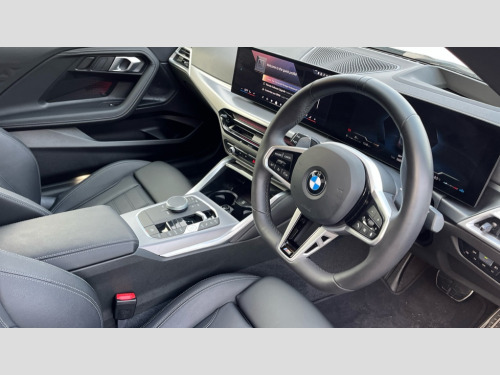 BMW 2 Series 230i M Sport 2dr Step Auto Active guard plus, Attentiveness assist, Bluetooth with USB, BMW ConnectedDrive online services, BMW Intelligent Personal Assistant, BMW Live cockpit plus, BMW Teleservices, Check Control warning system for monitoring of lights and door/luggage compartment open warning, Control Infotainment, Direct selection buttons, Drive off assistant, Electric power steering, eSim with 5G connectivity, Front and rear parking sensors, iDrive controller with turn and press function, Intelligent functions, Oil sensor for level and grade, Optimum shift indicator, Personal Profile, Smartphone integration, Touch operation on control display, Variable sport steering, Widescreen display with 12.3" fully digital instrument cluster and 14.9" control display, WiFi interface for wireless connection of mobile terminal devices, Aluminium lightweight construction, Balancer shaft, BMW TwinPower Turbo four-cylinder petrol engine, Double VANOS, Drive performance control with ECO PRO comfort + sport mode, Electronic differential lock, High precision injection, M sport suspension, Petrol Particulate Filter, Steptronic transmission with gearshift paddles, Twin scroll turbocharger with Valvetronic, 1 x USB Type A with data transfer and 1.5 Ampere charging function in the centre console, 1 x USB Type C with 3 Ampere charging function in the front centre armrest, DAB tuner, Acoustic windscreen wipers for reduced driving noise, Automatic windscreen wipers and automatic headlight, Body colour door handles flush with door surface, Body colour door mirrors, Body colour front and rear bumpers, Daytime running lights, Electric windows - front and rear, with open/close fingertip control and trap release, Exhaust tailpipes x2 - 90mm in left and right, Fading support, Front and rear bumper system with replaceable deformation elements, Front door sill finishers in black plastic with BMW designation, Front windscreen wipers with integrated washer jets, Green tinted heat protection glazing, High gloss black sill, bumper trim sides and diffuser insert, High level third brake light, Indicators integrated int mirror housing, Interior rear-view mirror with automatic anti-dazzle function, LED registration plate light, LED technology rear tail lights, brake lights and turn indicators, M high gloss shadowline, Rear boot, Rear fog lights, Reversing light in rear light cluster, Shark fin antenna, Single part LED rear lights with smoked glass components, Trailer stabilisation logic, Visible VIN plate, 12V power socket in front centre console with blanking plug, 2 cupholders in front centre console, 2 zone automatic air conditioning, Ambient lighting, Conditioned based service, English handbook, Folding rear seat head rests, Front and rear side armrests integrated into door trim, Front armrest, Front door pockets, Front head restraints, Heated front seats, Illuminated glove compartment with separate small compartment, M headliner Anthracite, M sport leather steering wheel, Manually adjustment steering wheel column, Rear seat backrest with manual 40:20:40 split folding, Rear seat centre foldable armrest with integrated cup holder, Single front passenger seat, Storage compartment between rear seats, Storage tray and compartment with cover in centre console, Sun visors with vanity mirrors and insert tab, Through loading system with 40/20/40 split folding 2 rear seat in 2nd row, Velour floor mats, Connected pack professional - 2 Series Coupe, Storage compartment pack - 2 Series Coupe, 2 tone horn, Anti lock braking system (ABS) with cornering brake control, BMW emergency call, Brake drying, Child seat ISOFIX attachment for the two outer rear seats, Crash sensor activating of airbags, Unlocking doors, hazard warning lights, interior light, safety battery terminal, Deactivation of fuel pump in the event of a crash, Driver and front passenger airbags, Driver and front passenger side airbags, integrated in the door side seat backrest bolsters for all seat variants, Dynamic brake control, Dynamic stability control + (DSC+), Dynamic Traction Control - DTC, Electrically operated hand brake including automatic hold function and automatic release when driving off, Front and rear disc brakes, Front centre airbag between driver and front passenger seats, Front passenger airbag deactivation, Head airbags for all 4 outer seats, PC iBrake (Post crash approach control warning with light braking function), Seat belt security check for driver and front passenger, Seatbelt warning, Side impact protection, Three point seat belts on 4 seats including front belt stopper, pyrotechnic belt tensioners and belt force limiters, Tyre pressure monitoring system, Warning triangle and first aid kit, Alarm system (Thatcham 1) with remote control and electronic engine immobiliser, Central locking switch for all doors, fuel filler cap and luggage compartment, Deadlocking function system to all doors, Drive away locking system on all doors and luggage compartment, Locking wheel bolts, Start/Stop button (illuminated) in centre console with keyless engine start and Auto Start-Stop deactivation button, Two remote control key with integrated key - one button for open and close doors/fuel flap/tailgate and separate button for unlock luggage compartment, Electrically powered 12V compressor, Reduced rolling resistance tyres, Tyre repair kit