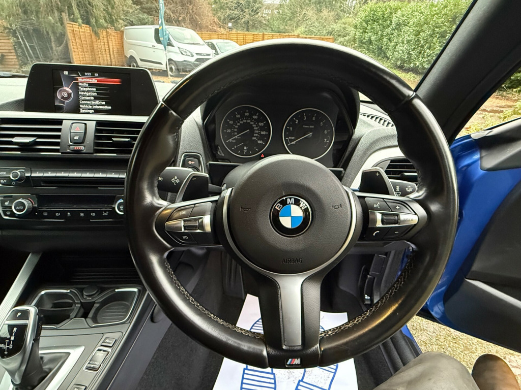 APPOINTMENT ONLY v power socket - centre console, 12v power socket - passenger footwell, 12v power socket - rear of centre console, 6.5in colour display screen, auxiliary input, bmw apps interface, bmw emergency call, bmw professional radio - single cd and mp3, bmw teleservices, bluetooth - audio streaming - with compatible devices, bluetooth hands free with usb audio interface, dab digital radio, full black panel display, navigation system - bmw professional multimedia, power socket - 12v in luggage compartment, remote services, shark fin aerial, usb audio interface, 18in alloy wheels - m light double spoke - 436m, airblades - ferric grey, bmw mobility system, bumpers - body colour, door handle lighting, door handles - body colour, door mirrors - electric and heated, door mirrors - ferric grey housing, electric windows - front and rear with open-close fingertip control, exhaust tailpipe - dark chrome - dual - round - split, exit lights in doors, exterior door handle light using led technology, exterior trim - high-gloss shadowline, heat protection glazing with green tint, heated windscreen washer jets, high grip tyres, kidney grille - chrome extra-wide eight high-gloss black vertical slats, kidney grille - chrome extra-wide high-gloss black vertical slats, locking wheel bolts, m aerodynamic bodystyling, m rear spoiler, roof mouldings - body colour, tyres - reduced rolling resistance, abs - anti lock braking system, asc - automatic stability control, airbags - driver, airbags - front side, airbags - head - front and rear, airbags - passenger, airbags - passenger deactivation, alarm system thatcham 1 with remote control, automatic lock when driving away selectable, battery safety cut off, brake assist, brake drying, bumper system front and rear - replaceable deformation elements for impacts up to 9mph, cbc - cornering brake control, central locking - remote, child seat isofix attachment - rear x2, crash sensor, crash sensor - activating central locking-hazard warning lights-fuel cut off, dbc - dynamic brake control, dsc - dynamic stability control plus, dtc - dynamic traction control, dynamic brake lights, engine immobiliser, first aid kit, hill start assist, incorrect fuelling protection system, seat belt security check for driver and front passenger, side impact protection, speed limit function, warning triangle, adaptive headlights, follow me home headlight function, headlights - automatic activation, headlights - beam throw control, headlights - led corona rings, headlights - washer system, high level third brake light, led rear light bars, led tailights, xenon headlight package, xenon headlights, air conditioning - automatic with two-zone control, ambient light - front, ambient lighting - switchable bmw classic orange - cold white - led, armrest - front and rear integrated into door trim, armrest - front with sliding adjustment, automatically dimming rear view mirror, comfort go keyless engine start, cup holders - front x2, door pockets on rear doors, door sill finishers - m235i designation, extended lighting, extended storage, floor mats - velour, footwell lights - front, front reading lights using led technology, gearshift lever with m designation, glove box with chrome surround and key lock, grab handles - in roof lining x4, grab handles with coat hooks, handbrake lever - gear lever knob and gaiters in leather, head restraints - rear and folding, headlining - anthracite, humidity sensor, illuminated vanity mirrors for driver and passenger, interior comfort package, interior trim - aluminium hexagon with black high gloss finisher, luggage compartment - electric unlocking via the keys remote control, luggage compartment - lashing eyes extra x2, luggage compartment - lashing eyes x2, luggage compartment - retaining straps, luggage compartment - storage nets, luggage compartment light - led, multifunction controls for steering wheel, personal profile, rain sensor with automatic headlight activation, reading lights - front and rear, rear interior light - centre with reading lights using led technology, seats - 60-40 split folding rear, seats - electric adjustment for backrest side bolsters, seats - front - manual height adjustment, solar sensor, sport seats - front, steering column with manual reach and rake adjustment, steering wheel - gearshift paddles, steering wheel - leather - m sport, storage - compartment in instrument panel on drivers side with folding cover, storage compartment - rear centre console and in door trim - front, storage nets on seat backrests, sun visors with illuminated vanity mirrors and ticket pocket, trim finisher - estoril blue - matt, two cupholders inserts for small items, versatile net, welcome light, brake pad wear indicator - front and rear, check control warning system, drive performance control - eco pro - comfort - sport - sport plus, integration of launch control functionality, lights-on audio warning, m sport braking system, m sport suspension, obc - on-board computer, optimum shift indicator, outside temperature display with ice warning, pdc - park distance control - rear, sport automatic transmission, sport instrument cluster - differentiated dial design featuring finer chrono-scaling, tpms - tyre pressure monitoring system, variable sport steering