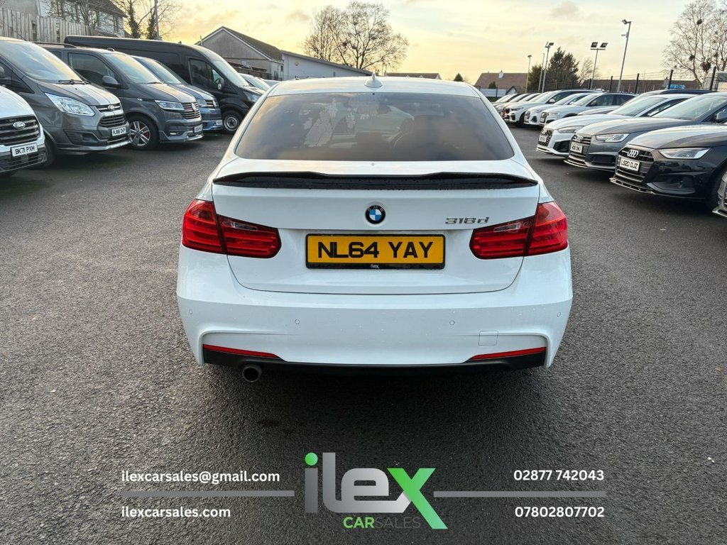 2014 BMW 318d M Sport Saloon A smart, well-specced M Sport saloon offering great economy, low running costs and classic BMW drive quality. Finished in Alpine White with black leather interior. Highlights 2.0 Diesel | Manual 78,369 Miles M Sport Styling & Suspension Black Dakota Leather Interior BMW Navigation System Dual-Zone Climate Control Bluetooth | DAB Radio Rear Parking Sensors 20" Alloy Wheels (£895 optional extra) £35 Road Tax | Up to 62.8 MPG Why this one? Stylish M Sport looks, strong fuel economy and low tax — a brilliant everyday BMW at sensible money. £9,995 Finance & warranty options available Part-exchange welcome Ilex Car Sales 416 Ballyquin Road, Dungiven, Derry, BT47 4NQ 02877 742043 www.ilexcarsales.co.uk – View all available stock 12V Power Socket - Centre Console, 12V Power Socket - Passenger Footwell, 18in Alloy Wheels - Light M Star Spoke -, 6.5in Colour Display Screen, ABS - Anti Lock Braking System, Air Conditioning - Automatic with Two-Zo, Airbags - Curtain, Airbags - Driver, Airbags - Front Side, Airbags - Passenger, Airbags - Passenger Deactivation, Alarm System Thatcham 1 with Remote Cont, Alpine White, Ambient Lighting - Switchable BMW Classi, Armrest - Front with Storage Compartment, Armrest - Rear Centre, ASC - Automatic Stability Control, Automatically Dimming Rear View Mirror, Auxiliary Input, Battery Safety Cut Off, Bluetooth Hands Free with USB Audio Inte, BMW Emergency Call, BMW Navigation System, BMW