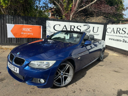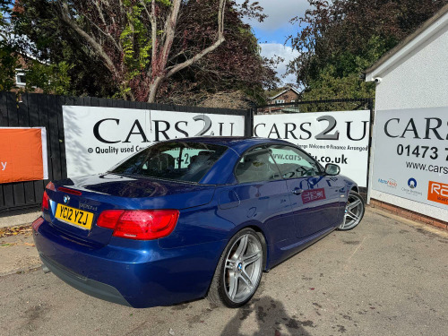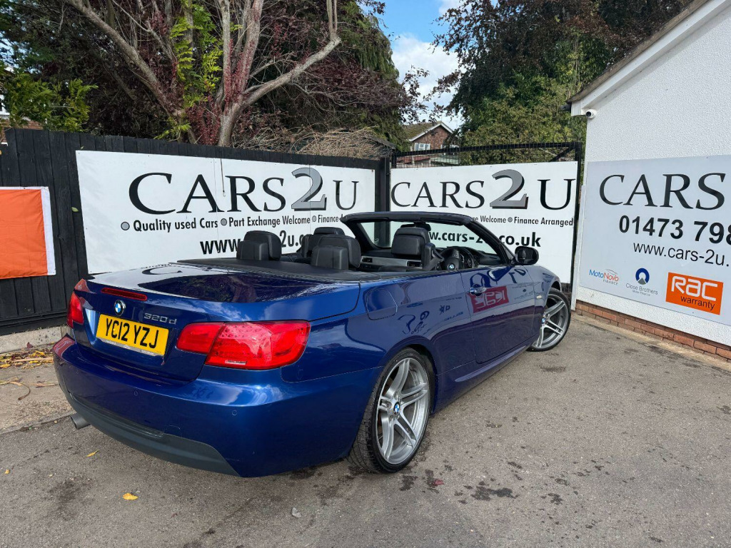Cars2u - Quality Used Cars with a Personal Touch, , Established in 2012, Cars2u is a family-run business dedicated to providing quality used vehicles with a friendly ,no-pressure approach. Conveniently located on the outskirts of Ipswich, we have excellent transport links via the A12 and A14 and are just a 10 minute drive from Ipswich train station. At Cars2u , every vehicle we sell is HPI clear and undergoes a full inspection to ensure it meets our high standards .For added peace of mind ,all cars come with an RAC warranty. We also offer finance options ,part exchange and nationwide delivery, making it easier than ever to find your perfect car. , Our focus is on customer satisfaction, providing a relaxed and professional service without the pressure of a hard sell. whether youre looking for your next car or simply exploring your options were here to help. , Visit Cars2u today and experience a stress-free way to buy a car. , WE ARE VERY PLEASED TO OFFER THIS VERY GOOD LOOKING VERY CLEAN LOW MILEAGE 2012 12 BMW 320D M SPORT HARDTOP CONVERTIBLE, GOOD SPEC ,SHE HAS COVERED A MEAR 56,000 MILES FROM NEW HAS A GOOD SERVICE RECORD ,SHE WILL BE SERVICED WHEN SOLD AS WELL AS A CURRENT MOT UNTILL 09/2026 AND WILL COME WITH A 3 MONTH RAC WARRANTY FOR HER NEW OWNERS COMPLETE PEACE OF MIND.