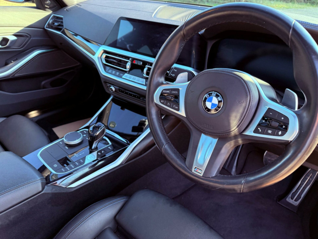 This 2021 BMW 3 Series 330e M Sport Pro Edition offers an exceptional blend of performance and efficiency. As a Euro 6 compliant plug in hybrid, it features a 2.0 litre petrol engine, delivering an impressive 0-62mph in just 5.9 seconds. Inside, you'll find a luxurious Vernasca Leather interior with striking blue contrast stitching, complemented by a Harman Kardon loudspeaker system for an immersive audio experience. The M Sport Pro Edition trim also includes a panoramic glass sunroof, allowing natural light to flood the cabin, and enhanced Bluetooth with wireless charging for seamless connectivity.The automatic three zone air conditioning ensures comfort for all occupants, adapting to individual preferences. This 330e M Sport Pro Edition stands out from other vehicles thanks to its advanced plug in hybrid technology, offering a more environmentally conscious driving experience without compromising on power. The combination of its dynamic acceleration, premium interior features, and cutting edge technology makes this BMW 3 Series a truly compelling choice for those seeking a sophisticated and capable saloon.WE OPERATE BY APPOINTMENT ONLY. PLEASE CALL THE SHOWROOM TO BOOK A TIME SLOT. SUPPLIED WITH 6 MONTHS RAC PLATINUM PLUS WARRANTY, 12 MONTH BREAKDOWN COVER AND RAC APPROVED 82 POINT COMPLIANT INSPECTION v power socket in front storage compartment, 19in alloy wheels - double spoke style - 791 m - jet black with mixed tyres, acoustic glazing, active guard plus, adaptive m suspension, air conditioning - automatic with three-zone, airbags, alarm system - thatcham 1 with remote control and electronic engine immobiliser, ambient lighting with welcome light carpet, armrest - integrated in door trim front and rear and in front on the centre console, armrest - rear centre with two cupholders, attentiveness assistant, automatically dimming rear view mirror, bmw connected package professional, bmw connecteddrive online services, bmw emergency call, bmw individual high-gloss shadowline with extended contents, bmw individual roof rails high-gloss shadow line, bmw live cockpit professional, bmw teleservices, balanced 50-50 weight distribution, battery safety cut-off in the event of an accident, bluetooth hands free with usb audio interface, brake pad wear indicator - front and rear, bumper system - front and rear, central locking switch - doors - fuel filler cap - luggage compartment, centre console rear storage compartment - ventilation grille, check control warning system for monitoring of lights and door-luggage compartment open warning, child proof locking system - rear doors, child seat isofix attachment - rear, condition based service, crash sensor, cruise control with brake function, cup holders in centre console - front - 2 cupholder inserts with clamping elements - inlay matt black, dab digital radio, dsc - dynamic stability control plus, door pockets - front and rear, door sill finishers - aluminium inserts in the front - brushed with bmw designation, drive performance control, driving experience modes, dynamic brake lights, eps - electric power steering, electric windows - front and rear, electro mechanical parking brake, exhaust tailpipes - split left and right - 90mm diameter, exterior mirrors - electrically folding with anti dazzle, exterior parts in body colour, exterior trim - high-gloss shadowline, first aid kit and warning triangle, floor mats - velour - front and rear, glove compartment - illuminated - with separate small compartment, grab handles - integrated in roof lining x4, headlights - adaptive led, headlining - anthracite, heat protection glazing with green tint, instrument cluster, interior lighting, interior trim - bmw individual aluminium fabric high-gloss, led fog lights - front, lashing eyes in luggage compartment x4, luggage compartment - light, m aerodynamics package, m designation on front side panel - left and right, m leather steering wheel, m seat belts, m sport braking system, m sport pro package, mirror caps - black, model designation on tailgate - right, obc - on-board computer, oil sensor for level and grade - warning by check control system, optimum shift indicator, pdc - park distance control - front and rear, parking assistant, personal profile, preparation for high-beam assistant, rain sensor with automatic headlight activation, rear lights - led, rear seats, remote control - including integrated key, roof mouldings - body colour, run flat tyres, seat belt security check for driver and front passenger, seat heating for driver and front passenger, servotronic steering, shark fin aerial, side impact protection, split folding rear seat, sport seats - front, start-stop button with keyless engine start and auto start-stop deactivation button, steering column mechanically and infinitely variably adjustable in height, stereo speaker system, stroke-dependent dampers, sun protection glazing, sun visors with vanity mirrors and ticket holder, tpms - tyre pressure monitoring system, three-point seat belts - all seats, through-loading system, tool kit located in luggage compartment, two tone horn, tyres - reduced rolling resistance, vehicle key with m-specific designation, visible vin, welcome light, windscreen wipers - with integrated washing jets, idrive controller, technology package, panoramic glass sunroof, loudspeaker system - harman kardon, enhanced bluetooth with wireless charging, instrument panel in sensatec, interior trim - bmw individual - piano black, vernasca leather - black with blue contrast stitching