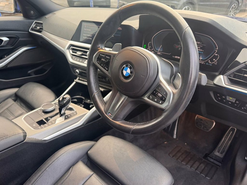 1 Owner. BMW 3 Series with SAT NAV, HEATED SEATS, and PARKING ASSISTANT. Enjoy the drive! Call now for a test drive! M SPORT PACKAGE, LED LIGHTS, and BLUETOOTH. Don't miss out! Call us today! 1 Owner BMW 3 Series with 62000 Miles. Full main dealer service history adds peace of mind to this stylish saloon. This BMW 3 Series is an automatic, offering effortless driving. Benefit from features like satellite navigation, heated seats, and parking assistant, enhancing every journey. The car boasts over £6,560 of optional extras, representing excellent value. Perfect for those seeking comfort and advanced technology in their driving experience. A fantastic car for all car buyers. FACTORY UPGRADE FITTED EXTRAS - VALUE = £6,560 • 19in Alloy Wheels - M Light Double Spoke - 791M Bicolour Jet Black with Mixed Tyres and Runflat Tyres • M Sport Pro Package • Run Flat Tyres • Sun Protection Glazing • Technology Package • Portimao Blue • Enhanced Bluetooth with Wireless Charging • Loudspeaker System - Harman Kardon • Vernasca Leather - Black with Grey Stitching KEY FEATURES & SPECIFICATION • 12V Power Socket in Front Storage Compartment • Alarm System - Thatcham 1 with Remote Control and Electronic Engine Immobiliser • M Leather Steering Wheel • Acoustic Glazing • Active Air Stream Kidney Grille • Active Guard Plus • Air Conditioning - Automatic with Three-Zone • Airbags • Ambie M Sport Pro Package, Technology Package, 12V Power Socket in Front Storage Compar, Loudspeaker System - Harman Kardon, Sun Protection Glazing, 19in Alloy Wheels - M Light Double Spoke, Portimao Blue, Enhanced Bluetooth with Wireless Chargin, Alarm System - Thatcham 1 with Remote Co, M Leather Steering Wheel, Acoustic Glazing, Active Air Stream Kidney Grille, Active Guard Plus, Air Conditioning - Automatic with Three-, Airbags, Ambient Lighting with Welcome Light Carp, Armrest - Integrated in Door Trim Front , Armrest - Rear Centre with Two Cupholder, Attentiveness Assistant, Automatically Dimming Rear View Mirror, Balanced 50-50 Weight Distribution, Battery Safety Cut-Off in the Event of a,