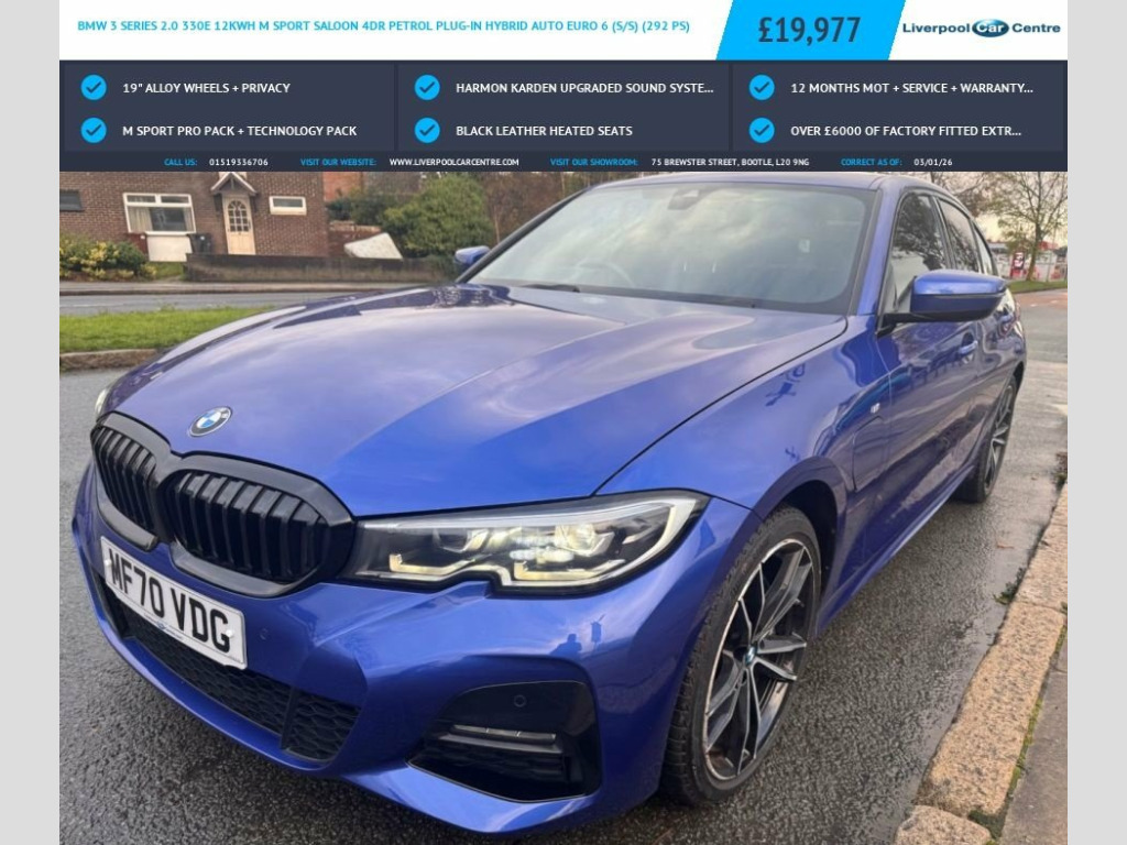 This 2020 BMW 3 Series 2.0 330e 12kWh M Sport Saloon 4dr Petrol Plug-in H Saloon is currently available for £19,900 in Bootle Merseyside with Automatic gearbox. For more information or to arrange a viewing, click here to send us an email using form below.
