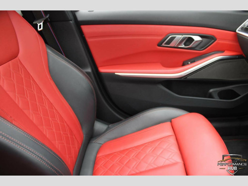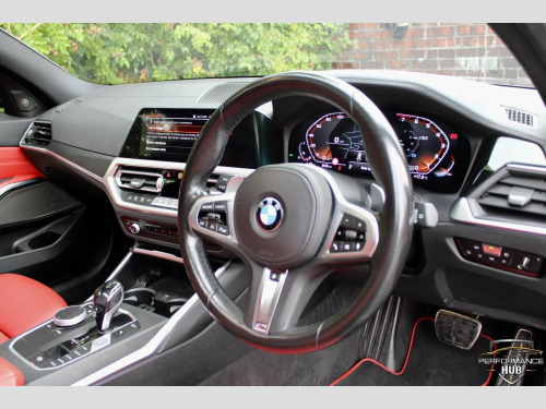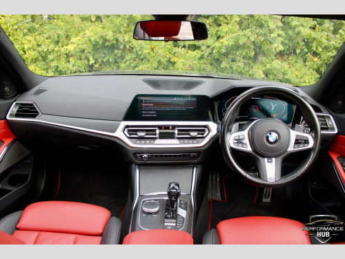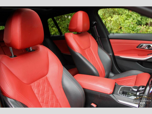 BMW 3 Series 3.0 M340i Touring 5dr Petrol Hybrid Auto xDrive finished in beautiful Grey with Red and Black Vernasca leather interior now in stock. This car has phenomenal spec including, loudspeaker Harmon Kardon sound system, sliding panoramic roof, reverse camera, caring car, dab radio, sat nav, heated seats, m sport wheels, m sport suspension, plus much more