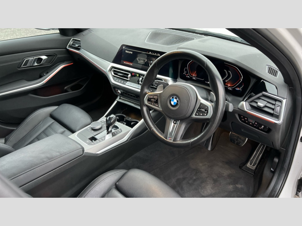 BMW 3 Series 320i M Sport 4dr Step Auto Active guard plus, Attentiveness assist, Auto start-stop, Bluetooth hands free facility with USB audio interface with audio streaming, BMW iDrive controller on centre console, BMW Live Cockpit Professional Nav with 12.3" instrument display + 10.25" display, Intelligent Voice Assist, BMW OS 7, HDD, 2USB, 4G LTE connect, BMW service history, BMW Teleservices, Brake pad wear indicator in front and rear, Check Control warning system for monitoring of lights and door/luggage compartment open warning, Condition based service, Cruise control with brake function + speed limiter, Electric power steering with Servotronic steering optimised at all speed ranges, Instrument cluster with speedometer with mph readout, tachometer, fuel gauge and oil temperature gauge, Integrated owners handbook, Oil sensor for level and grade, warning by check control system, On board computer - average speed+fuel consumption, service interval, clock/date, odometer/trip meter, outside temperature display and ice warning, Optimum shift indicator, Personal Profile - automatic lock when driving away selectable, Variable sport steering, Balanced 50/50 weight distribution, Battery cut-out switch, Drive performance control - ECO PRO, comfort and sport modes, Larger capacity fuel tank, M sport suspension, Petrol Particulate Filter, Stroke dependent dampers, DAB tuner, Electronic service booklet, Stereo speaker system with 2 mid range speakers in the front door trims and rear parcel shelf + 2 central bass speakers underneath the front seats, Acoustic glazing, Active airstream chrome frame kidney grille with 8 high gloss black vertical slats, Automatic headlight beam throw control with load dependent regulating reaction, dynamic compensation of braking dive and acceleration squat, Black roof mouldings, Body colour door handles, Body colour front and rear bumpers, Body colour fuel filler flap, Body colour mirror caps with bottom segment in matt black, Dynamic brake lights, Electric windows - front and rear, with open/close fingertip control, anti-trap facility and comfort closing, Exhaust tailpipe - split left and right, Exterior mirrors - electrically folding with anti-dazzle, Fading support, Front and rear bumper system with replaceable deformation elements, Front black door sill finishers with BMW designation, Green tinted heat protection glazing, High gloss shadow line exterior trim, Interior rear view electrochromatic mirror with automatic anti dazzle function, LED daytime running lights, LED front fog lights, Lightweight engineering, M designation on front side panels, left and right, Matt black exterior B pillar, Model designation on right side of tailgate, Rain sensor with automatic headlight activation, Shark fin antenna, Two part LED tailights in L-shape with components in smoked glass, brake light, LED turn indicator and rear fog light, Visible VIN plate, Welcome lights in interior and door handle area, Windscreen wipers with integrated washing jets, 12V power socket in front storage compartment, 2 front cupholder in centre console with clamping elements and matt black inlay, 3 rear seats with non folding headrests with 3 point seat belts, 3 zone automatic air conditioning, 4 pieces lashing eyelets in luggage compartment, 40:20:40 split folding rear seat with loading system, Ambient lighting with welcome carpet light, Anthracite headlining, Armrest integrated in front and rear door trim + front centre console armrest, Backrest width adjustment, Centred top Luggage compartment lights, Four grab handles integrated in roof lining, Front and rear door exit lighting (left / right), Front and rear door pockets, Front and rear reading lights, Front and rear velour floor mats, Front head restraints, Front sport seats, Heated front seats, Height adjustable mechanically and infinitely variable steering column, Illuminated armrest storage compartment, Illuminated glove compartment with separate small compartment, Interior lighting - front centre over interior mirror with soft light, rear centre and front and rear footwell lighting, M sport leather steering wheel, Make-up mirror lights, Rear centre armrest with 2 cupholders, Rear centre console with storage compartment and ventilation grille, Sunvisors with vanity mirrors and ticket pocket, Toolkit located in luggage compartment, Connected pack professional - 3 Series Saloon/Touring, M sport exterior styling pack - 3 Series Saloon/Touring, Parking assistant pack - 3 Series, 2 tone horn, BMW emergency call, Brake energy regeneration, Braking pre-tensioning, Child proof locking system in rear door, Child seat ISOFIX attachment rear outer seats, Coasting in idle in ECO PRO mode, Crash sensor activating of airbags, Unlocking doors, hazard warning lights, interior light, safety battery terminal, Driver and front passenger side airbags, integrated in the door side seat backrest bolsters for all seat variants, Driver/Front Passenger airbags, Dry braking, Dynamic brake control, Dynamic stability control + (DSC+) - Anti-lock Braking System (ABS) with brake assist and cornering brake control + Automatic Stability Control (ASC), Dynamic Traction Control - DTC, Electric parking brake including automatic hold function and automatic release of the parking brake when driving off, Electronic differential lock control (EDLC), Front passenger manual airbag deactivation, Head airbags for all 4 outer seats, Hill start assist, Seat belt security check for driver and front passenger, Side impact protection, Three 3 point seat belts on all seats including front belt stopper, pyrotechnic belt tensioners and belt force limiters, Tyre pressure monitoring with three level warning strategy, Ventilated front and rear disc brakes, Warning triangle and first aid kit, Alarm system (Thatcham 1) with remote control and electronic engine immobiliser, Central locking switch for all doors, fuel filler cap and luggage compartment, Remote control with integrated key one button op