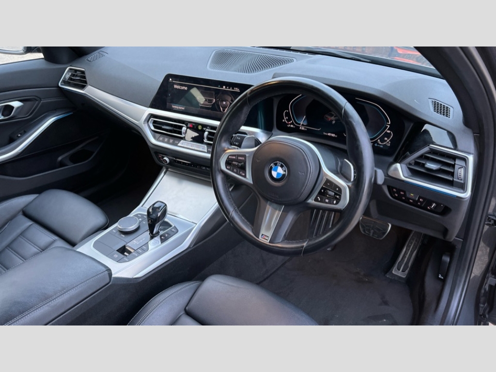 BMW 3 Series 330e M Sport 4dr Step Auto Active guard plus, Attentiveness assist, Auto start-stop, Bluetooth hands free facility with USB audio interface with audio streaming, BMW iDrive controller on centre console, BMW Live Cockpit Professional Nav with 12.3" instrument display + 10.25" display, Intelligent Voice Assist, BMW OS 7, HDD, 2USB, 4G LTE connect, BMW service history, BMW Teleservices, Brake pad wear indicator in front and rear, Check Control warning system for monitoring of lights and door/luggage compartment open warning, Condition based service, Cruise control with brake function + speed limiter, Electric power steering with Servotronic steering optimised at all speed ranges, Instrument cluster with speedometer with mph readout, tachometer, fuel gauge and oil temperature gauge, Integrated owners handbook, Oil sensor for level and grade, warning by check control system, On board computer - average speed+fuel consumption, service interval, clock/date, odometer/trip meter, outside temperature display and ice warning, Optimum shift indicator, Personal Profile - automatic lock when driving away selectable, Balanced 50/50 weight distribution, Battery cut-out switch, Charging cable - Mode 2, Drive performance control - ECO PRO, comfort and sport modes, Petrol Particulate Filter, Stroke dependent dampers, DAB tuner, Electronic service booklet, Stereo speaker system with 2 mid range speakers in the front door trims and rear parcel shelf + 2 central bass speakers underneath the front seats, Acoustic glazing, Active airstream chrome frame kidney grille with 8 high gloss black vertical slats, Automatic headlight beam throw control with load dependent regulating reaction, dynamic compensation of braking dive and acceleration squat, Black roof mouldings, Body colour door handles, Body colour front and rear bumpers, Body colour fuel filler flap, Body colour mirror caps with bottom segment in matt black, Dynamic brake lights, Electric windows - front and rear, with open/close fingertip control, anti-trap facility and comfort closing, Exhaust tailpipe - split left and right, Exterior mirrors - electrically folding with anti-dazzle, Fading support, Front and rear bumper system with replaceable deformation elements, Front black door sill finishers with BMW designation, Green tinted heat protection glazing, High gloss shadow line exterior trim, Interior rear view electrochromatic mirror with automatic anti dazzle function, LED daytime running lights, LED front fog lights, Lightweight engineering, M designation on front side panels, left and right, Matt black exterior B pillar, Model designation on right side of tailgate, Rain sensor with automatic headlight activation, Shark fin antenna, Two part LED tailights in L-shape with components in smoked glass, brake light, LED turn indicator and rear fog light, Visible VIN plate, Welcome lights in interior and door handle area, Windscreen wipers with integrated washing jets, 12V power socket in front storage compartment, 2 front cupholder in centre console with clamping elements and matt black inlay, 3 rear seats with non folding headrests with 3 point seat belts, 3 zone automatic air conditioning, 4 pieces lashing eyelets in luggage compartment, 40:20:40 split folding rear seat with loading system, Ambient lighting with welcome carpet light, Anthracite headlining, Armrest integrated in front and rear door trim + front centre console armrest, Backrest width adjustment, Centred top Luggage compartment lights, Four grab handles integrated in roof lining, Front and rear door exit lighting (left / right), Front and rear door pockets, Front and rear reading lights, Front and rear velour floor mats, Front head restraints, Front sport seats, Heated front seats, Height adjustable mechanically and infinitely variable steering column, Illuminated armrest storage compartment, Illuminated glove compartment with separate small compartment, Interior lighting - front centre over interior mirror with soft light, rear centre and front and rear footwell lighting, M sport leather steering wheel, Make-up mirror lights, Rear centre armrest with 2 cupholders, Rear centre console with storage compartment and ventilation grille, Sunvisors with vanity mirrors and ticket pocket, Toolkit located in luggage compartment, Connected pack professional - 3 Series Saloon/Touring, M sport exterior styling pack - 3 Series Saloon/Touring, 2 tone horn, BMW emergency call, Brake energy regeneration, Braking pre-tensioning, Child proof locking system in rear door, Child seat ISOFIX attachment rear outer seats, Coasting in idle in ECO PRO mode, Crash sensor activating of airbags, Unlocking doors, hazard warning lights, interior light, safety battery terminal, Driver and front passenger side airbags, integrated in the door side seat backrest bolsters for all seat variants, Driver/Front Passenger airbags, Dry braking, Dynamic brake control, Dynamic stability control + (DSC+) - Anti-lock Braking System (ABS) with brake assist and cornering brake control + Automatic Stability Control (ASC), Dynamic Traction Control - DTC, Electric parking brake including automatic hold function and automatic release of the parking brake when driving off, Electronic differential lock control (EDLC), Front passenger manual airbag deactivation, Head airbags for all 4 outer seats, Hill start assist, Seat belt security check for driver and front passenger, Side impact protection, Three 3 point seat belts on all seats including front belt stopper, pyrotechnic belt tensioners and belt force limiters, Tyre pressure monitoring with three level warning strategy, Ventilated front and rear disc brakes, Warning triangle and first aid kit, Alarm system (Thatcham 1) with remote control and electronic engine immobiliser, Central locking switch for all doors, fuel filler cap and luggage compartment, Remote control with integrated key one button open/close vehicle and windows, sole opening of the luggage compartment lid and pani