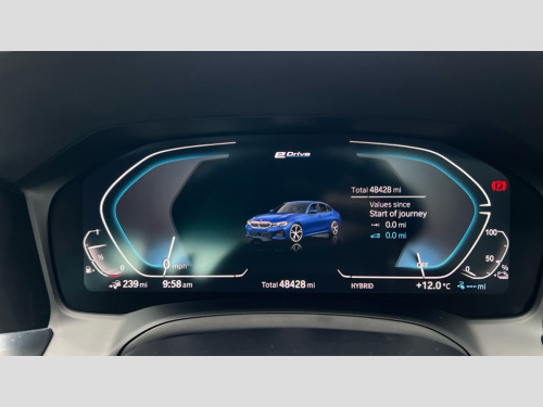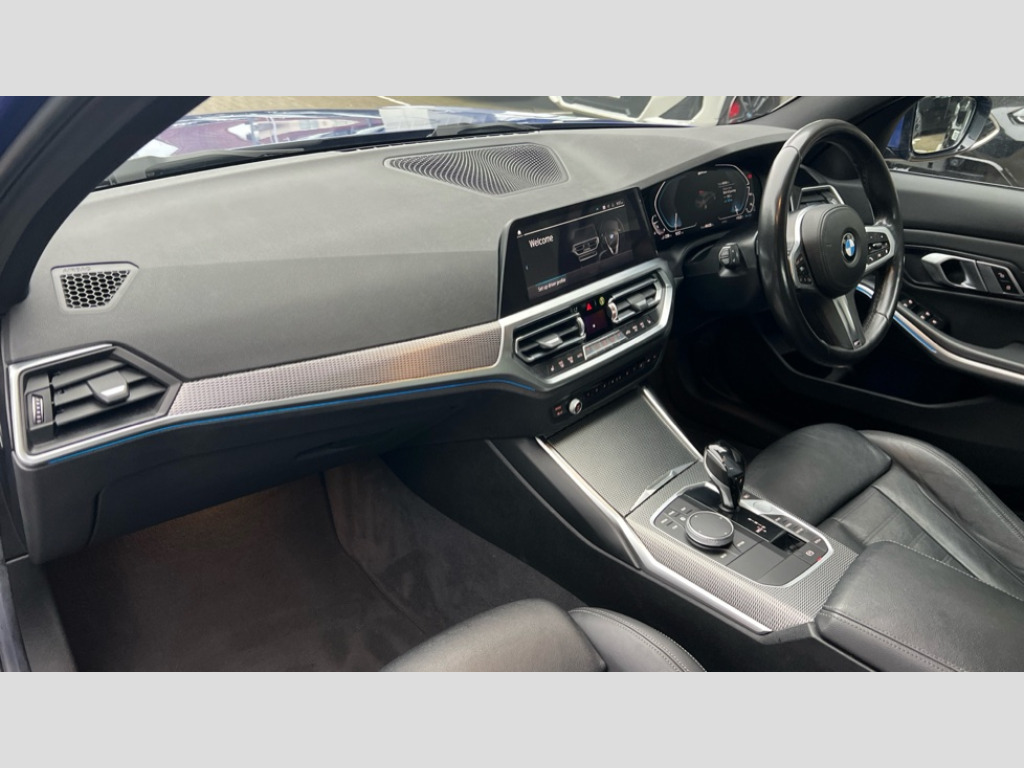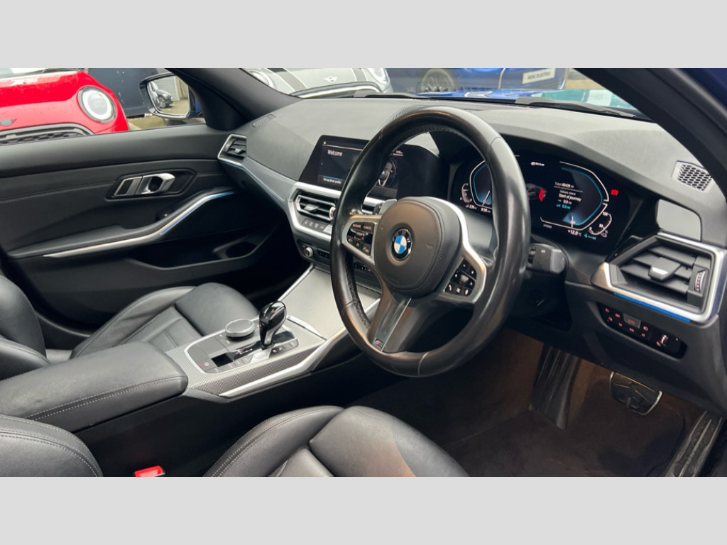 BMW 3 Series 330e M Sport 4dr Step Auto Active guard plus, Attentiveness assist, Auto start-stop, BMW iDrive controller on centre console, BMW Live Cockpit Professional Nav with 12.3" instrument display + 10.25" display, Intelligent Voice Assist, BMW OS 7, HDD, 2USB, 4G LTE connect, BMW service history, BMW Teleservices, Brake pad wear indicator in front and rear, Check Control warning system for monitoring of lights and door/luggage compartment open warning, Condition based service, Electric power steering, Electric power steering with Servotronic steering optimised at all speed ranges, Instrument cluster with speedometer with mph readout, tachometer, fuel gauge and oil temperature gauge, Integrated owners handbook, Oil sensor for level and grade, warning by check control system, On board computer - average speed+fuel consumption, service interval, clock/date, odometer/trip meter, outside temperature display and ice warning, Optimum shift indicator, Personal Profile - automatic lock when driving away selectable, Balanced 50/50 weight distribution, Battery cut-out switch, Drive performance control - ECO PRO, comfort and sport modes, Petrol Particulate Filter, Sport automatic transmission with steering-wheel mounted gearshift paddles and launch control, Stroke dependent dampers, DAB tuner, Electronic service booklet, Acoustic glazing, Automatic headlight beam throw control with load dependent regulating reaction, dynamic compensation of braking dive and acceleration squat, Black roof mouldings, Body colour door handles, Body colour fuel filler flap, Body colour mirror caps, Dynamic brake lights, Electric windows - front and rear, with open/close fingertip control, anti-trap facility and comfort closing, Exhaust tailpipe - split left and right, Exterior mirrors - electrically folding with anti-dazzle, Fading support, Front and rear bumper system with replaceable deformation elements, Front black door sill finishers with BMW designation, Green tinted heat protection glazing, High gloss shadow line exterior trim, Interior rear view electrochromatic mirror with automatic anti dazzle function, LED daytime running lights, LED front fog lights, Lightweight engineering, M designation on front side panels, left and right, Matt black exterior B pillar, Model designation on right side of tailgate, Rain sensor with automatic headlight activation, Shark fin antenna, Two part LED tailights in L-shape with components in smoked glass, brake light, LED turn indicator and rear fog light, Visible VIN plate, Welcome lights in interior and door handle area, Windscreen wipers with integrated washing jets, 12V power socket in front storage compartment, 2 front cupholder in centre console with clamping elements and matt black inlay, 3 rear seats with non folding headrests with 3 point seat belts, 3 zone automatic air conditioning, 4 pieces lashing eyelets in luggage compartment, 40:20:40 split folding rear seat with loading system, Ambient lighting with welcome carpet light, Anthracite headlining, Armrest integrated in front and rear door trim + front centre console armrest, Centred top Luggage compartment lights, Four grab handles integrated in roof lining, Front and rear door exit lighting (left / right), Front and rear door pockets, Front and rear reading lights, Front and rear velour floor mats, Front head restraints, Front sport seats, Heated driver and front passenger seats, Height adjustable mechanically and infinitely variable steering column, Illuminated armrest storage compartment, Illuminated glove compartment with separate small compartment, Interior lighting - front centre over interior mirror with soft light, rear centre and front and rear footwell lighting, M Sport multifunction leather steering wheel, Make-up mirror lights, Rear centre armrest with 2 cupholders, Rear centre console with storage compartment and ventilation grille, Sunvisors with vanity mirrors and ticket pocket, Toolkit located in luggage compartment, Connected pack professional - 3 Series Saloon/Touring, M Aerodynamics pack - 3 Series Saloon/Touring, 2 tone horn, BMW emergency call, Brake energy regeneration, Braking pre-tensioning, Child proof locking system in rear door, Child seat ISOFIX attachment rear outer seats, Coasting in idle in ECO PRO mode, Crash sensor activating of airbags, Unlocking doors, hazard warning lights, interior light, safety battery terminal, Driver and front passenger side airbags, integrated in the door side seat backrest bolsters for all seat variants, Driver/Front Passenger airbags, Dry braking, Dynamic brake control, Dynamic stability control + (DSC+) - Anti-lock Braking System (ABS) with brake assist and cornering brake control + Automatic Stability Control (ASC), Dynamic Traction Control - DTC, Electric parking brake including automatic hold function and automatic release of the parking brake when driving off, Electronic differential lock control (EDLC), Front passenger manual airbag deactivation, Head airbags for all 4 outer seats, Hill start assist, Seat belt security check for driver and front passenger, Side impact protection, Three 3 point seat belts on all seats including front belt stopper, pyrotechnic belt tensioners and belt force limiters, Tyre pressure monitoring with three level warning strategy, Ventilated front and rear disc brakes, Warning triangle and first aid kit, Alarm system (Thatcham 1) with remote control and electronic engine immobiliser, Central locking switch for all doors, fuel filler cap and luggage compartment, Remote control with integrated key one button open/close vehicle and windows, sole opening of the luggage compartment lid and panic mode, Start/stop button with Comfort Go keyless engine start and auto Start/stop deactivation button, Vehicle key with M specific designation, Reduced rolling resistance tyres