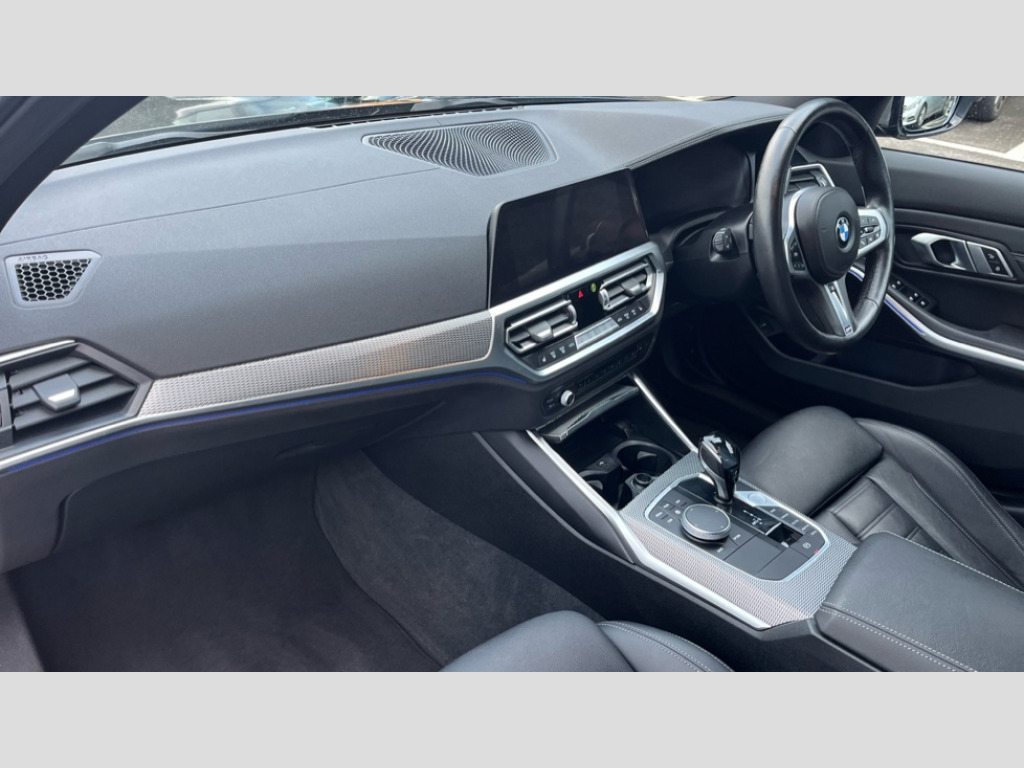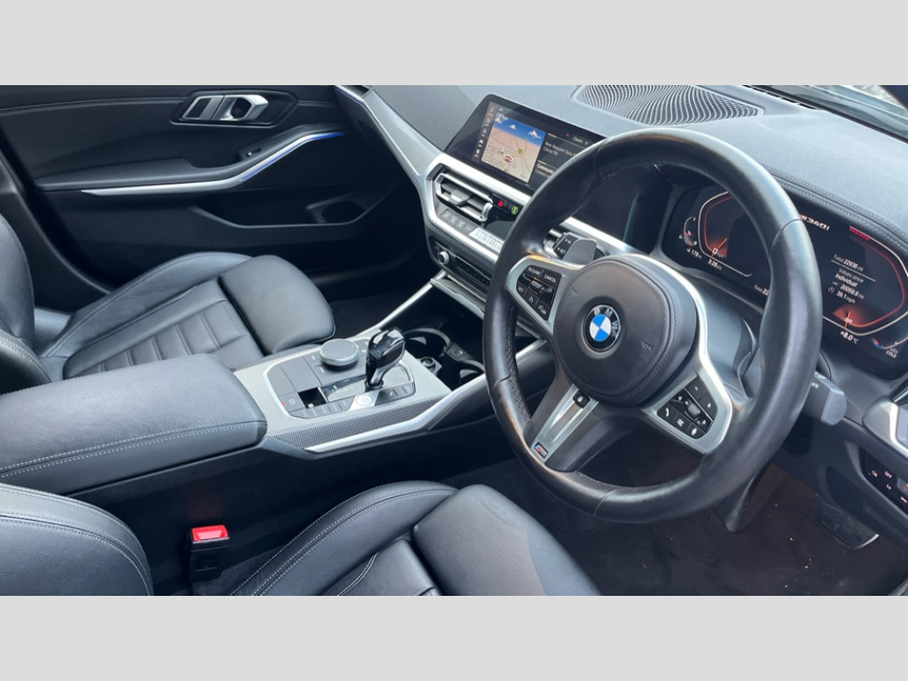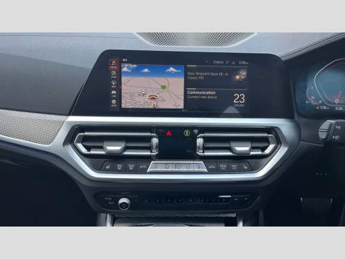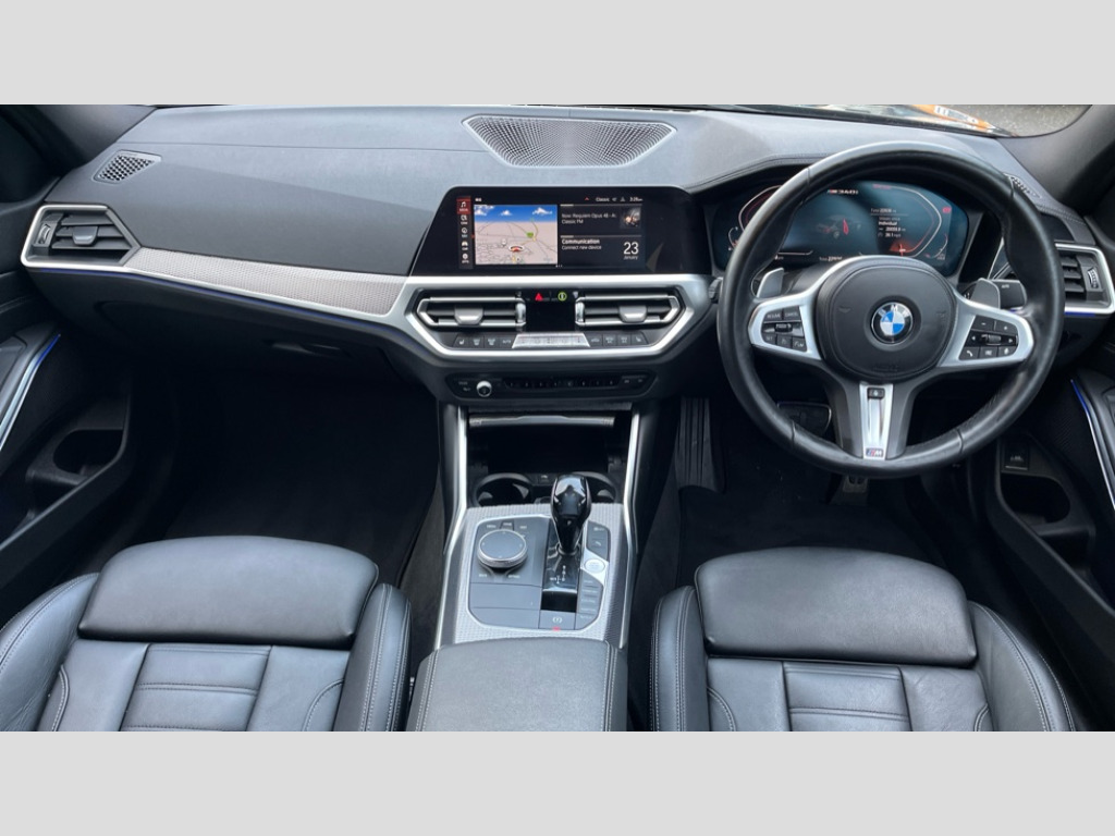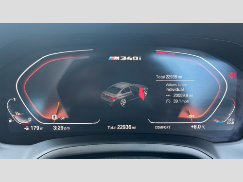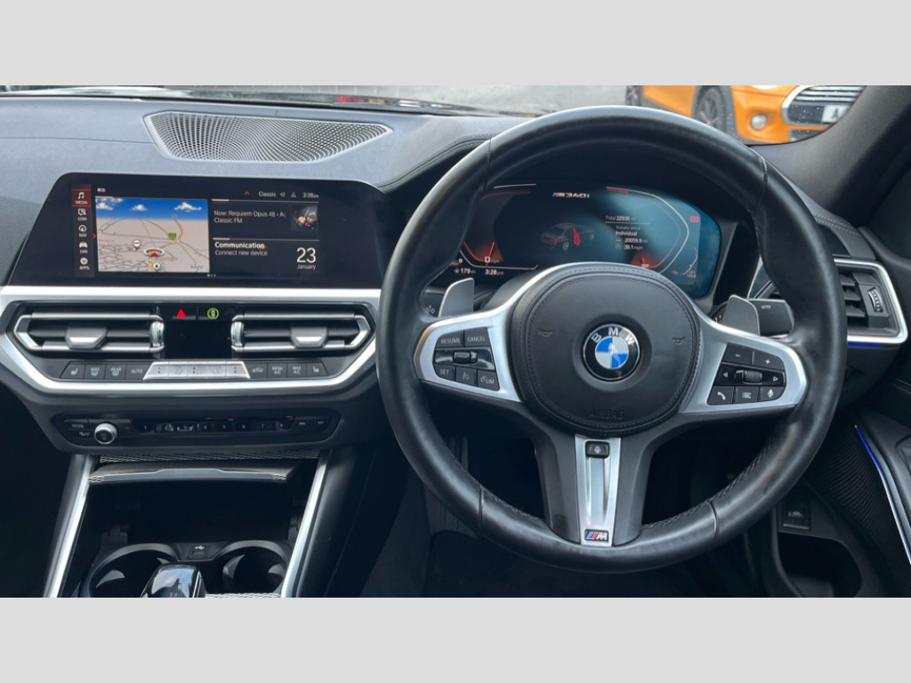 BMW 3 Series M340i xDrive MHT 4dr Step Auto Active guard plus, Attentiveness assist, Bluetooth hands free facility with USB audio interface with audio streaming, BMW iDrive controller on centre console, BMW Live Cockpit Professional Nav with 12.3" instrument display + 10.25" display, Intelligent Voice Assist, BMW OS 7, HDD, 2USB, 4G LTE connect, BMW service history, BMW Teleservices, Brake pad wear indicator in front and rear, Check Control warning system for monitoring of lights and door/luggage compartment open warning, Condition based service, Cruise control with brake function + speed limiter, Electric power steering with Servotronic steering optimised at all speed ranges, Instrument cluster with speedometer with mph readout, tachometer, fuel gauge and oil temperature gauge, Integrated owners handbook, Oil sensor for level and grade, warning by check control system, On board computer - average speed+fuel consumption, service interval, clock/date, odometer/trip meter, outside temperature display and ice warning, Optimum shift indicator, Personal Profile - automatic lock when driving away selectable, Variable sport steering, 48V Mild hybrid technology, Adaptive M suspension, Balanced 50/50 weight distribution, Battery cut-out switch, Drive performance control - ECO PRO, comfort and sport modes, Larger capacity fuel tank, M Sport differential, Petrol Particulate Filter, Stroke dependent dampers, DAB tuner, Electronic service booklet, 2 x square exhaust tailpipes, Acoustic glazing, Active airstream chrome frame kidney grille with 8 high gloss black vertical slats, Automatic headlight beam throw control with load dependent regulating reaction, dynamic compensation of braking dive and acceleration squat, Black roof mouldings, Body colour door handles, Body colour front and rear bumpers, Body colour fuel filler flap, Dynamic brake lights, Electric windows - front and rear, with open/close fingertip control, anti-trap facility and comfort closing, Exterior mirrors - electrically folding with anti-dazzle, Fading support, Front and rear bumper system with replaceable deformation elements, Front black door sill finishers with BMW designation, Green tinted heat protection glazing, High gloss shadow line exterior trim, Interior rear view electrochromatic mirror with automatic anti dazzle function, LED daytime running lights, LED front fog lights, Lightweight engineering, M designation on front side panels, left and right, M Sport spoiler, Matt black exterior B pillar, Model designation on right side of tailgate, Rain sensor with automatic headlight activation, Shark fin antenna, Sun protection glass, Two part LED tailights in L-shape with components in smoked glass, brake light, LED turn indicator and rear fog light, Visible VIN plate, Welcome lights in interior and door handle area, Windscreen wipers with integrated washing jets, xDrive designation on left tailgate, 12V power socket in front storage compartment, 2 front cupholder in centre console with clamping elements and matt black inlay, 3 rear seats with non folding headrests with 3 point seat belts, 3 zone automatic air conditioning, 4 pieces lashing eyelets in luggage compartment, 40:20:40 split folding rear seat with loading system, Ambient lighting with welcome carpet light, Anthracite headlining, Armrest integrated in front and rear door trim + front centre console armrest, Backrest width adjustment, Centred top Luggage compartment lights, Four grab handles integrated in roof lining, Front and rear door exit lighting (left / right), Front and rear door pockets, Front and rear reading lights, Front and rear velour floor mats, Front head restraints, Heated front seats, Height adjustable mechanically and infinitely variable steering column, Illuminated armrest storage compartment, Illuminated glove compartment with separate small compartment, Interior lighting - front centre over interior mirror with soft light, rear centre and front and rear footwell lighting, M sport leather steering wheel, Make-up mirror lights, Rear centre armrest with 2 cupholders, Rear centre console with storage compartment and ventilation grille, Sunvisors with vanity mirrors and ticket pocket, Toolkit located in luggage compartment, Connected pack professional - 3 Series Saloon/Touring, M sport exterior styling pack - 3 Series Saloon/Touring, 2 tone horn, BMW emergency call, Brake energy regeneration, Braking pre-tensioning, Child proof locking system in rear door, Child seat ISOFIX attachment rear outer seats, Coasting in idle in ECO PRO mode, Crash sensor activating of airbags, Unlocking doors, hazard warning lights, interior light, safety battery terminal, Driver and front passenger side airbags, integrated in the door side seat backrest bolsters for all seat variants, Driver/Front Passenger airbags, Dry braking, Dynamic brake control, Dynamic stability control + (DSC+) - Anti-lock Braking System (ABS) with brake assist and cornering brake control + Automatic Stability Control (ASC), Dynamic Traction Control - DTC, Electric parking brake including automatic hold function and automatic release of the parking brake when driving off, Front passenger manual airbag deactivation, Head airbags for all 4 outer seats, Hill start assist, M sport seatbelt, Seat belt security check for driver and front passenger, Side impact protection, Three 3 point seat belts on all seats including front belt stopper, pyrotechnic belt tensioners and belt force limiters, Tyre pressure monitoring with three level warning strategy, Ventilated front and rear disc brakes, Warning triangle and first aid kit, Alarm system (Thatcham 1) with remote control and electronic engine immobiliser, Central locking switch for all doors, fuel filler cap and luggage compartment, Remote control with integrated key one button open/close vehicle and windows, sole opening of the luggage compartment lid and panic mode, Start/stop button with Comfort Go keyless engine start and auto Start/stop deactivation butto