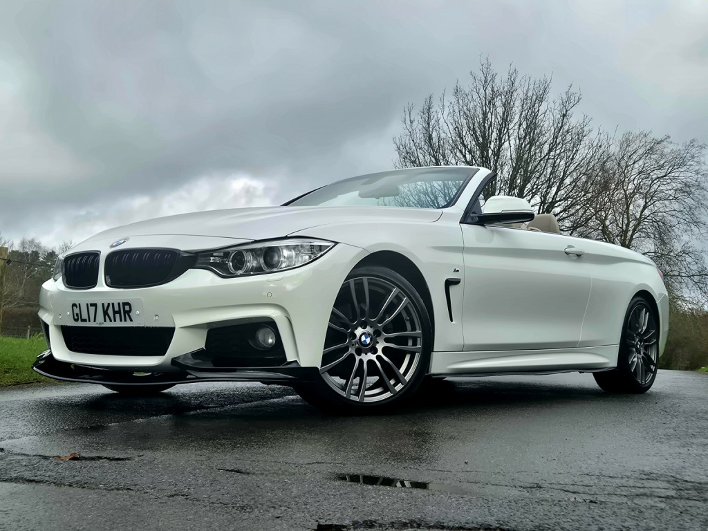 2017 BMW 320d M Sport Convertible Automatic, finished in Alpine White with Ivory Dakota leather interior, covering 55,000 miles. , This example is further enhanced with a full gloss black M Performance exterior styling kit, complementing the Alpine White paintwork perfectly. , Specification highlights include Professional Media package with widescreen satellite navigation, DAB digital radio, LED headlights and LED tail lights, electrically operated folding hardtop, M Sport exterior styling, automatic transmission, dual-zone climate control, cruise control, Bluetooth phone and audio streaming, front and rear parking sensors, and multi-function leather steering wheel. , It sits on unmarked 19 M Sport alloy wheels finished in Cerium Grey Satin and is presented in excellent condition throughout. , Supplied with full service history, 2 keys, and MOT through to February 2027.