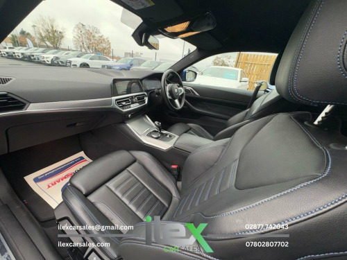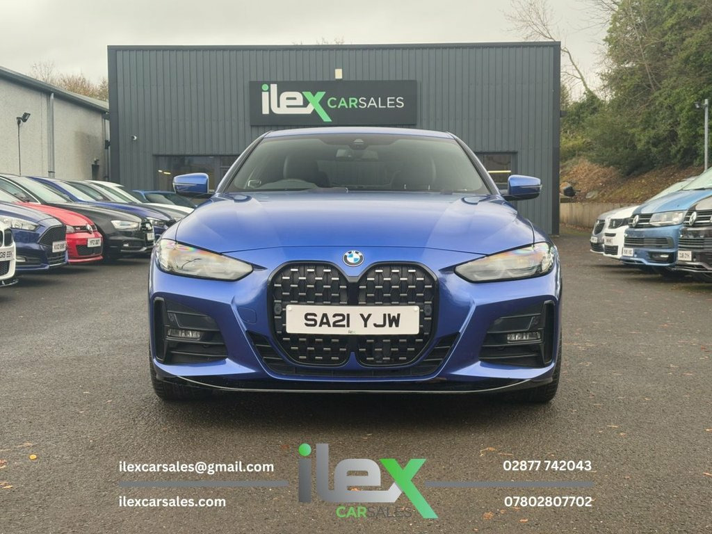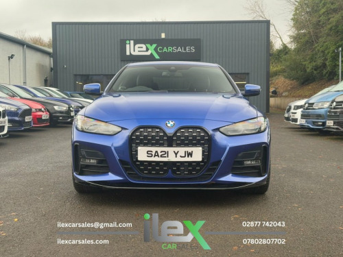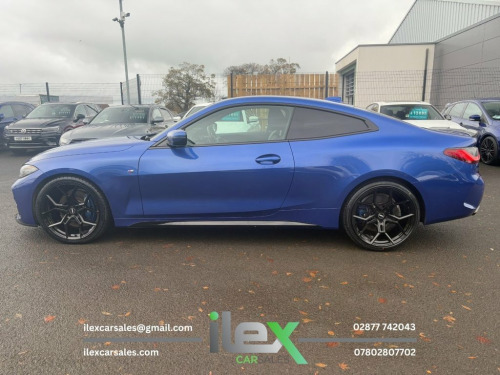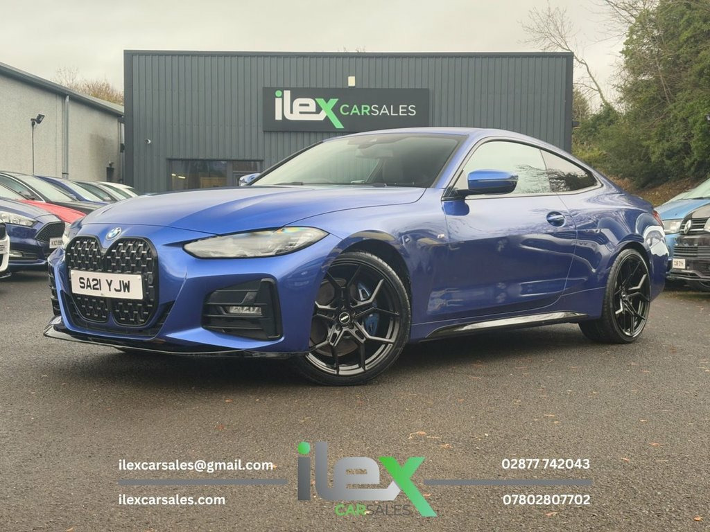 2021 BMW 4 Series 2.0 420d MHT M Sport Auto xDrive Performance, precision, and presence — this stunning Portimao Blue 420d M Sport Coupe blends power and efficiency with BMW's latest mild-hybrid tech and intelligent xDrive grip. A true driver's car with serious style. Highlights: 2.0 MHT Diesel Hybrid | Auto | xDrive AWD 190BHP | Only 19,204 Miles M Sport Pro Package | Full M Performance kit | Shadowline Trim 20" Alloy Upgrade (£995 Optional Extra) Heated Vernasca Leather Sports Seats BMW Live Cockpit Professional | DAB | Bluetooth Ambient Lighting | 3-Zone Climate Control M Sport Brakes | LED Headlights | Sun Protection Glass Cruise Control with Brake Assist | Parking Assistant Price: £31,995 416 Ballyquin Road, Dungiven, Co. Derry 02877 742043 | 07802 807702 www.ilexcarsales.co.uk 12V Power Socket in Front Centre Console, 18in Alloy Wheels - Double Spoke Style -, 2 Headrests - Non-Folding - Rear, 2 Three-Point Seat Belts - Outer, 48v System, Active Guard Plus, Air Conditioning - Automatic with Three-, Airbags, Alarm System - Thatcham 1 with Remote Co, Ambient Lighting, Armrest - Integrated in Door Trim Front , Attentiveness Assistant, Automatic Lock when Driving Away Selecta, Battery Safety Cut-Off in the Event of a, Bluetooth Hands-Free Facility with USB A, BMW Connected Package Professional, BMW ConnectedDrive Online Services, BMW Emblem on Engine Compartment Lid and, BMW Emergency Call, BMW Individual Lights - Shadowline, BMW Kidney Grille with Mesh Grille - Fro, B