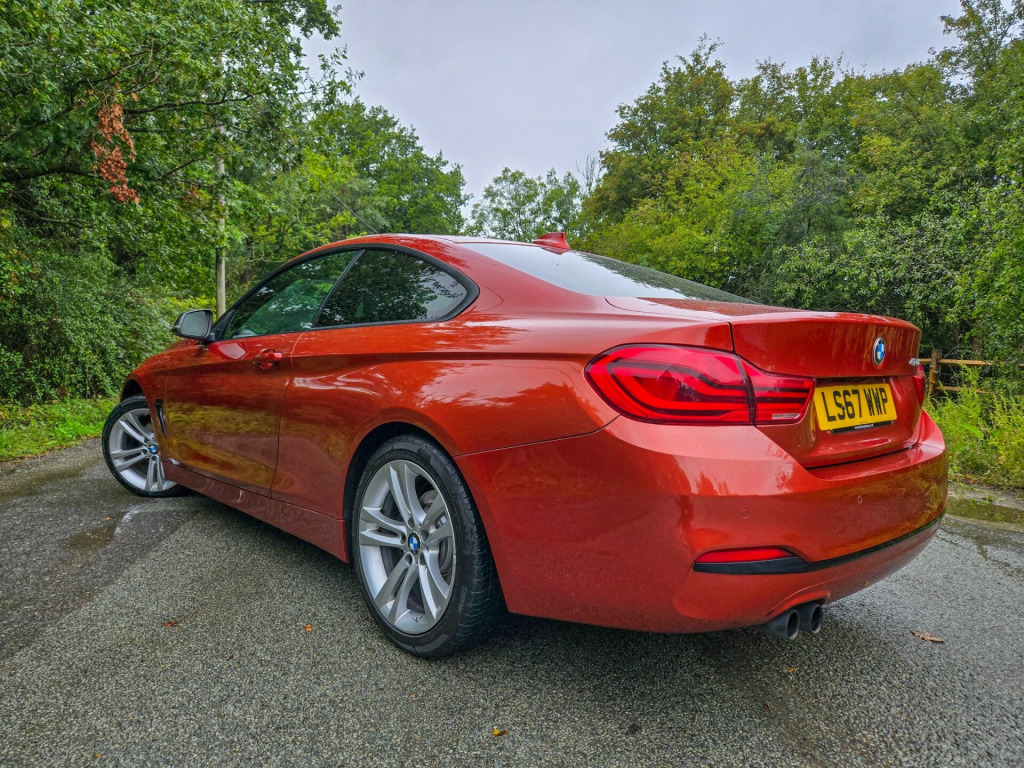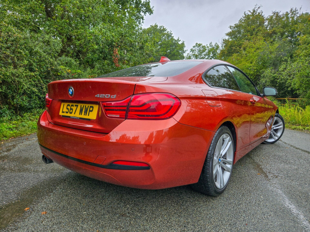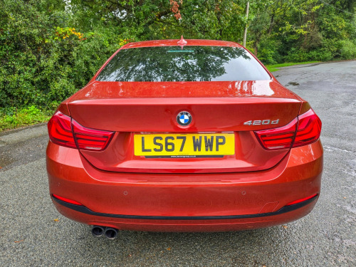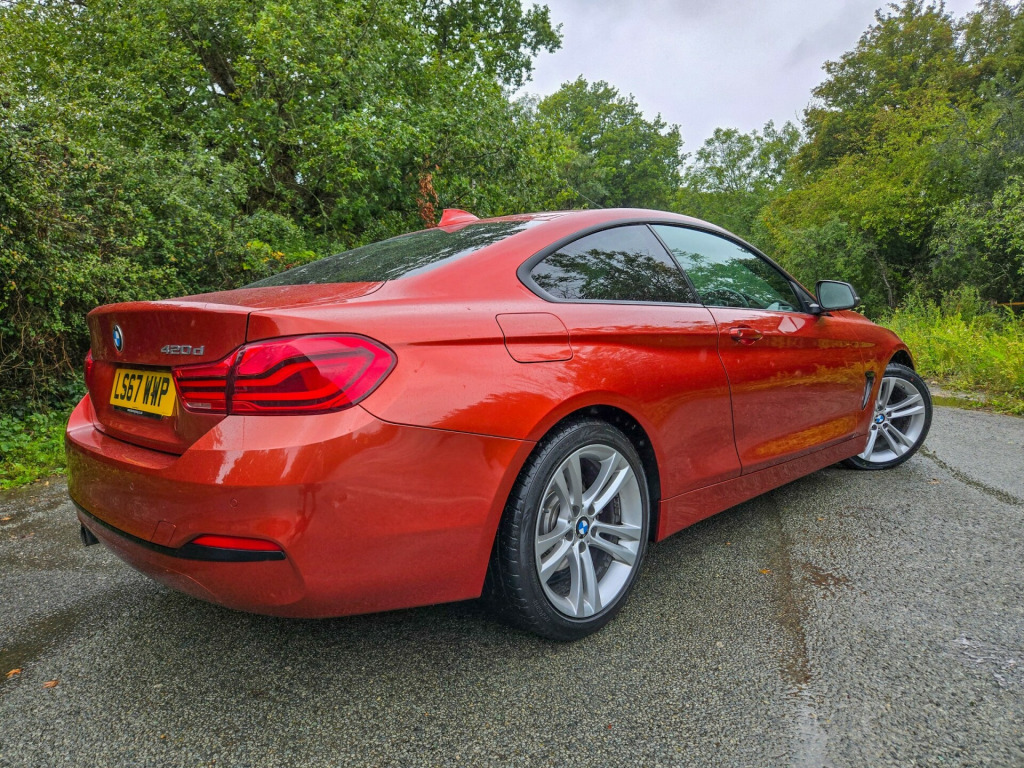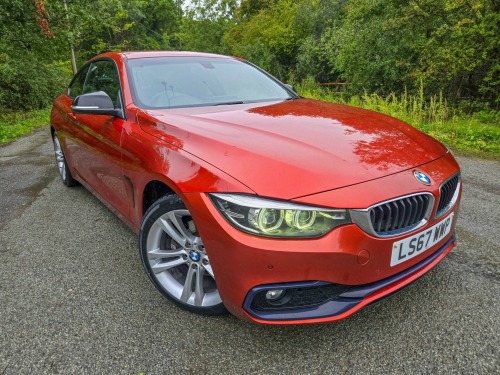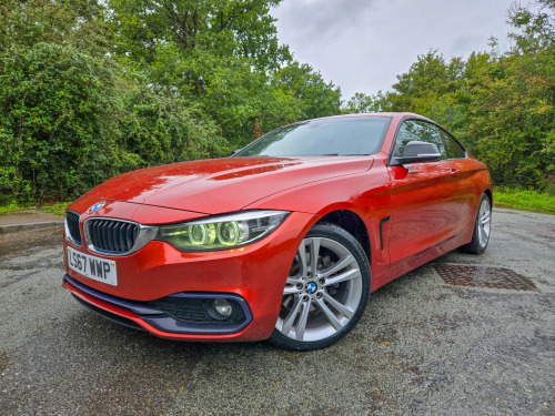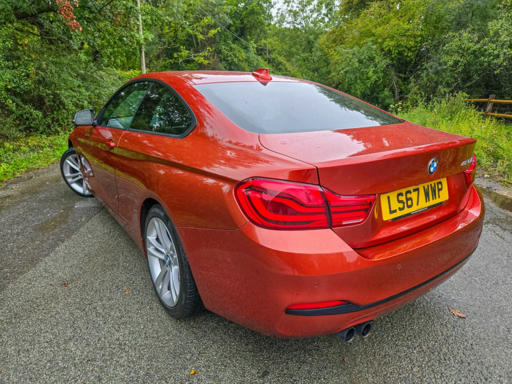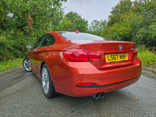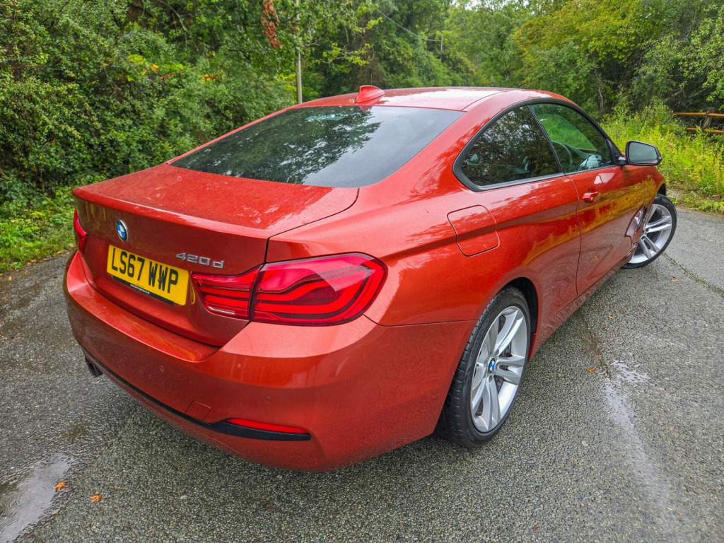 This 2017 BMW 4 Series 2.0 420d Sport Coupe with 107000 miles on the clock is a stylish and efficient choice for those looking for a diesel option. With 4 seats and 2 doors, this coupe is not only sleek but practical as well. It is ULEZ compliant and comes with an MOT that expires on 30/05/2026, giving you peace of mind. The Sunset Orange color and black high gloss mirror caps set it apart from the rest, while features such as exterior mirrors that electrically fold, sun protection glazing, and comfort access with smart opener make this vehicle a pleasure to drive. With a powerful 190 ps engine and automatic transmission, this BMW is ready to hit the road in style., v power socket in front centre console and passenger footwell, 6.5in colour display screen, bmw connecteddrive online services, bmw emergency call, bmw navigation system, bmw professional radio with single cd player - with mp3 playback compatibility, bmw teleservices, bluetooth hands-free facility with usb audio interface and audio streaming, dab digital radio, media package - bmw business, real time traffic information, shark fin, 18in alloy wheels - double spoke - 397, air breather - black high gloss, direction indicator - side repeaters - integrated in exterior mirrors, direction indicator lenses - led, electric windows - front with open-close fingertip control - anti-trap facility and comfort closing function, exhaust tailpipes - dual left - with dark chrome finisher, exterior mirrors - heated - electrically adjustable, exterior parts in body colour, exterior trim - high-gloss black, front air inlet with high-gloss black finisher, heat protection glazing with green tint, kidney grille - chrome with extra wide black - high gloss vertical slats, model designation, rear bumper with high-gloss black finisher, run flat tyres, tyres - reduced rolling resistance, windscreen washer jets - heated, windscreen with grey shade band, air conditioning - automatic with two-zone control, air conditioning and radio control panel in high gloss black, ambient lighting - switchable bmw classic orange - cold white - led, armrest - front - folding with storage compartment, bottle holders integrated into door trim storage compartments - front - up to 1 litre, central locking switch - doors - fuel filler cap - luggage compartment, centre armrest for rear seats - include two cup holders, centre console - panel highlight in chrome, cup holders - two in front with sliding lid, door sill finishers - neutral bmw designation - front, extended lighting, floor mats - velour, glove compartment, glove compartment - opener with chrome trim, handbrake lever - gear knob in leather, instrument cluster, integrated rear seat headrests - two, interior lighting - front centre over interior mirror with soft-light and rear centre, interior trim - black high-gloss trim finishers with coral red matt highlight, luggage compartment - lashing eyes, luggage compartment - light, non smoker package, personal profile, rain sensor with automatic headlight activation, seat heating for driver and front passenger, seatbelt handover for driver and front passenger - automatic, seats - 60-40 split folding rear, side armrests - front and rear integrated into door trim, sport instrument cluster with red highlight and chrono scale, sport multi-function leather steering wheel - three-spoke, sport seats - front, start-stop button with comfort go keyless engine start and auto start-stop deactivation button, steering column with manual reach and rake adjustment, storage compartment in rear centre console, sun visors with vanity mirrors and ticket holder, toolkit located in luggage compartment, trim designation deletion, twin horns, welcome light, windscreen wipers - two-speed with adjustable intervals, airbags, alarm system - thatcham 1 with remote control and engine immobiliser, battery safety cut off, bumper system front and rear - replaceable deformation elements for impacts up to 9mph, child seat isofix attachment - rear with passenger airbag deactivation, crash sensor, dsc - dynamic stability control plus, dynamic brake lights, first aid kit and warning triangle, incorrect fuelling protection system, remote control with integrated key with insert in red, seat belt security check for driver, side impact protection, three-point seat belts - all seats, visible vin, brake pad wear indicator - front and rear, condition based service, cruise control with brake function, drive performance control with eco pro - comfort and sport modes, eps - electric power steering, obc - on-board computer, oil sensor for level and grade - warning by check control system, optimum shift indicator, pdc - park distance control - front and rear, rear suspension - five-link, servotronic steering, suspension - front aluminium, tyre pressure monitor with a three-level warning strategy, idrive controller - 8 favourite buttons, check control warning system for monitoring of lights and door-luggage compartment open warning, high level third brake light, led front foglights, led headlights, led tailights, lights-on warning by audio warning signal when ignition is switched off