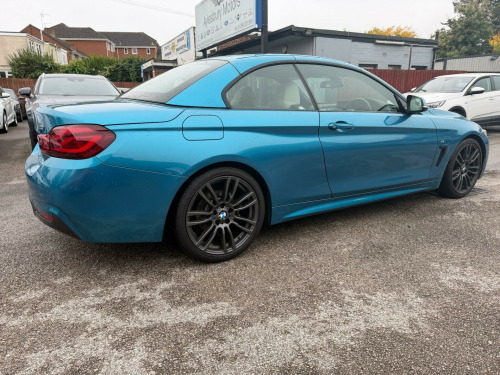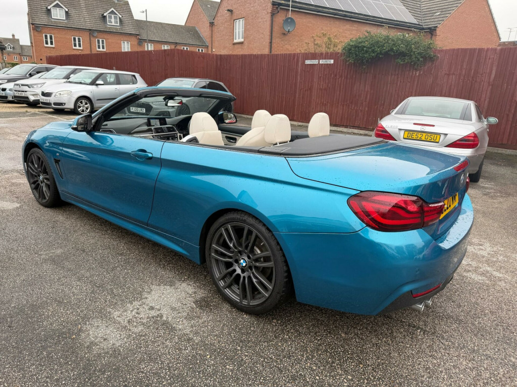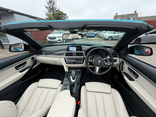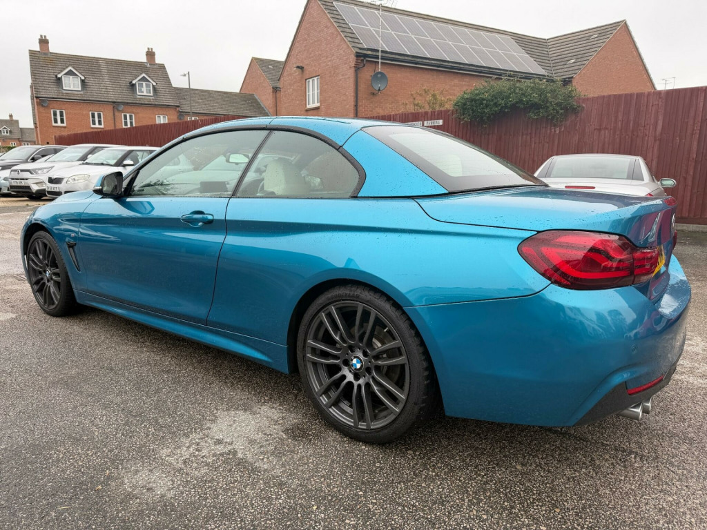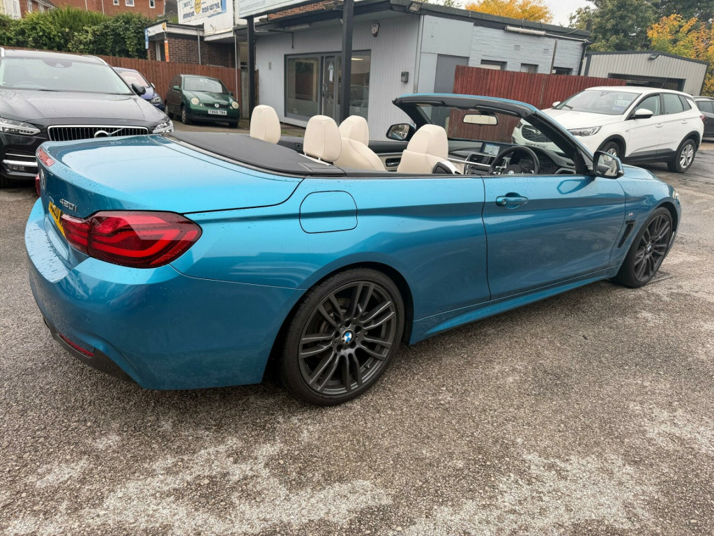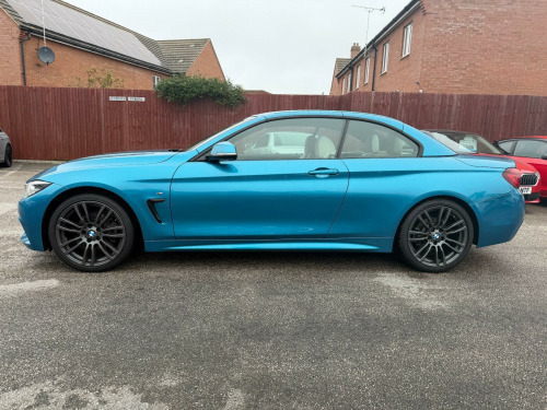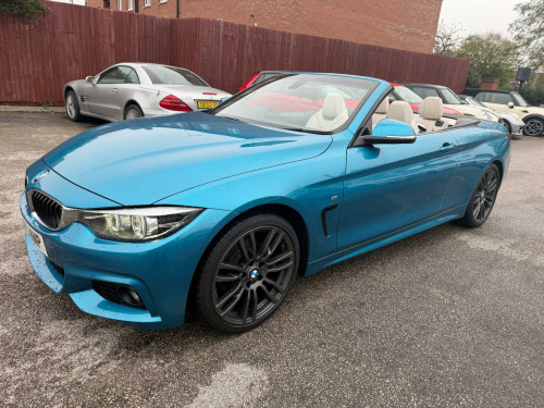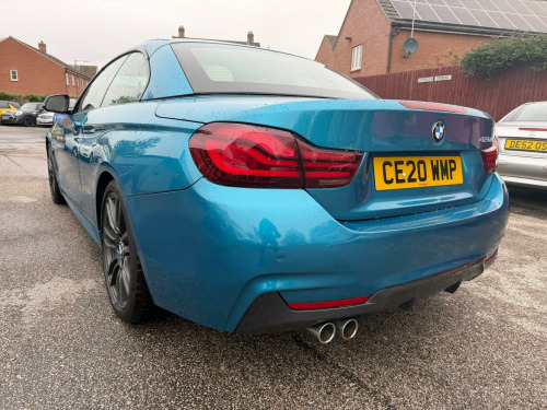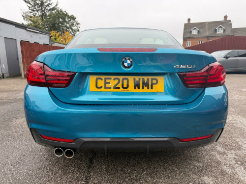 Full BMW Service History, Covertable Comfort Package, Naviagtion, Sports Gearbox, Warranted Low Mileage, HPi Clear, Spare KeyFull BMW Service History, Navigation, Heated Seats and Neck Scarf, Parking Sensors, Warranted Low Mileage, HPi Clear, Spare KeyThis 2020 BMW 4 Series 420i M Sport convertible presents an exceptional opportunity with its remarkably low mileage of just 19,000 miles. This Euro 6 compliant model boasts a 2.0 litre petrol engine and is finished in the sporty M Sport trim. It features striking 19 inch M Star Spoke alloy wheels, a premium Harman Kardon loudspeaker system for an immersive audio experience, and the Convertible Comfort Package which includes a heated steering wheel for those cooler drives. Inside, the cabin is enhanced by Fineline Anthracite wood trim with a sophisticated pearl chrome highlight, further complementing the heated steering wheel.The low CO2 emissions for this vehicle highlight its efficiency, making it a more environmentally conscious choice within its class. The combination of the powerful yet economical 2.0 litre engine, the luxurious M Sport appointments, and the advanced sound system clearly sets this BMW 4 Series apart from other similar vehicles. This particular example offers a compelling blend of performance, comfort, and advanced features, all presented with very low mileage for its age. nvertible comfort package, 19in alloy wheels - m star spoke - 403m, loudspeaker system - harman kardon, exterior mirrors - electrically folding with anti dazzle, steering wheel - heated, interior trim - fineline anthracite wood trim finishers with pearl chrome highlight, dakota leather - ivory white with black interior, 12v power socket in front centre console and passenger footwell, 18in alloy wheels - m double spoke - 400m, access to bmw connected plus (12 month subscription from new), air breather - black high gloss, air conditioning automatic with two-zone control, air conditioning and radio control panel in high gloss black, airbags, alarm system - thatcham 1 with remote control and engine immobiliser, ambient lighting - switchable bmw classic orange - cold white - led, armrest - front - folding with storage compartment, bmw connecteddrive online services, bmw emergency call, bmw professional radio with single cd player - with mp3 playback compatibility, bmw teleservices, battery safety cut off, bluetooth hands-free facility with usb audio interface and audio streaming, boot lid lock with soft close function, bottle holders integrated into door trim storage compartments - front - up to 1 litre, brake pad wear indicator - front and rear, bumper system front and rear - replaceable deformation elements for impacts up to 9mph, central locking switch - doors - fuel filler cap - luggage compartment, centre console - panel highlight in chrome, check control warning system for monitoring of lights and door-luggage compartment open warning, child seat isofix attachment - rear with passenger airbag deactivation, condition based service, crash sensor, cruise control with brake function, cup holders - two in front with sliding lid, dab digital radio, dsc - dynamic stability control plus, direction indicator - side repeaters - integrated in exterior mirrors, direction indicator lenses - led, door sill finishers - m designation, dynamic brake lights, eps - electric power steering, electric windows - front with open-close fingertip control - anti-trap facility and comfort closing function, exhaust tailpipes - dual left - with chrome finisher, extended lighting, exterior mirrors - heated - electrically adjustable, exterior parts in body colour, exterior trim - high-gloss shadowline, first aid kit and warning triangle, floor mats - velour, full black panel display, glove box, handbrake lever - gear knob in leather, heat protection glazing with green tint, high level third brake light, instrument cluster, interior lighting - front centre over interior mirror with soft-light and rear centre, interior trim - aluminium hexagon trim finishers with estoril blue matt highlight, kidney grille - chrome with extra wide black - high gloss vertical slats, led front foglights, led headlights, led taillights with new 3d l-shaped led light design, lights-on warning by audio warning signal when ignition is switched off, loading aid, luggage compartment - lashing eyes, luggage compartment - light, m aerodynamic bodystyling, m sport instrument cluster, m sport multi-function leather steering wheel - three-spoke, m sport package, m sport suspension, model designation, navigation system - bmw professional multimedia, non smokers package, obc - on-board computer, oil sensor for level and grade - warning by check control system, optimum shift indicator, pdc - park distance control - front and rear, personal profile, rain sensor with automatic headlight activation, real time traffic information, rear seat headrests - two, rear suspension - five-link, remote control including integrated key - 2, remote control with integrated key with insert in blue, remote services, roof - retractable hard top, run flat tyres, seat adjustment - front electric with driver memory, seat belt security check for driver, seat heating for driver and front passenger, servotronic steering, shark fin, side armrests - front and rear integrated into door trim, side exterior m designation badges, side impact protection, sport automatic transmission, sport seats - front, start-stop button with comfort go keyless engine start and auto start-stop deactivation button, steering column with manual reach and rake adjustment, storage compartment - behind rear seat backrest, storage compartment in rear seat base centre, sun visors with vanity mirrors and ticket holder, suspension - front aluminium, three-point seat belts - all seats, toolkit located in luggage compartment, twin horns, tyre pressure monitor with a three-level warning strategy, tyres - reduced rolling resistance, visible vin, welcome light, windscreen washer j